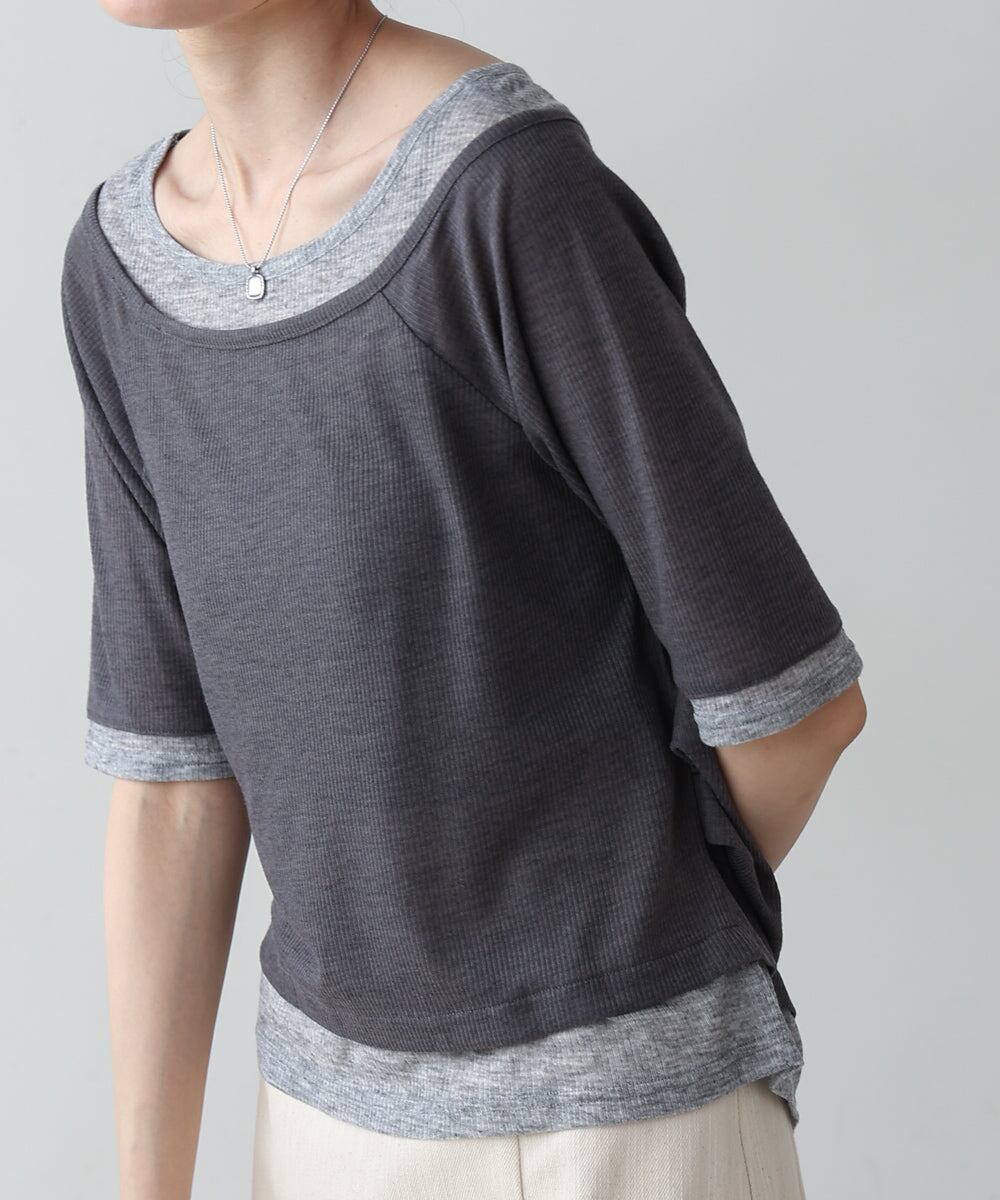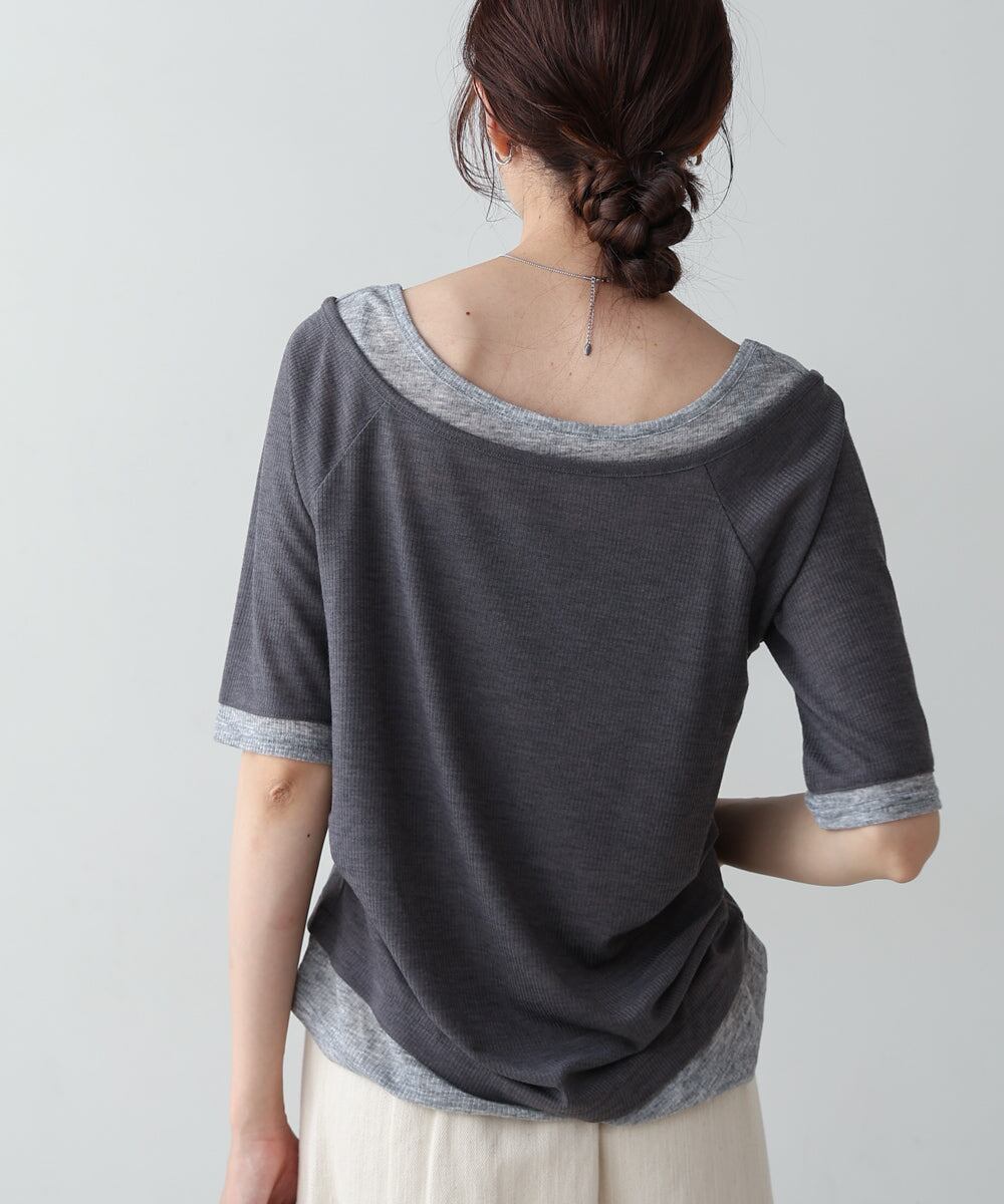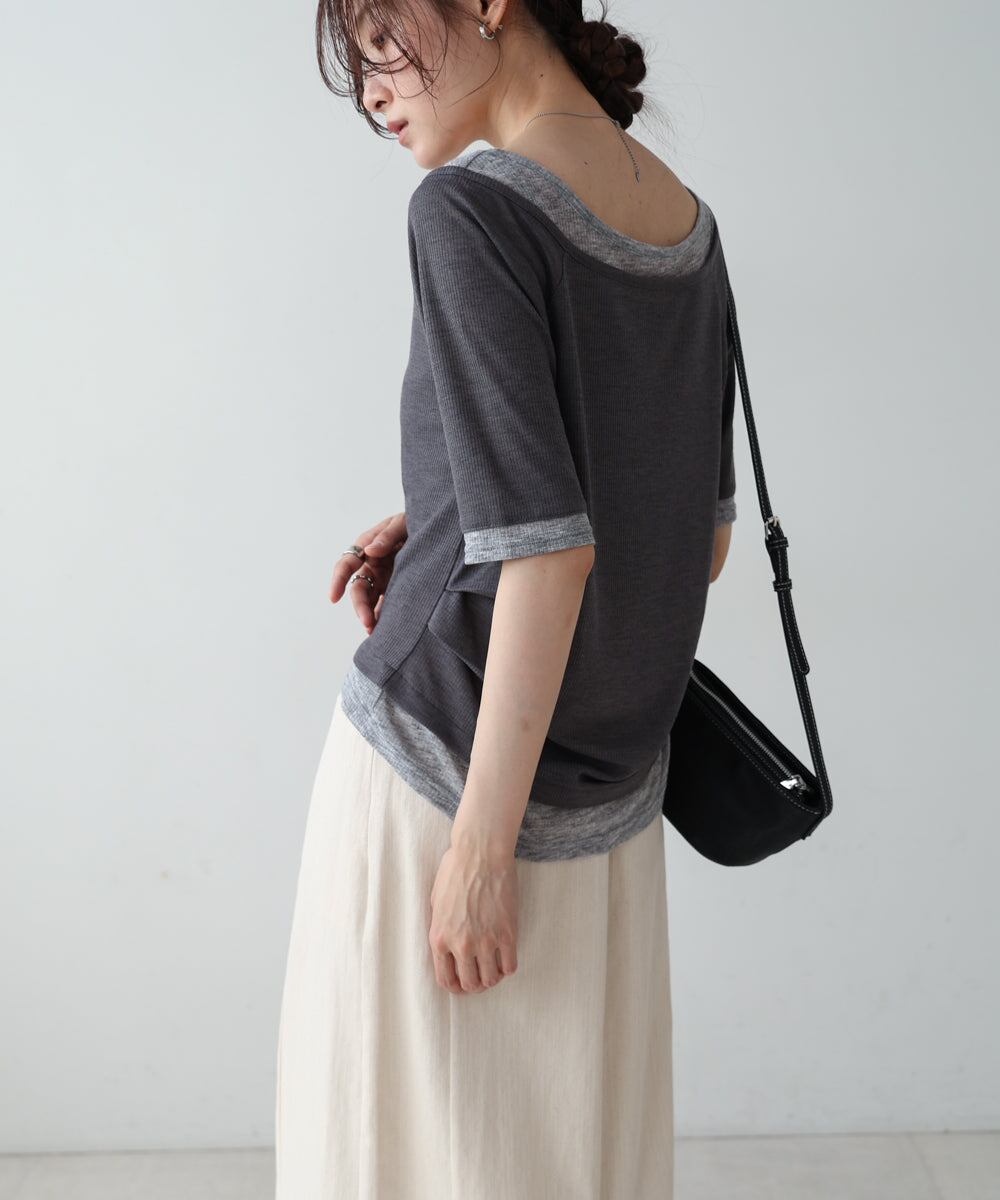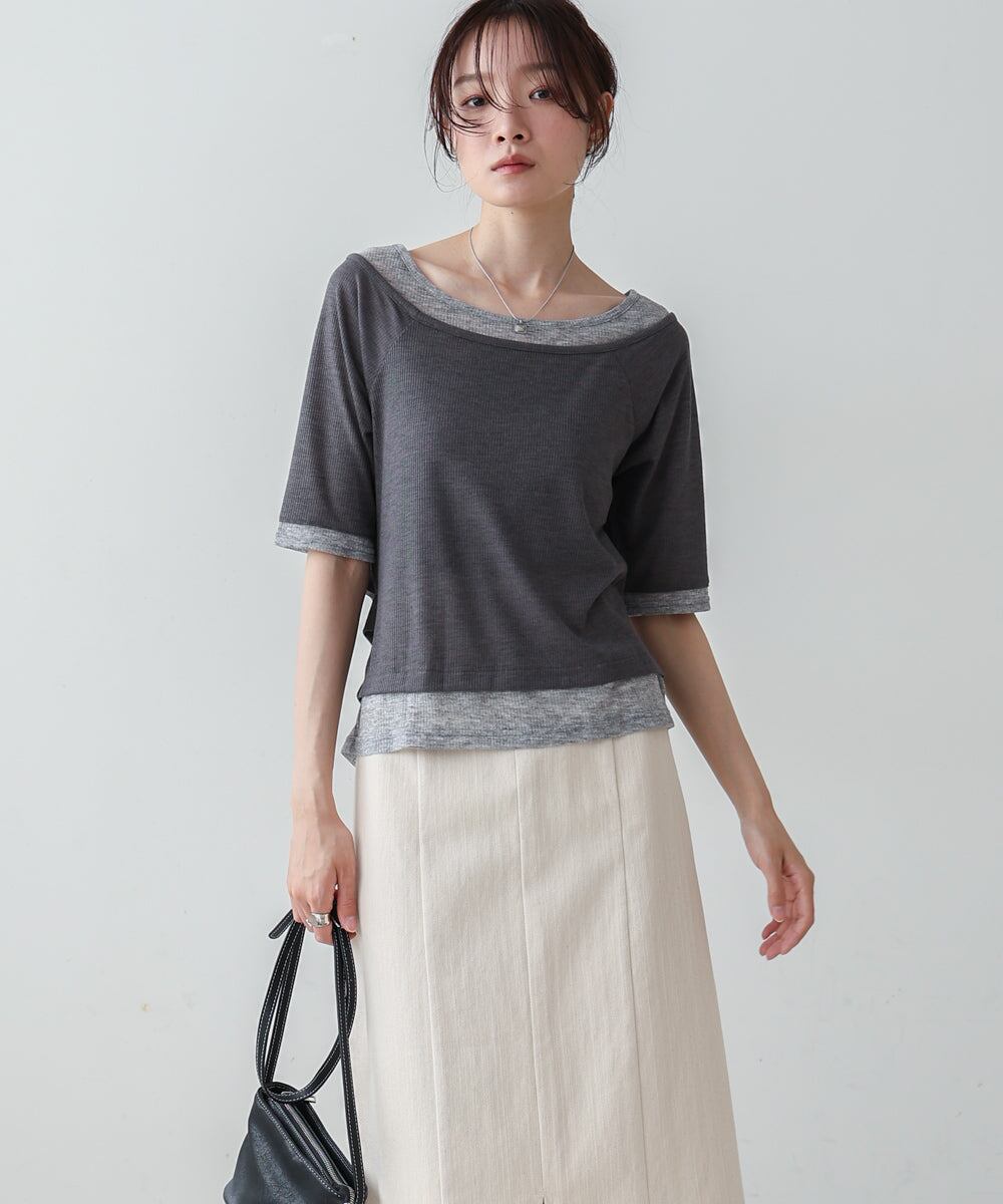 1枚でレイヤードスタイルが完成する、オフショル風デザインが魅力のカットソー。肩元に程よい肌見せをプラスすることで、女性らしい抜け感を演出します。重ね着風のデザインながらも、1枚仕立てなので着心地も◎。
