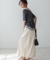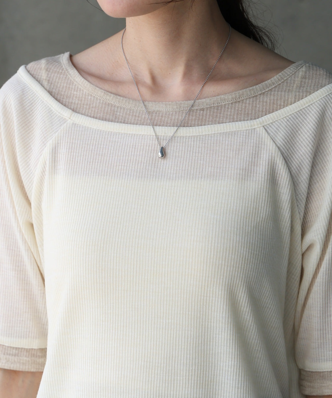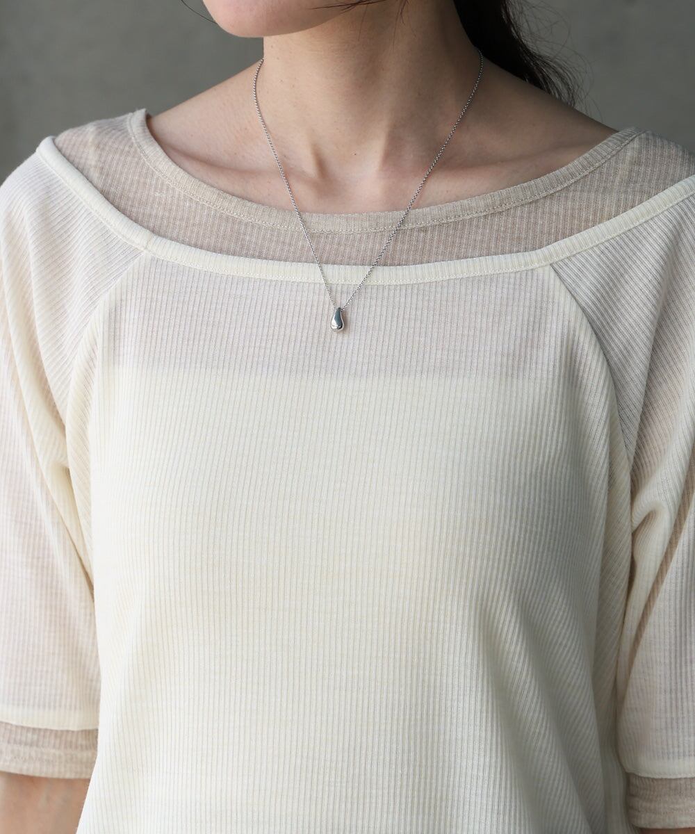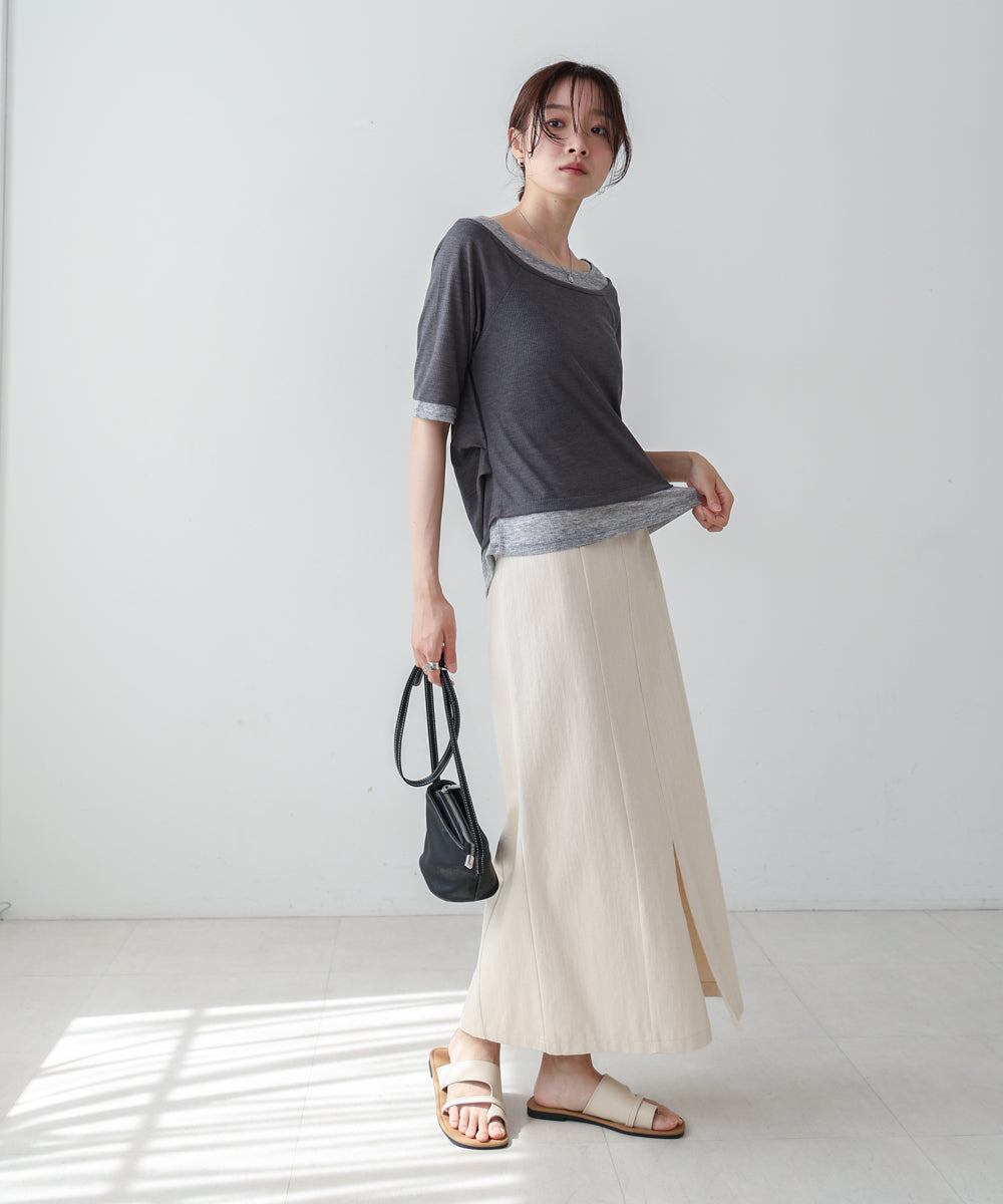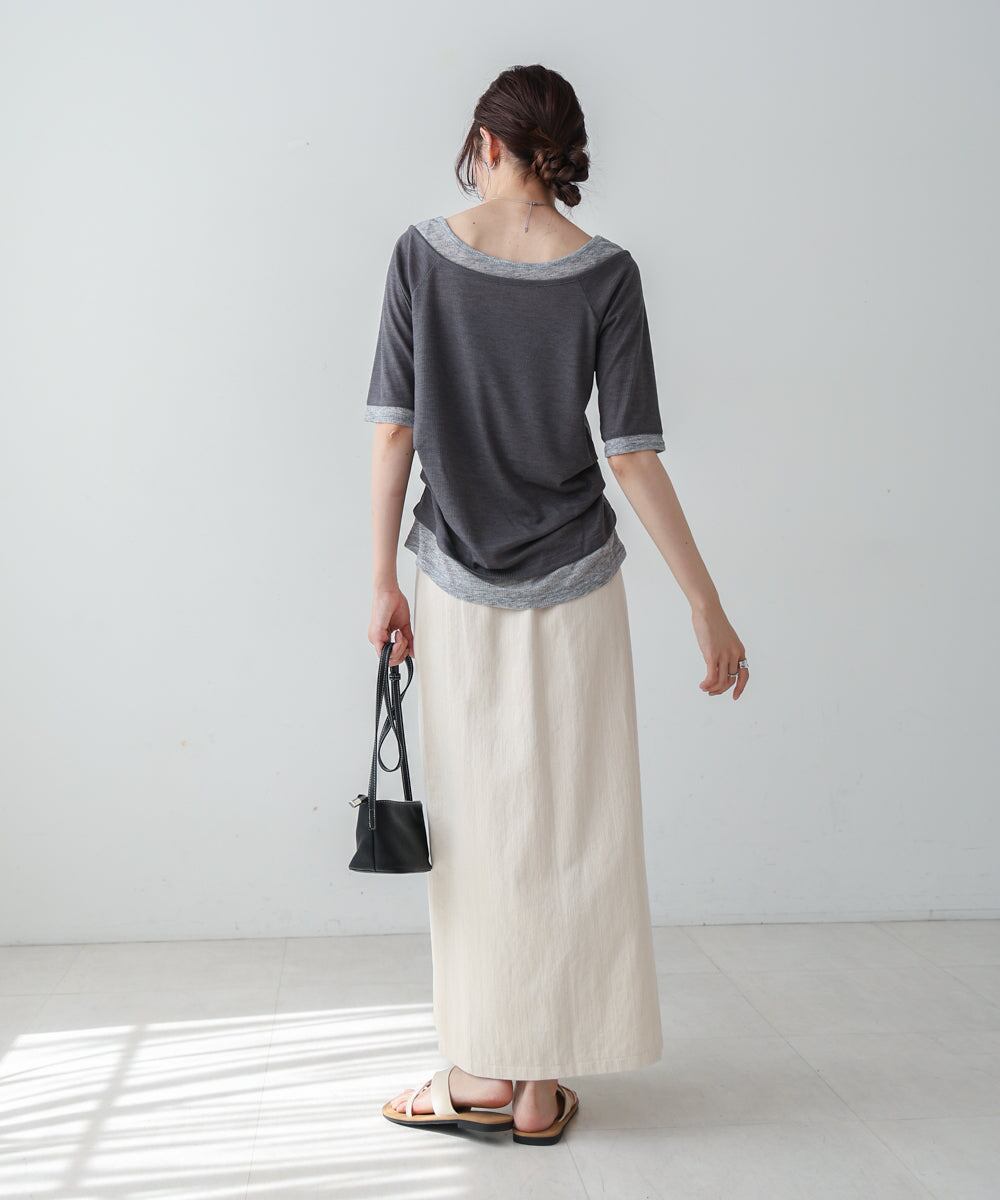 1枚でレイヤードスタイルが完成する、オフショル風デザインが魅力のカットソー。肩元に程よい肌見せをプラスすることで、女性らしい抜け感を演出します。重ね着風のデザインながらも、1枚仕立てなので着心地も◎。