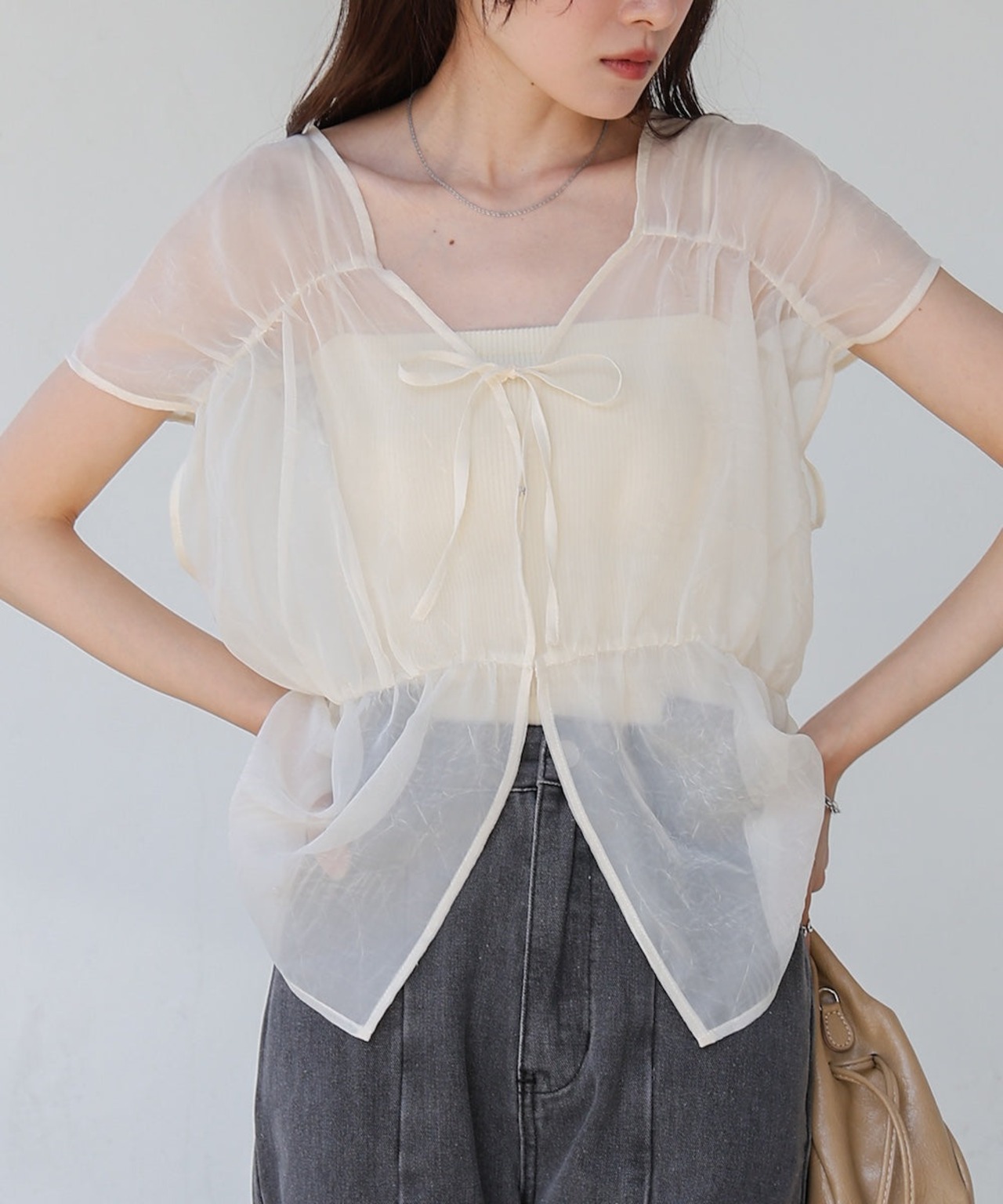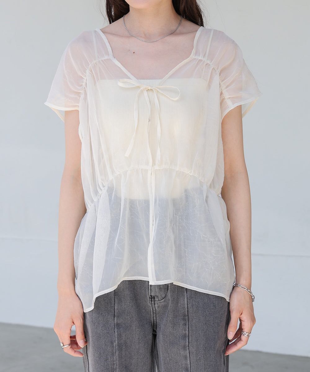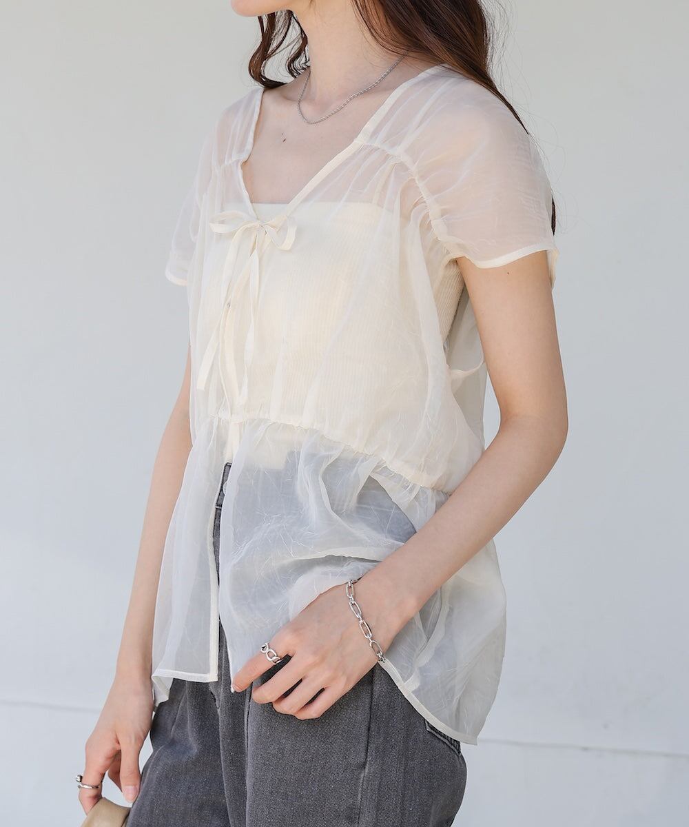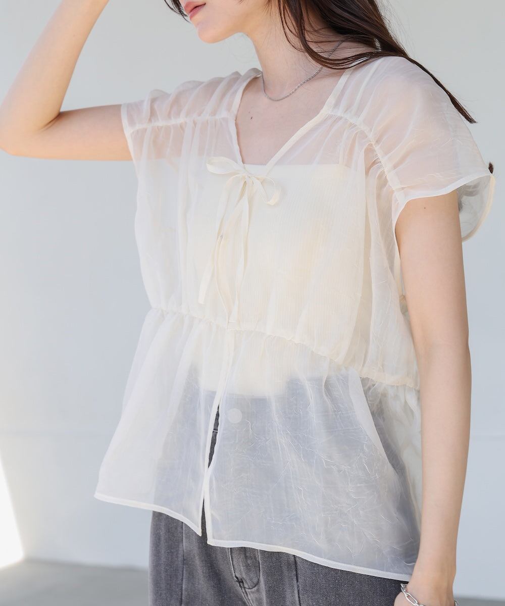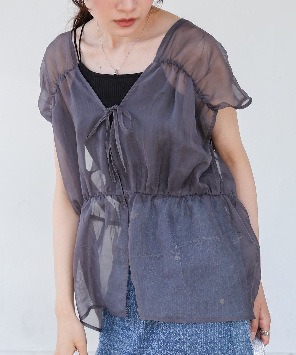 昨年も大人気だったシアーブラウスが新カラーでアップデート!前後2WAYで気分に合わせて着用頂けます。シワ加工したオーガンジー素材を使用し、立体感より出るような素材をチョイス。たっぷりギャザーを寄せた仕様も女性らしい印象に。フロント部分のリボンは結んでも垂らしても◎。リボン結びだとより可愛らしい見た目に。気になる二の腕部分も自然と隠してくれるので、キャミソール系のアイテムの羽織にぴったりです。