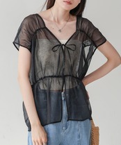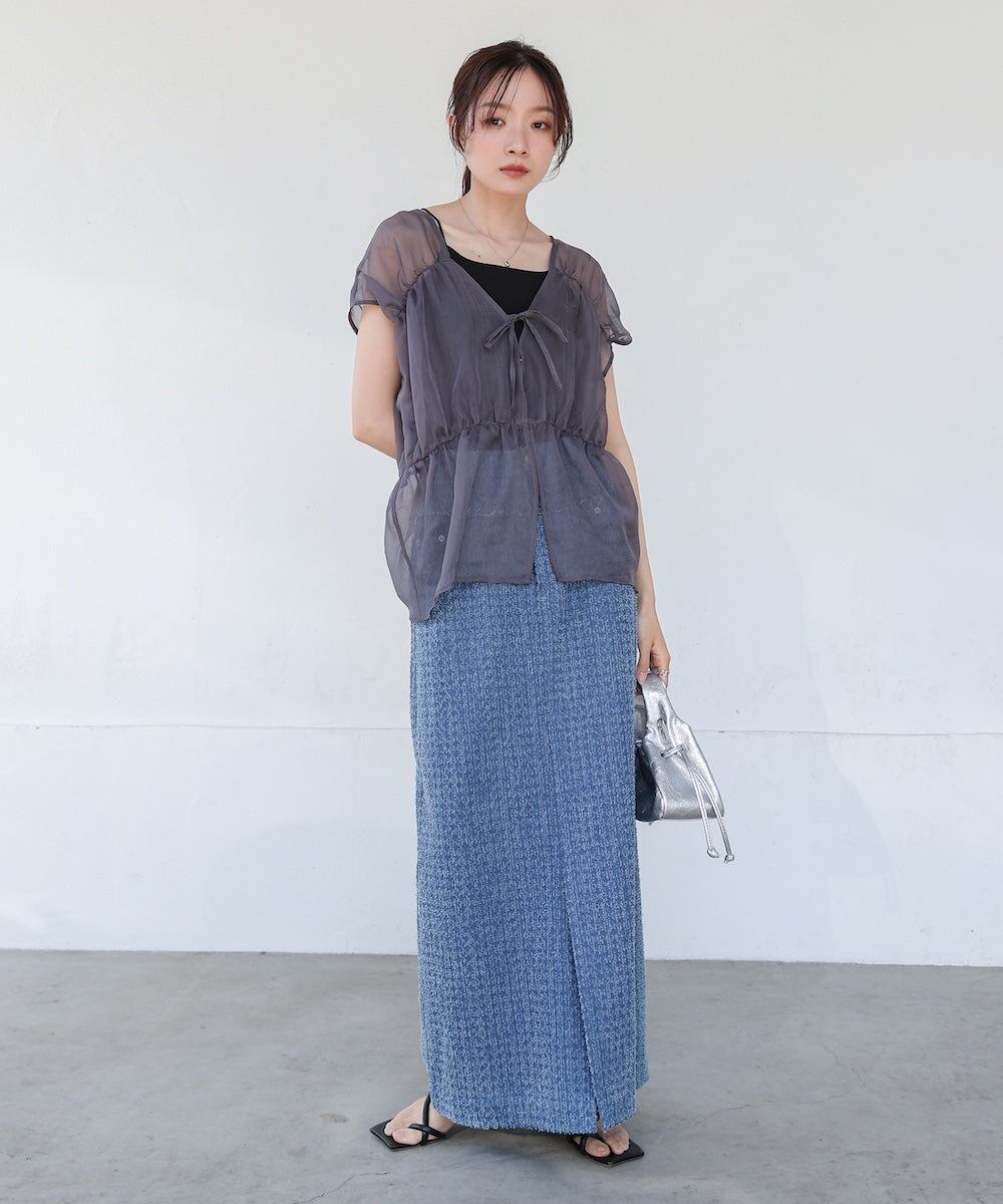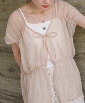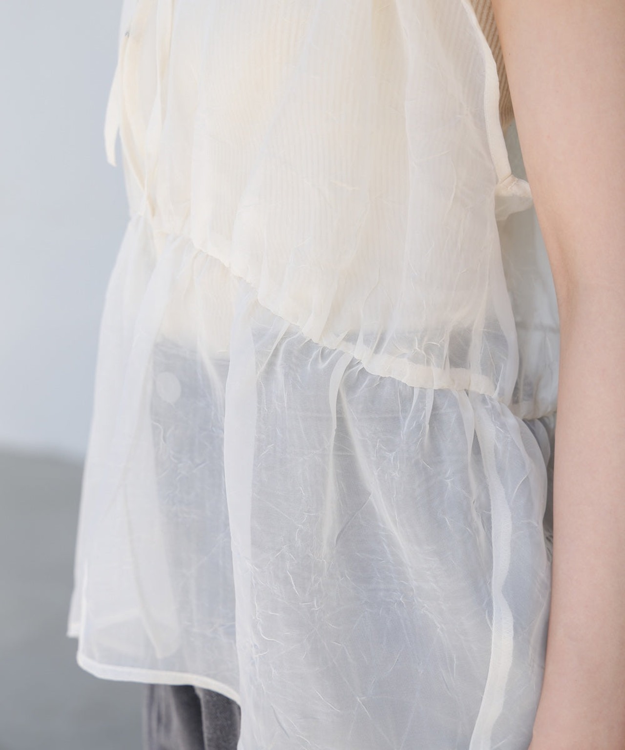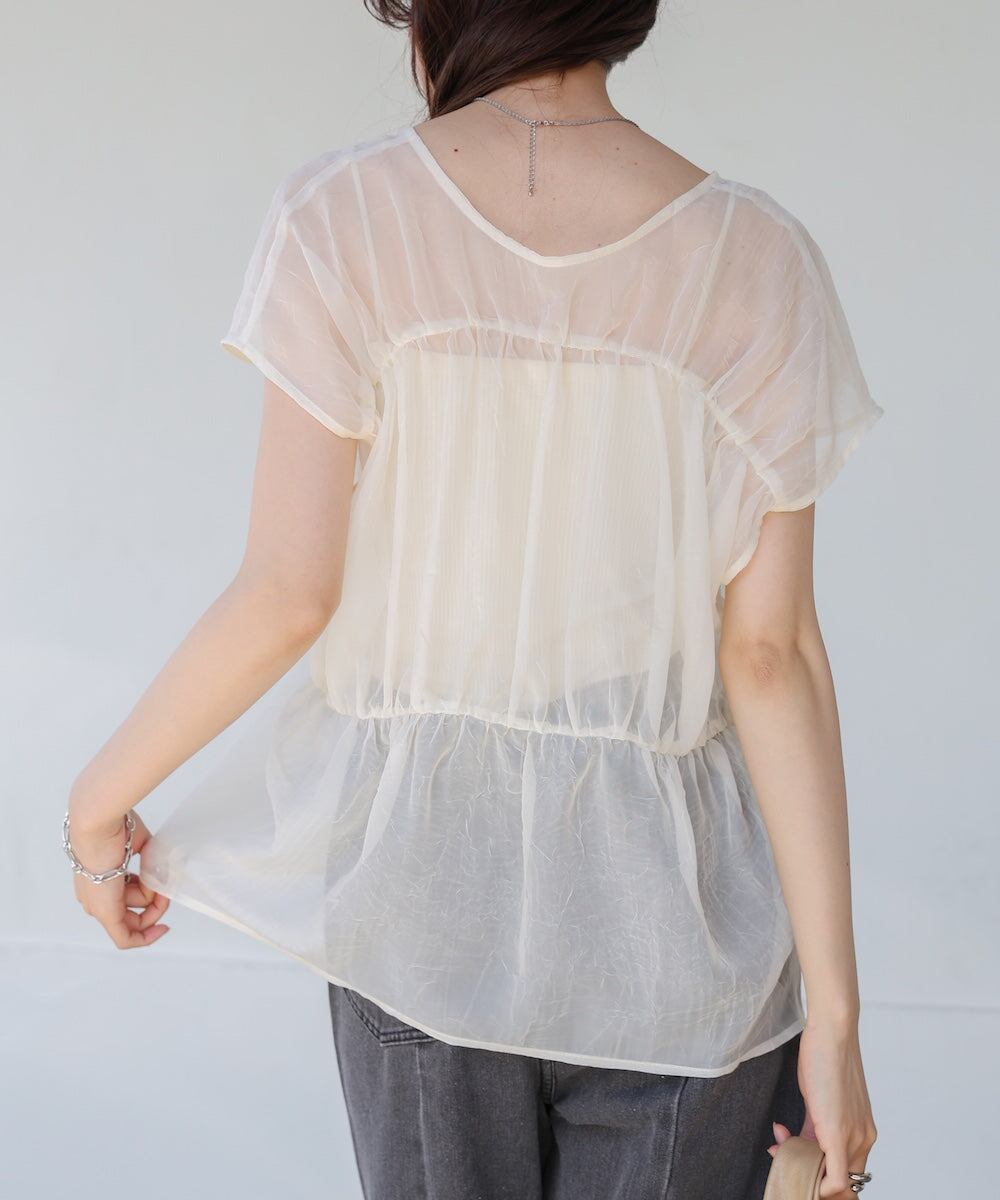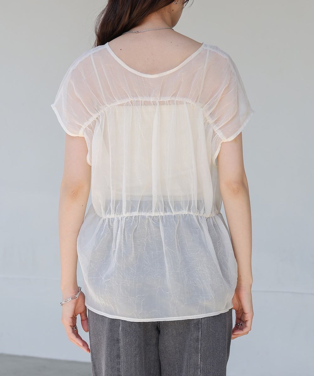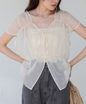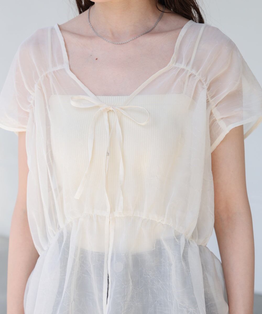昨年も大人気だったシアーブラウスが新カラーでアップデート!前後2WAYで気分に合わせて着用頂けます。シワ加工したオーガンジー素材を使用し、立体感より出るような素材をチョイス。たっぷりギャザーを寄せた仕様も女性らしい印象に。フロント部分のリボンは結んでも垂らしても◎。リボン結びだとより可愛らしい見た目に。気になる二の腕部分も自然と隠してくれるので、キャミソール系のアイテムの羽織にぴったりです。