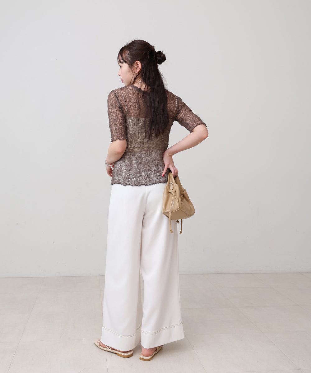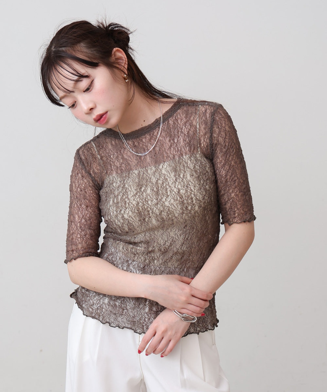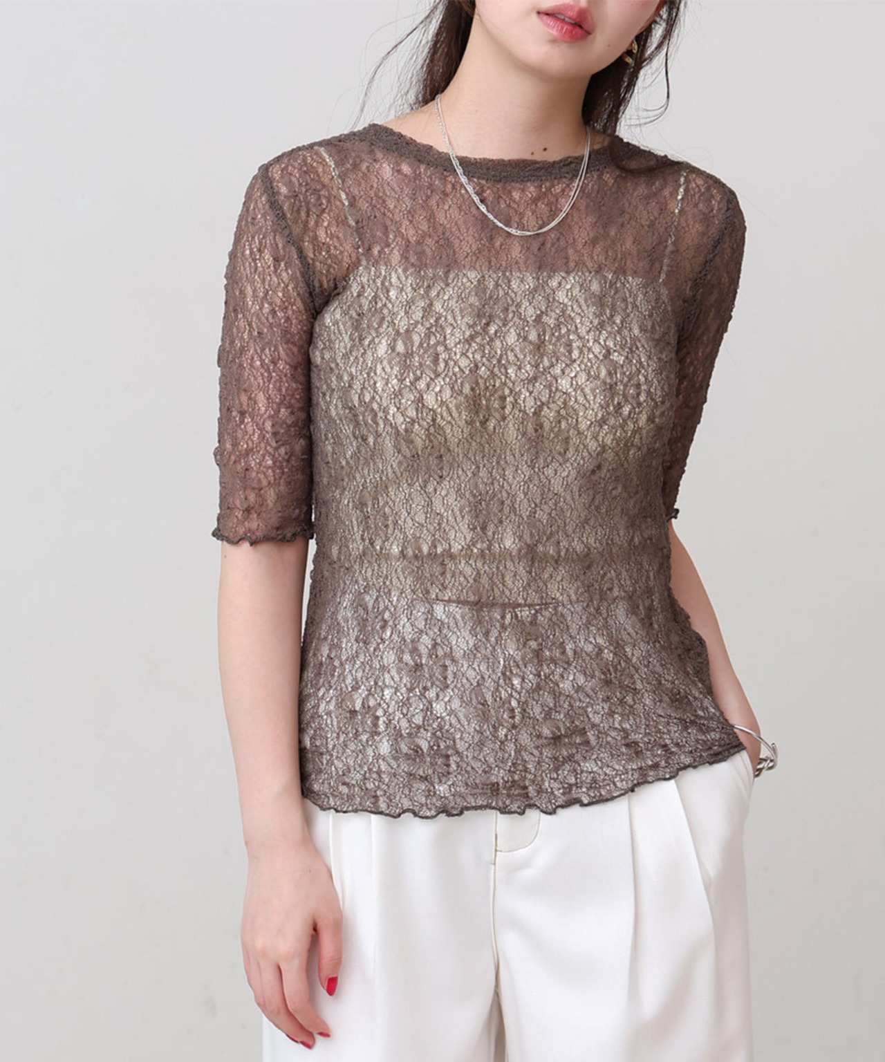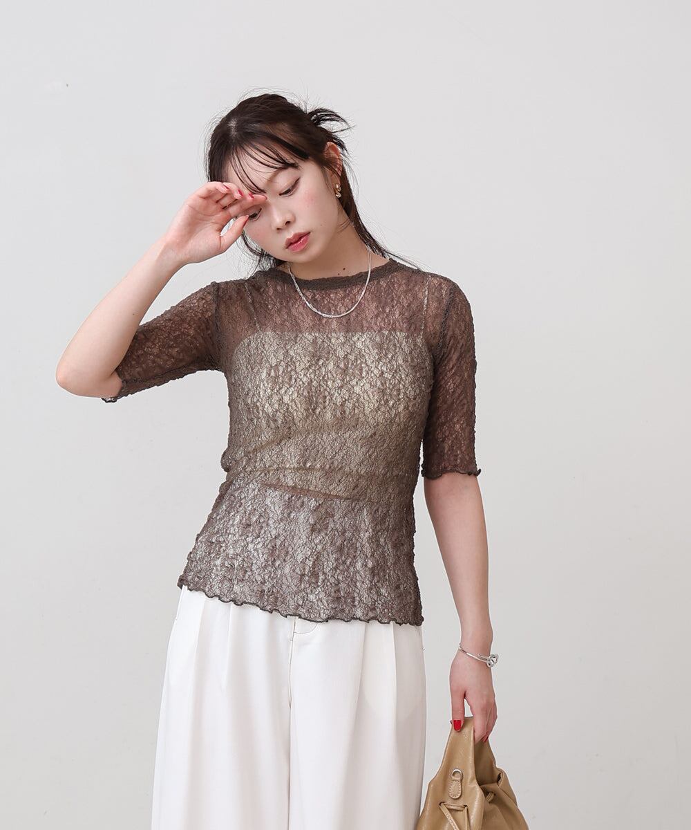 軽やかな透け感が、さりげない女らしさを演出してくれて、レイヤードにもぴったりです。
