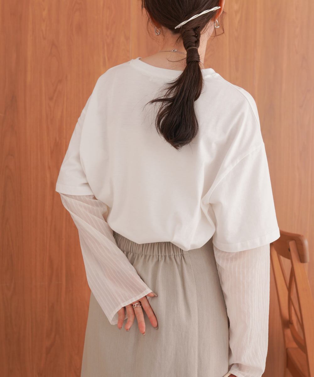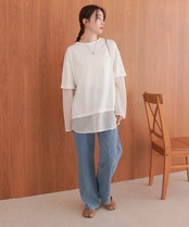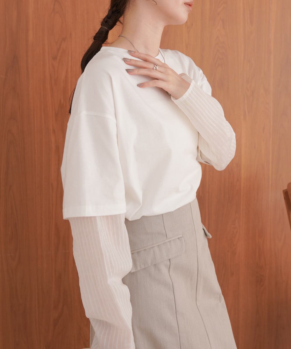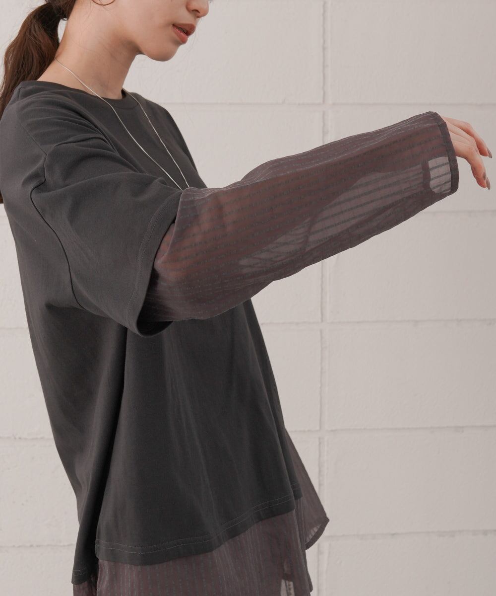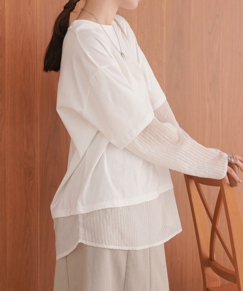 袖・裾をシアー素材でレイヤー風にドッキングしたディティールが目を引くデザインTシャツの登場です。本体のTシャツはゆとりのあるサイズ感でボディラインを拾わず、体型カバーにも役立ちます。シアー部分はさりげないストライプ柄になっているので柄が得意でない方にもおすすめなアイテム〇1枚着るだけで主役級です。背中側はスッキリとしたシンプルなシルエットで、トレンド感がありながら飽きの来ないデザインです。