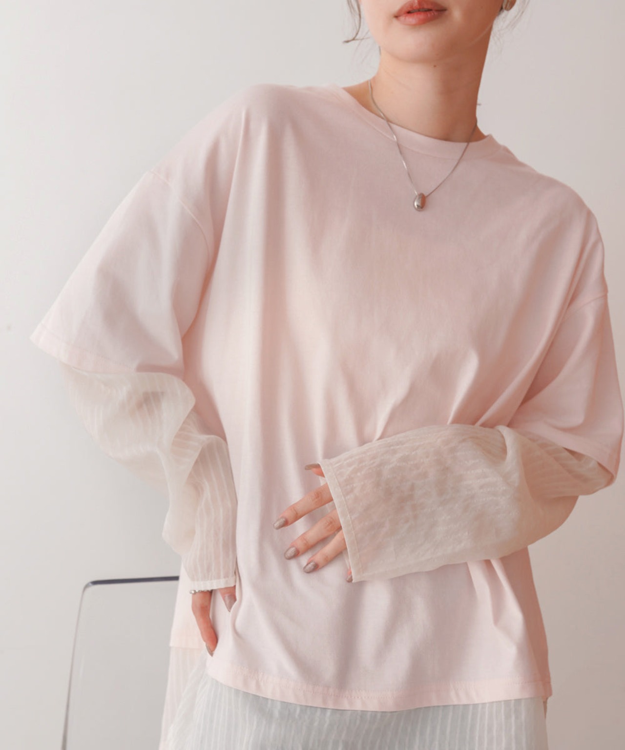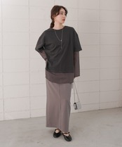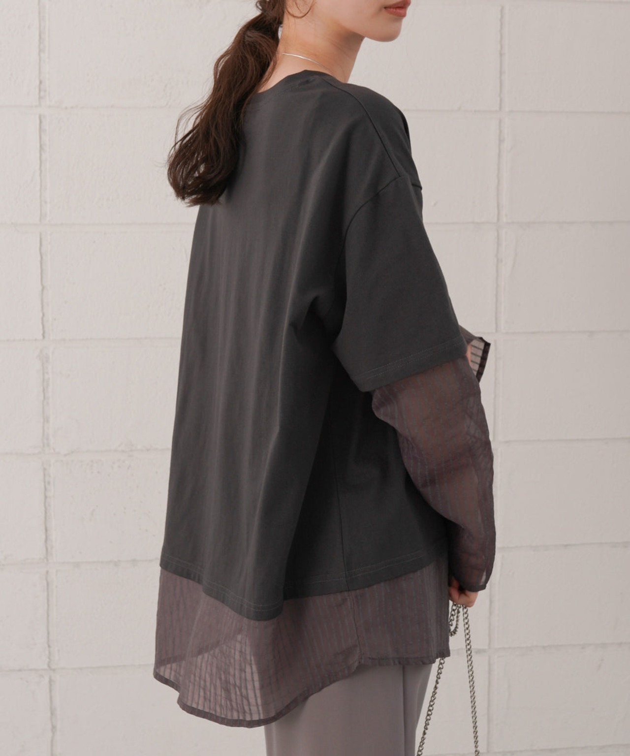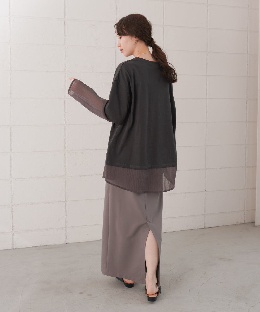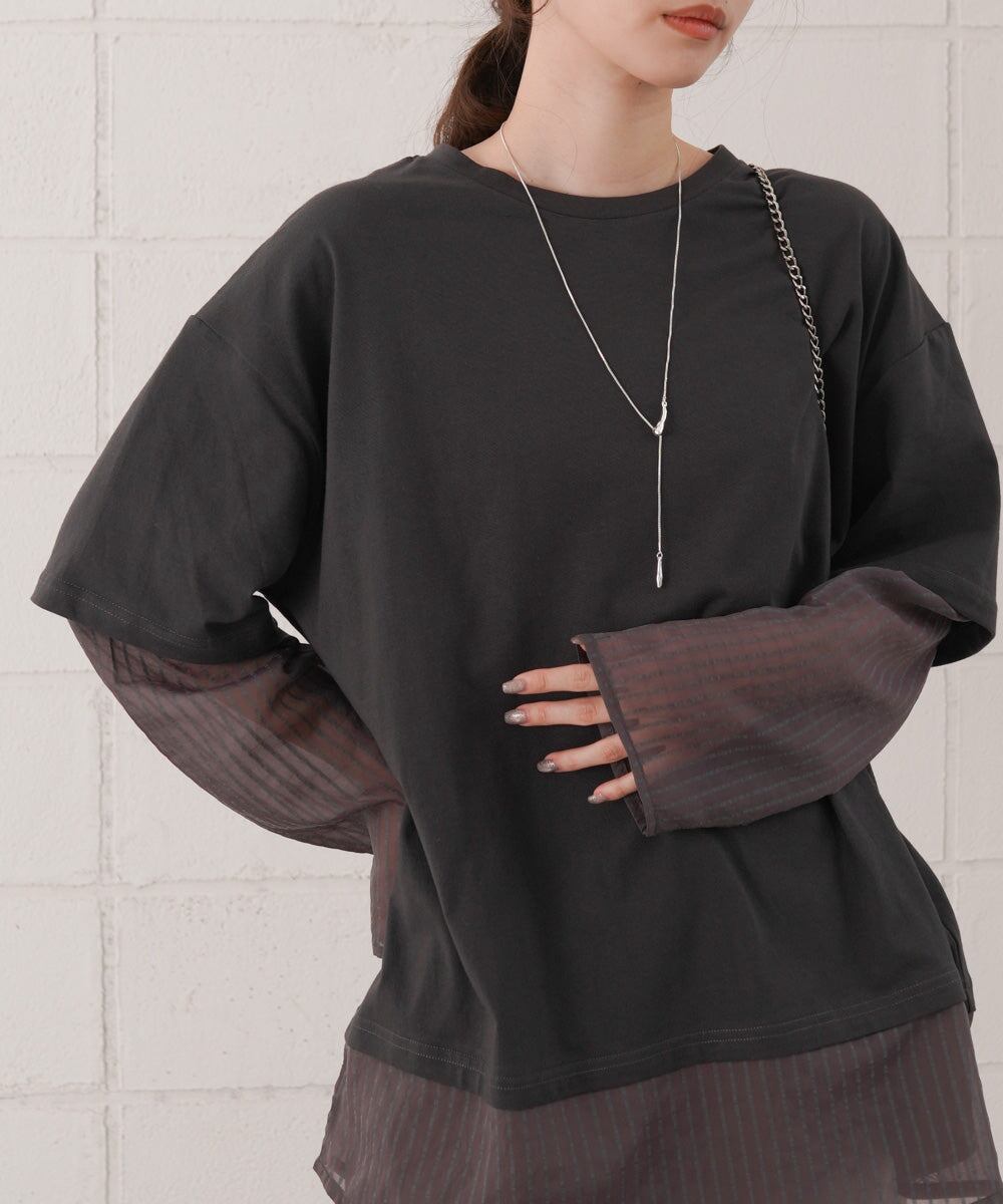 袖・裾をシアー素材でレイヤー風にドッキングしたディティールが目を引くデザインTシャツの登場です。本体のTシャツはゆとりのあるサイズ感でボディラインを拾わず、体型カバーにも役立ちます。シアー部分はさりげないストライプ柄になっているので柄が得意でない方にもおすすめなアイテム〇1枚着るだけで主役級です。背中側はスッキリとしたシンプルなシルエットで、トレンド感がありながら飽きの来ないデザインです。