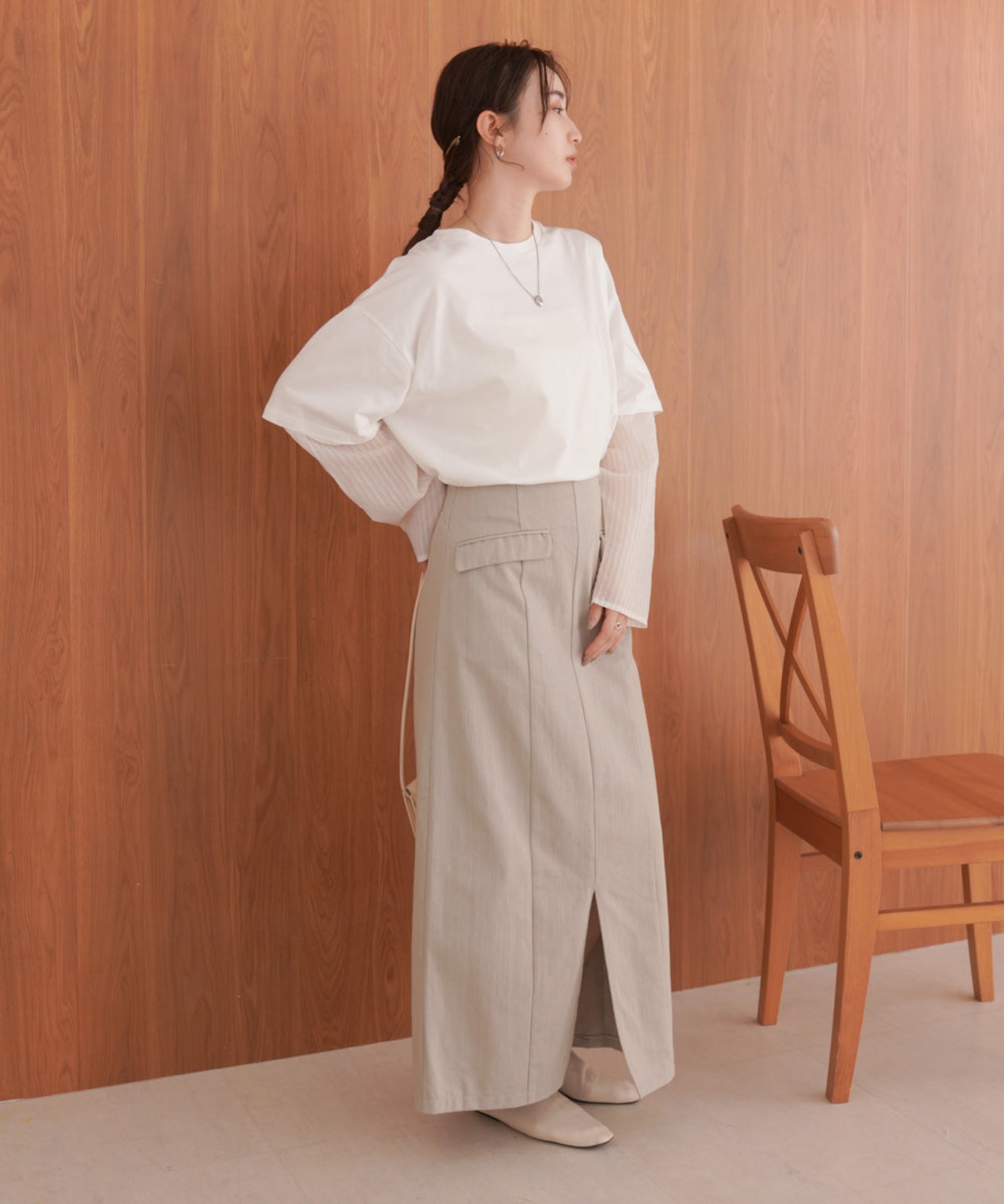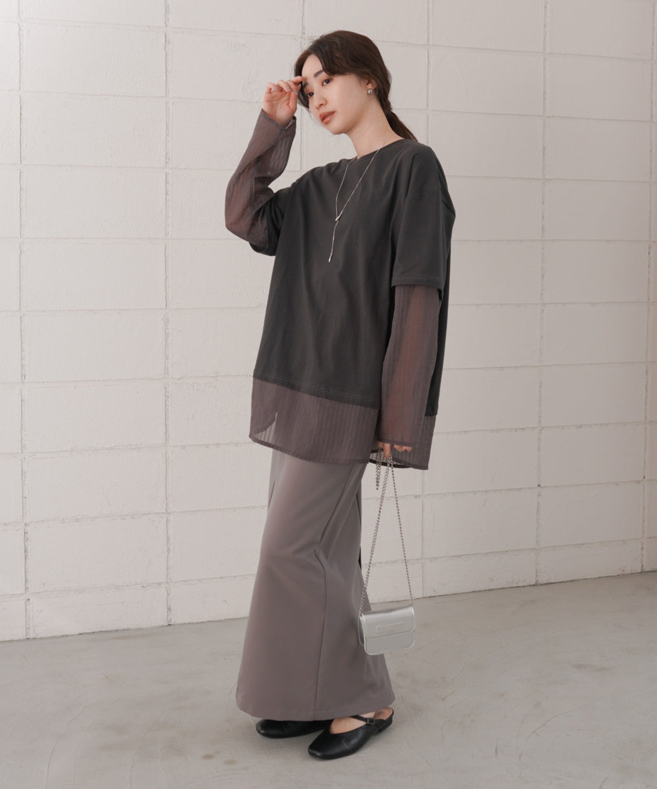 様々なボトムスに迷いなくお召し頂ける万能な1枚!シアー部分のストライプ織がさりげないポイントに。きれいめな雰囲気にも合わせやすいので、オフィスカジュアルにもオススメです。
