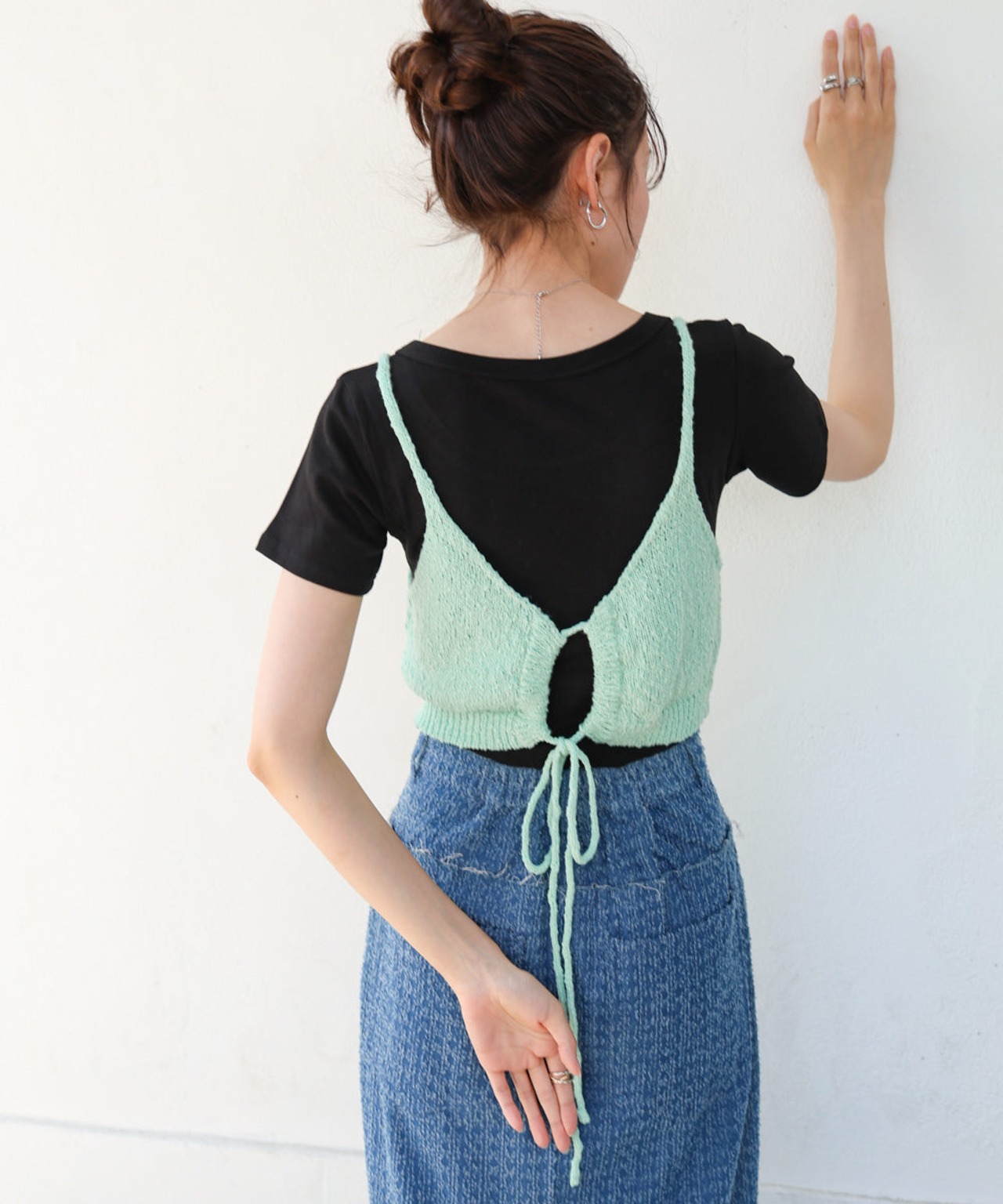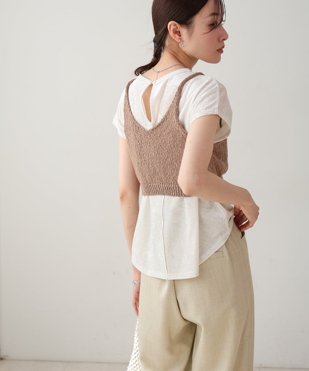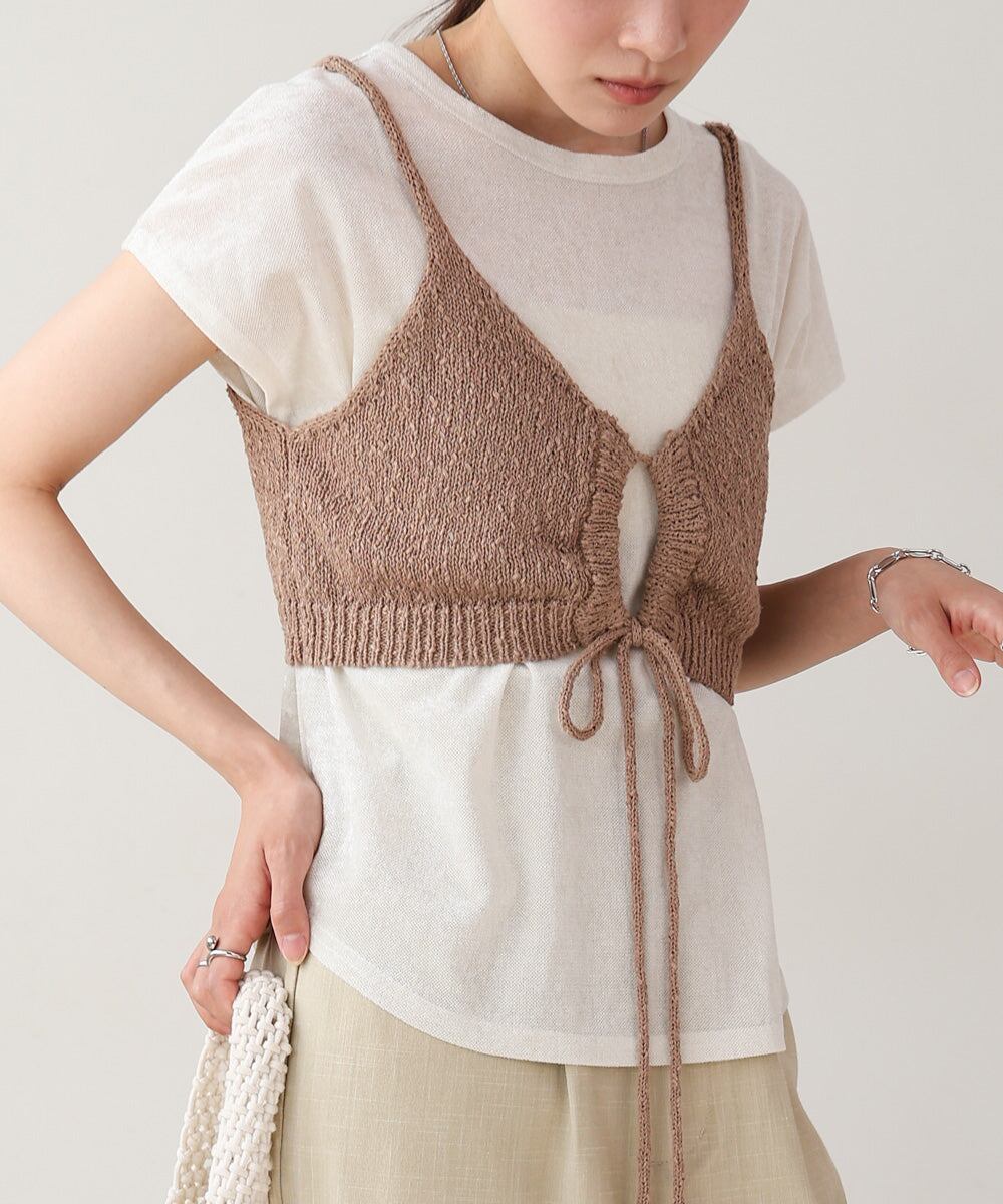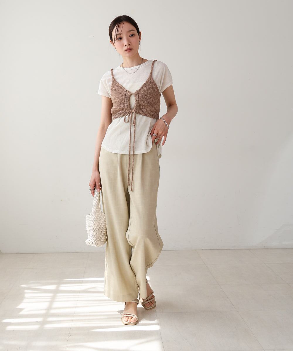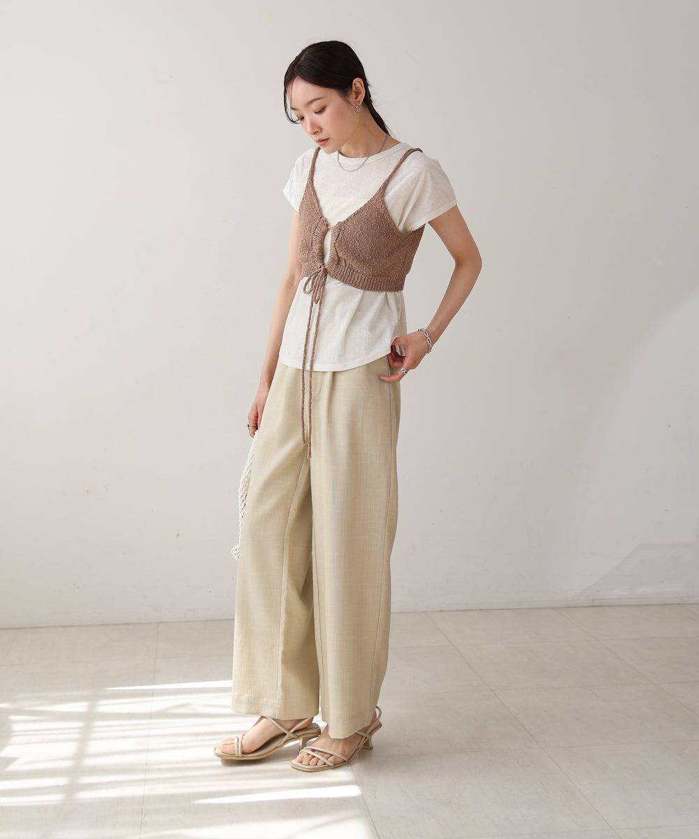 ウエストに視線を集めるデザインなのでスタイルアップ効果もあり、メリハリのあるシルエットを作ることができます。ざっくりとした編み地の表面感で夏らしい涼しげなアイテムに仕上がりました。