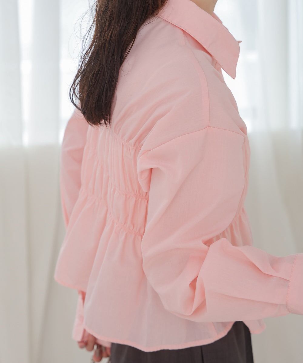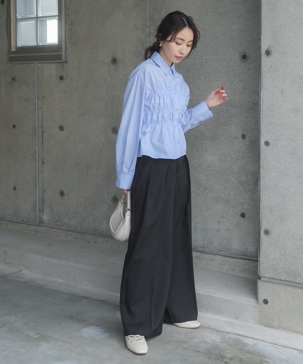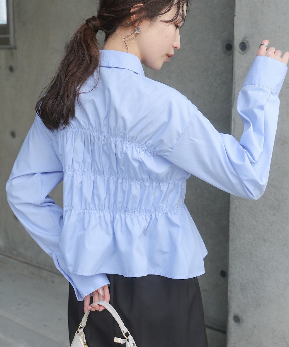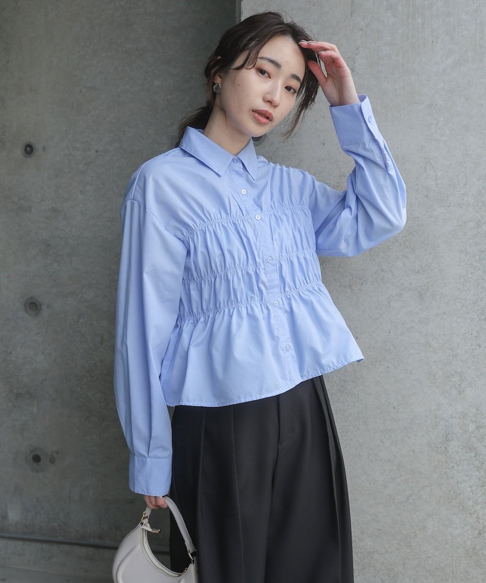 幅広いテイストが楽しめるビスチェデザインのシャツです。ギャザーデザインが程よくフィットしたシルエットに。1枚でコーデが完成するデザインシャツです。袖口はつまり過ぎず、程よいワイドシルエットで抜け感がでてカジュアルにまとまります◎