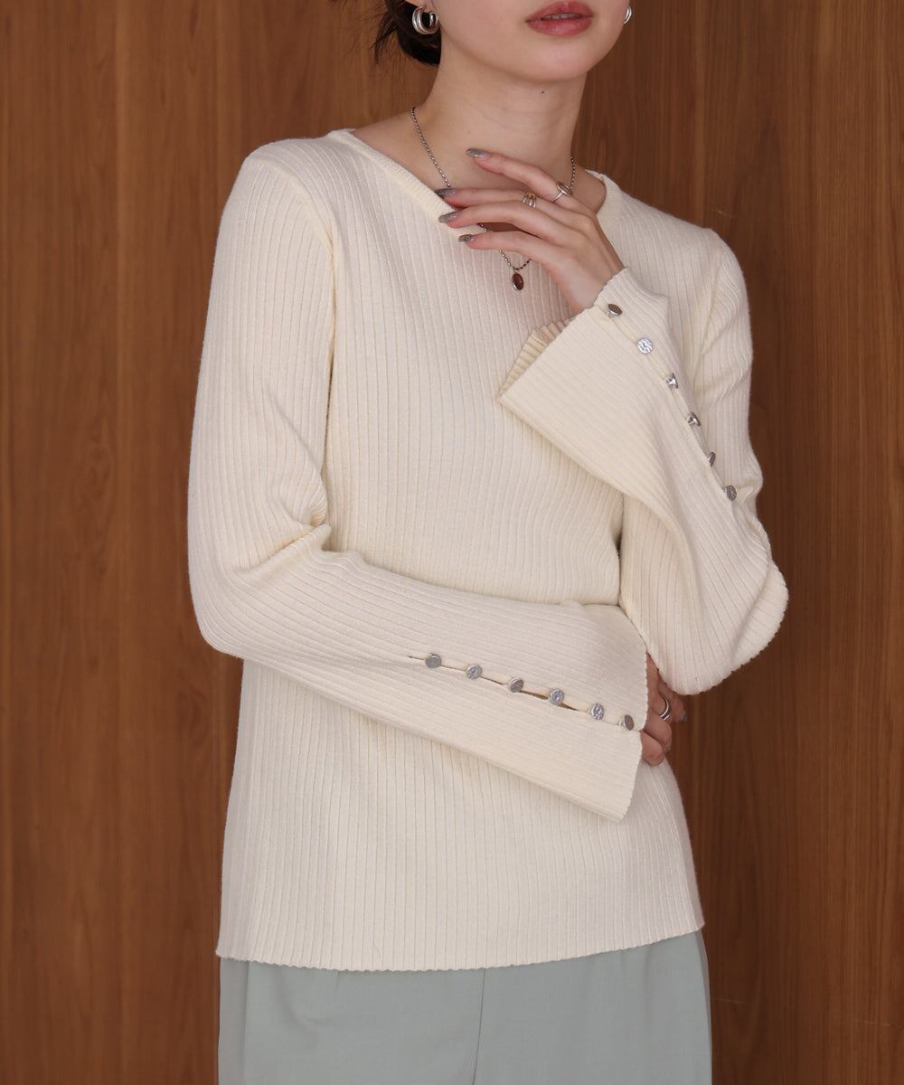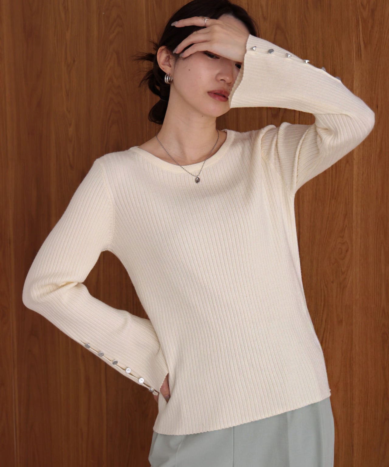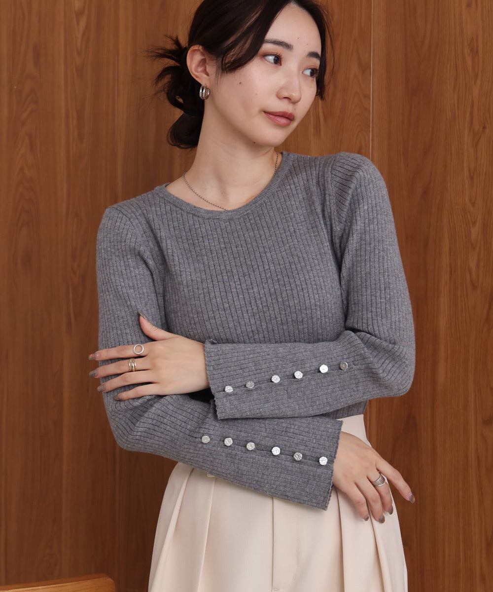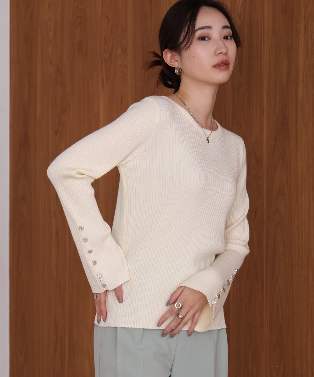 フレアスリーブにメタルボタンを大胆に1列オンして、Babらしい目を惹くリブニットが出来上がりました!