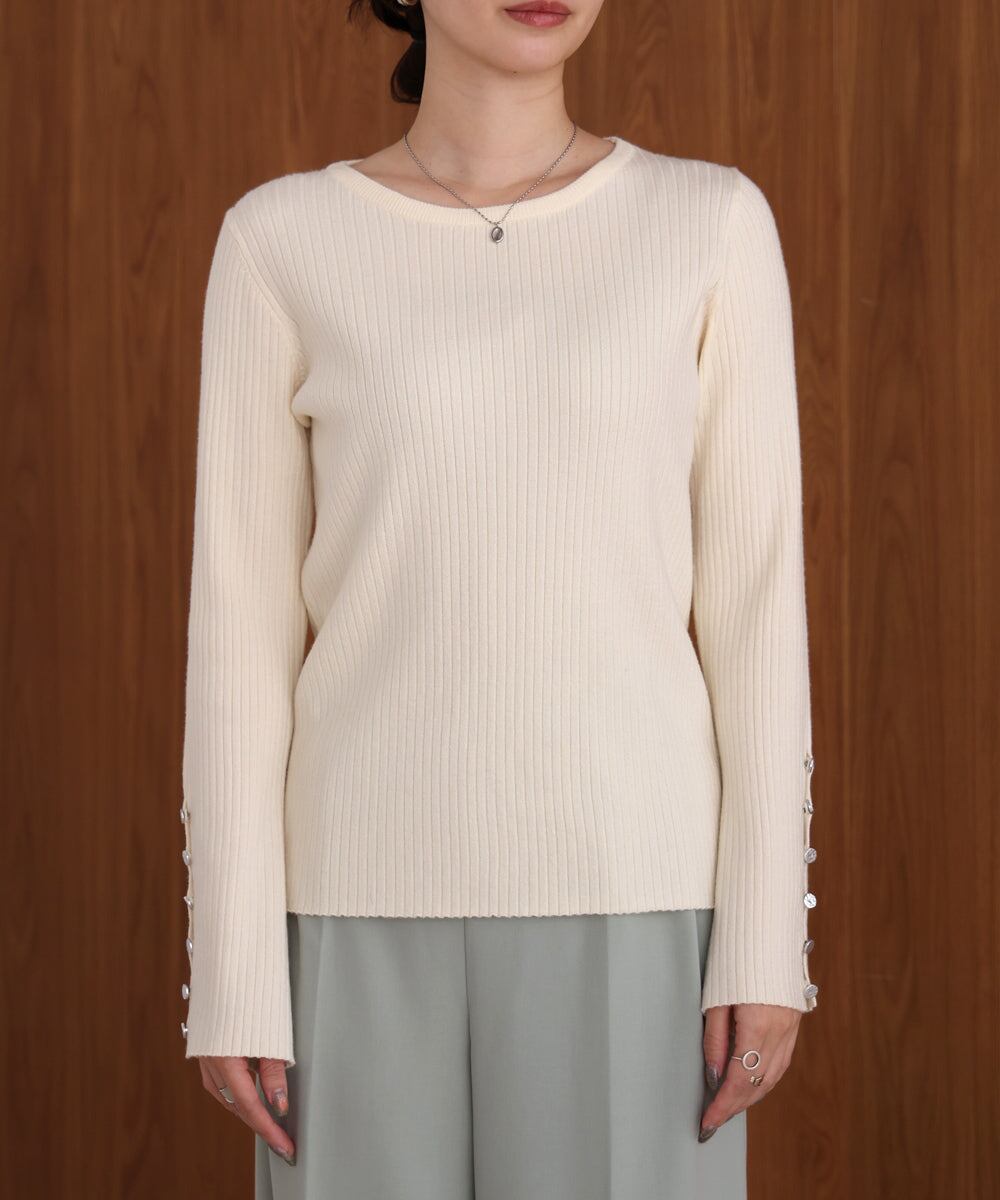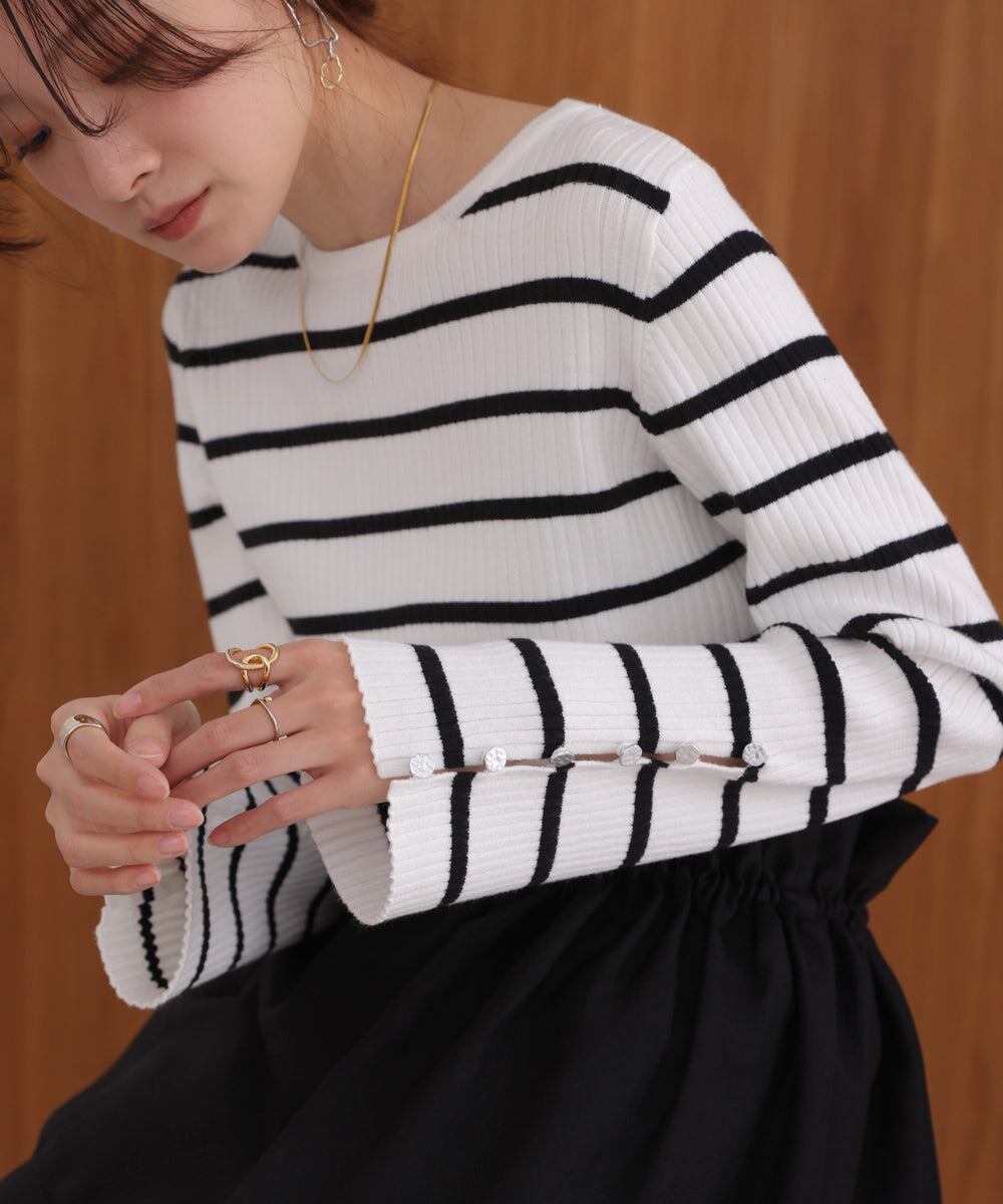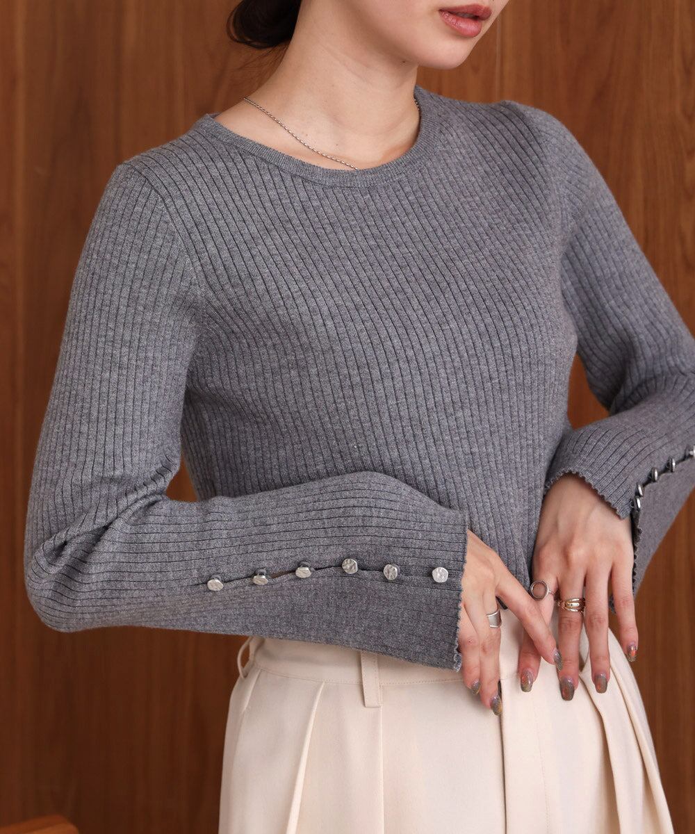 フレアスリーブにメタルボタンを大胆に1列オンして、Babらしい目を惹くリブニットが出来上がりました!