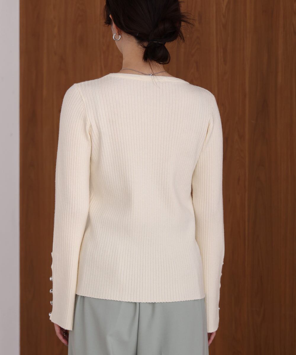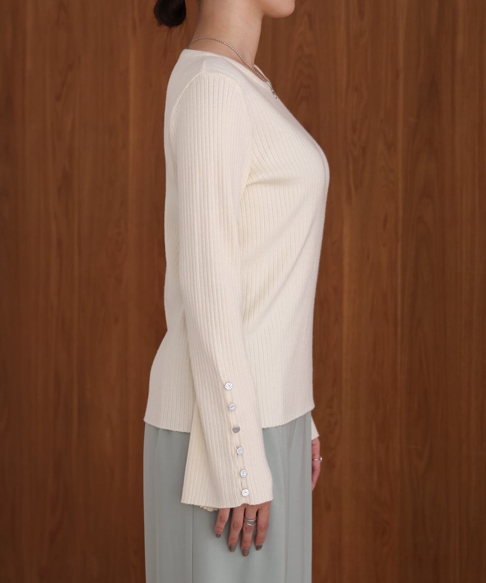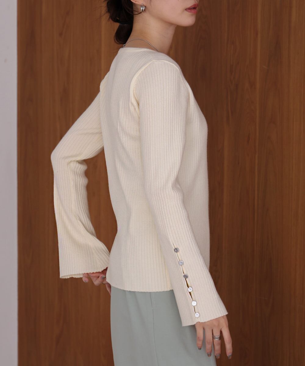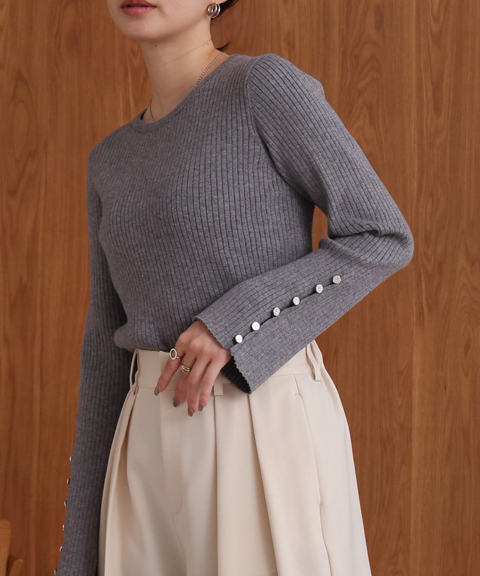 フレアスリーブにメタルボタンを大胆に1列オンして、Babらしい目を惹くリブニットが出来上がりました!