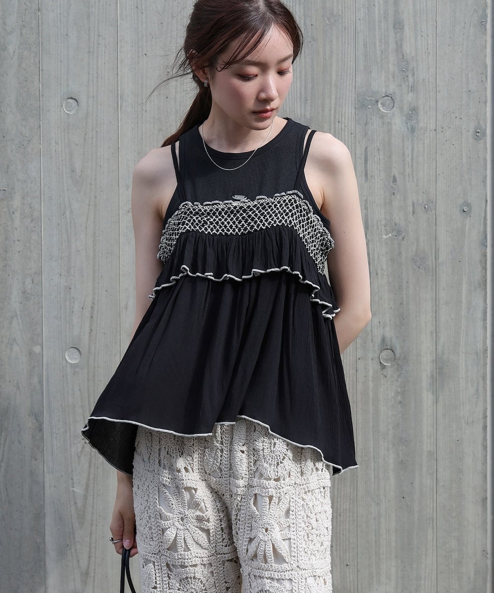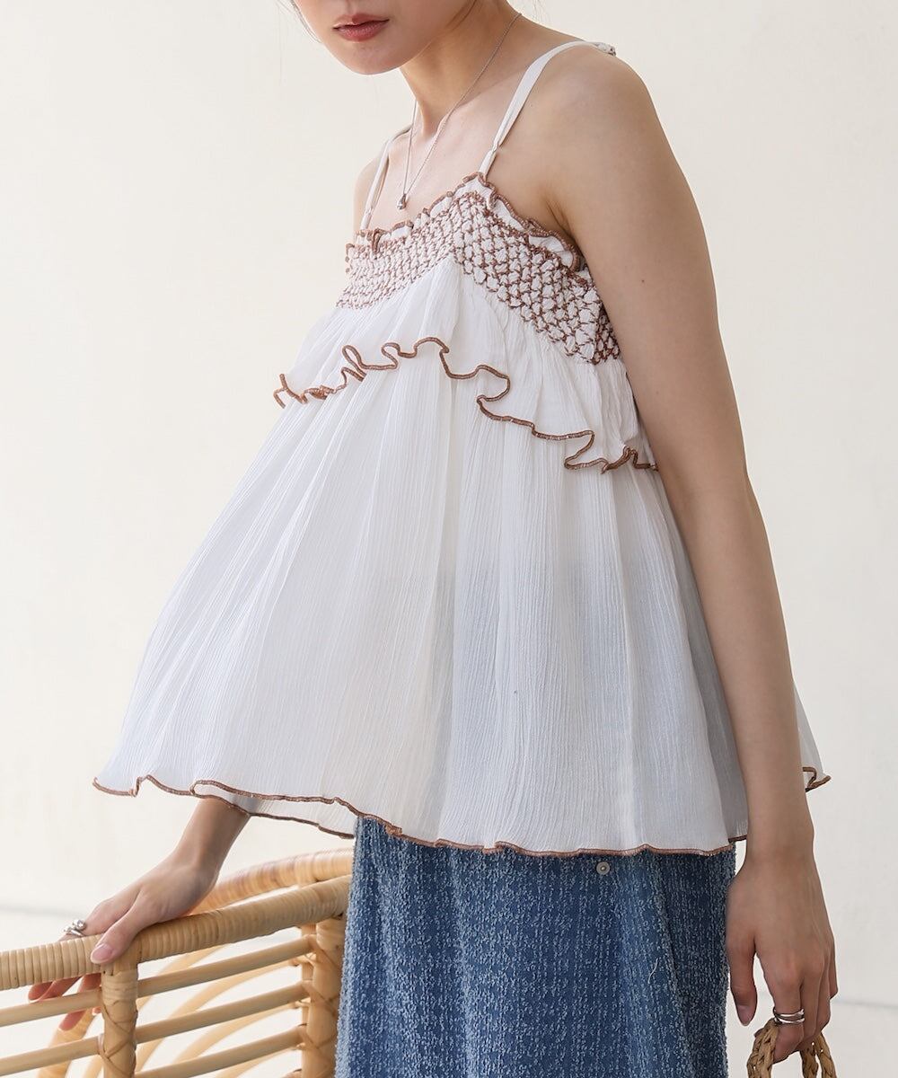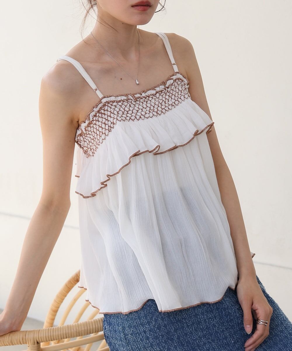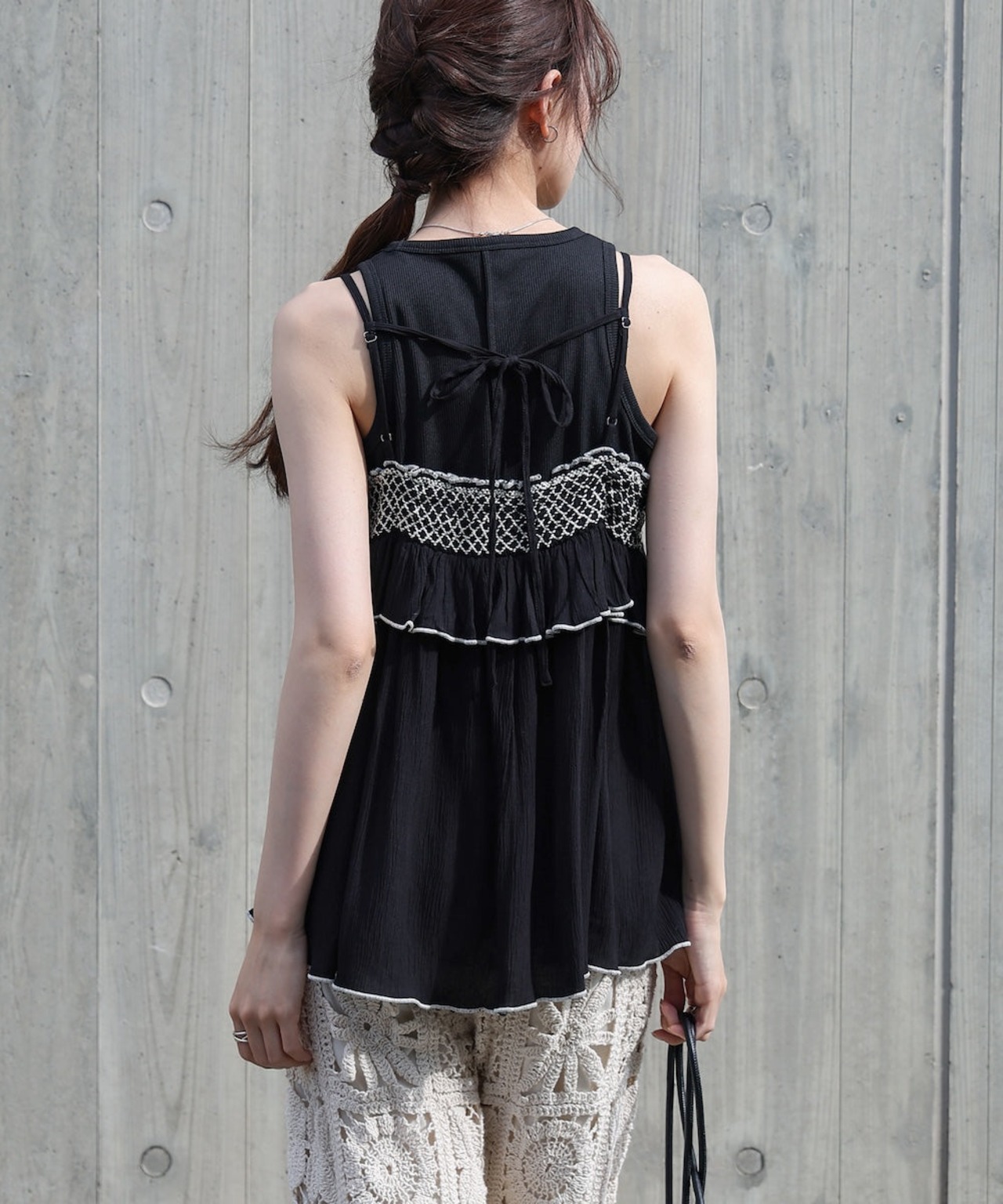 しわや凹凸感が特徴のクレープ生地を使用したキャミソール。胸元にあしらったスモッキング刺繍が顔周りを華やかにしてくれます。前後差のある丈感でティアードになっているのでウエスト周り、お尻周りもカバーしてくれます。トップスとしてもレイヤードとしても着回しの効くうれしいアイテムです。