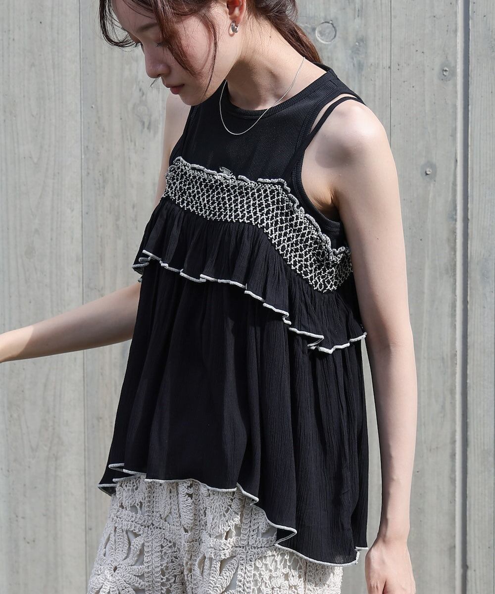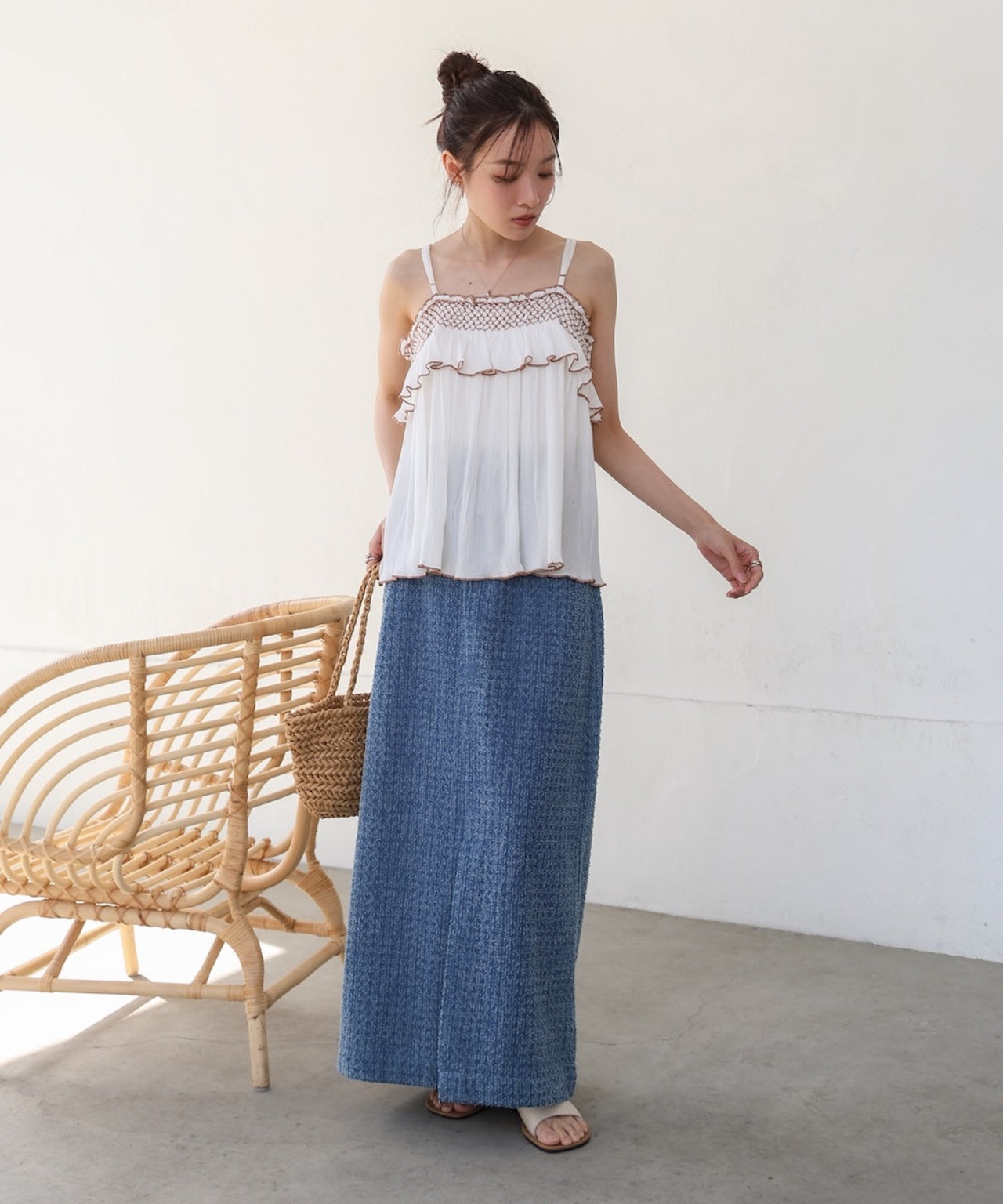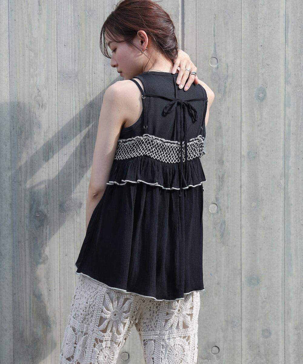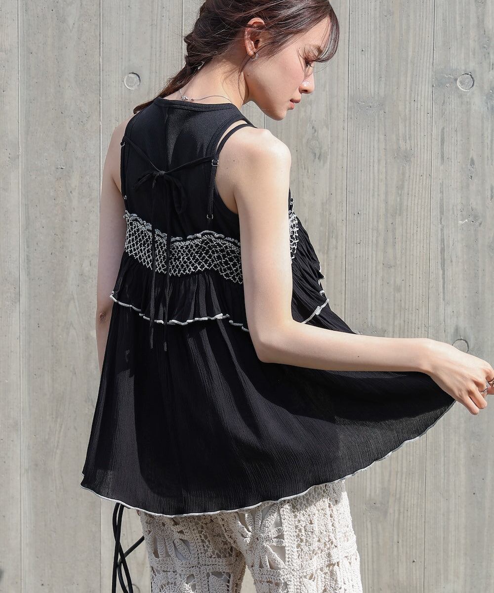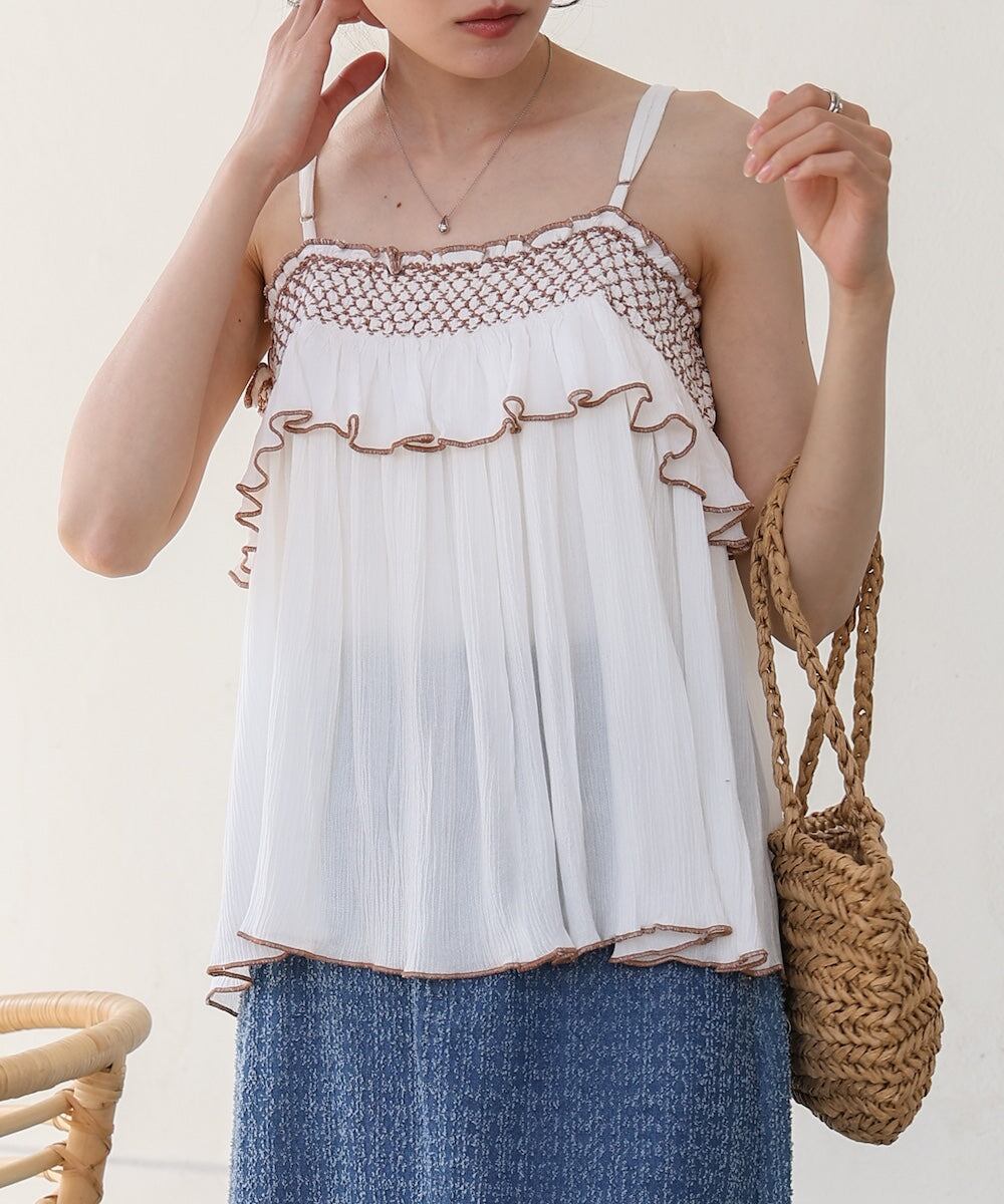 しわや凹凸感が特徴のクレープ生地を使用したキャミソール。胸元にあしらったスモッキング刺繍が顔周りを華やかにしてくれます。前後差のある丈感でティアードになっているのでウエスト周り、お尻周りもカバーしてくれます。トップスとしてもレイヤードとしても着回しの効くうれしいアイテムです。