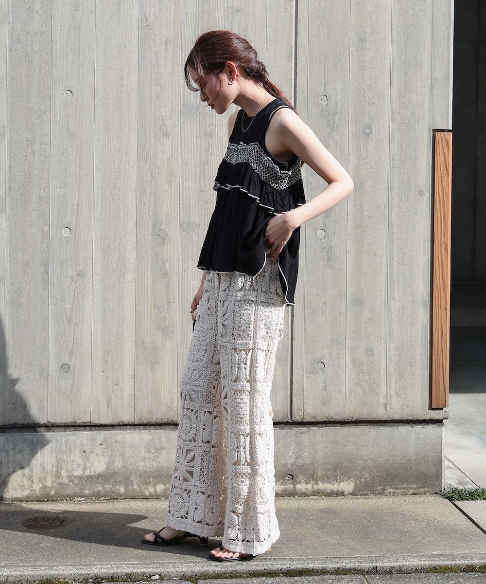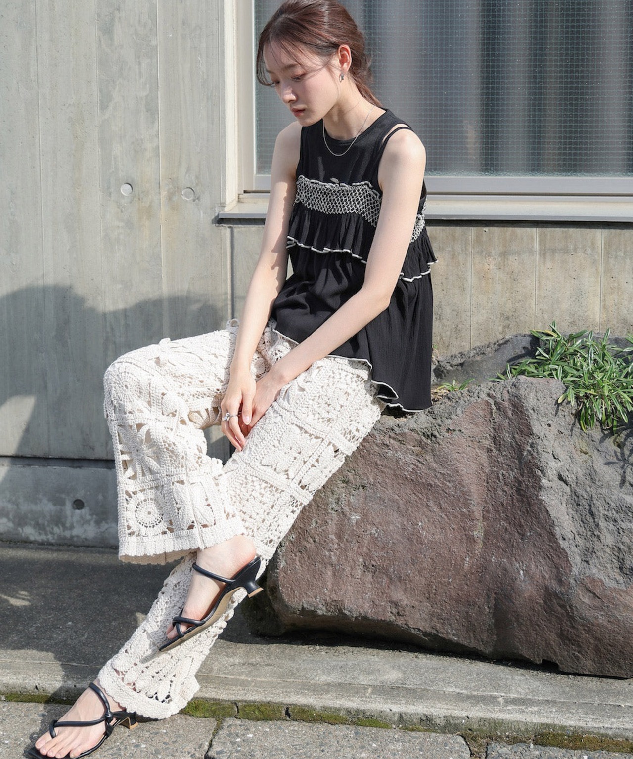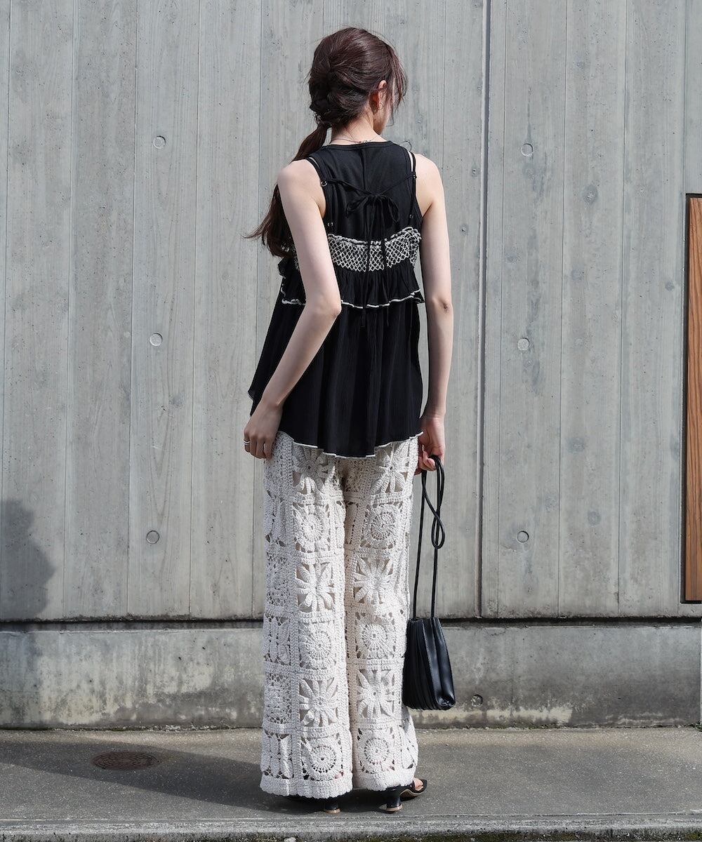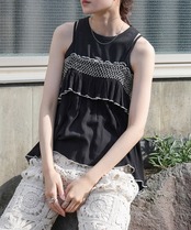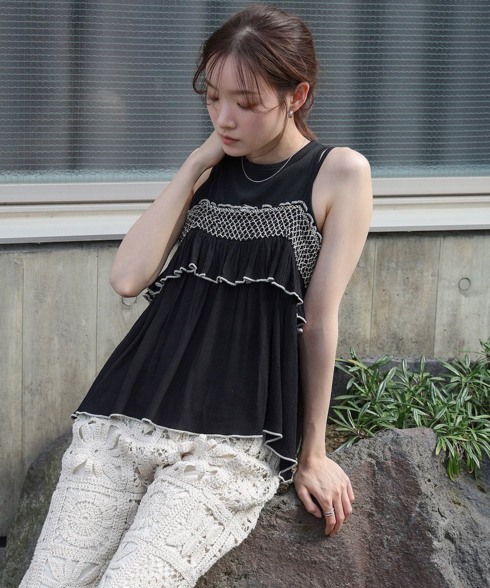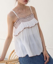 しわや凹凸感が特徴のクレープ生地を使用したキャミソール。胸元にあしらったスモッキング刺繍が顔周りを華やかにしてくれます。前後差のある丈感でティアードになっているのでウエスト周り、お尻周りもカバーしてくれます。トップスとしてもレイヤードとしても着回しの効くうれしいアイテムです。