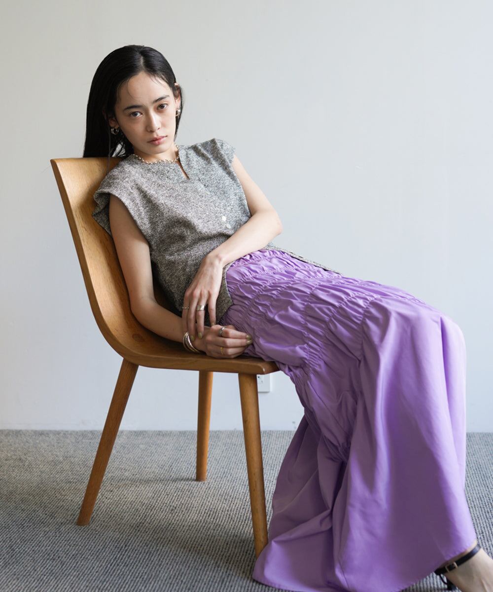 キャミソールをインすればフレンチスリーブのトップスとしてお召し頂けます。ボタンは下から2番目まで開けて頂くと、ウエストのシルエットを細く見せてくれるのでオススメです。