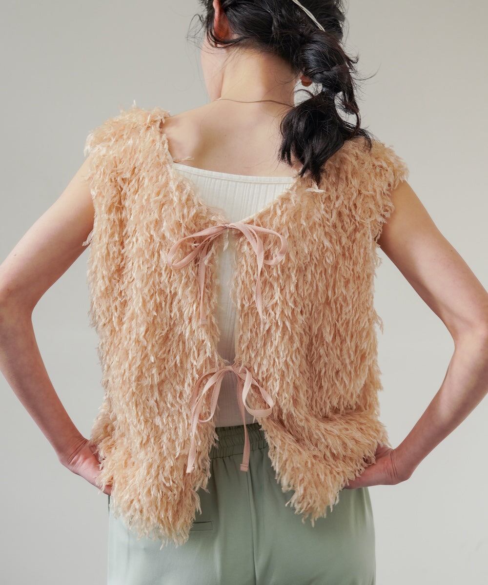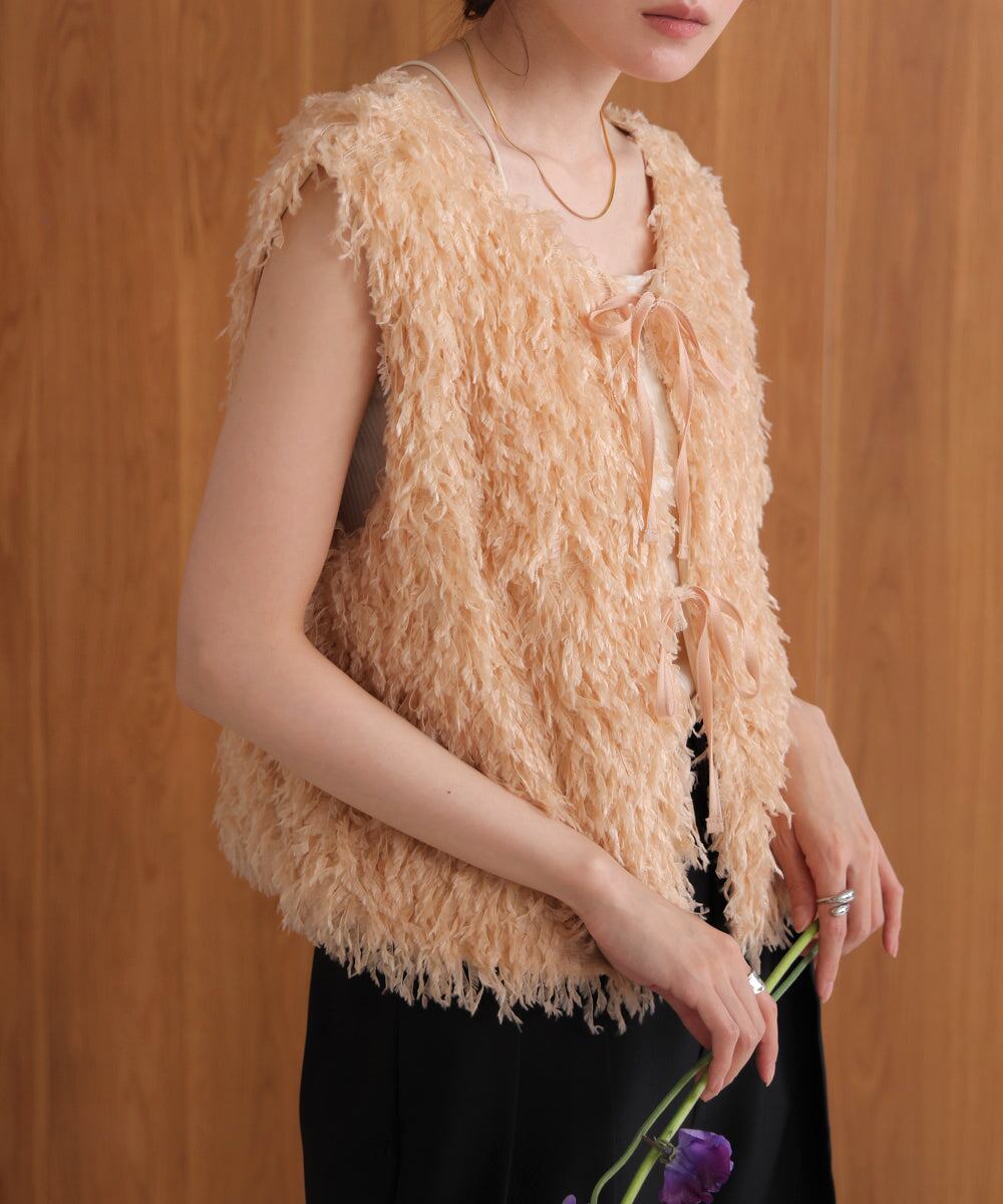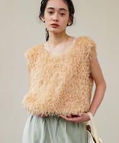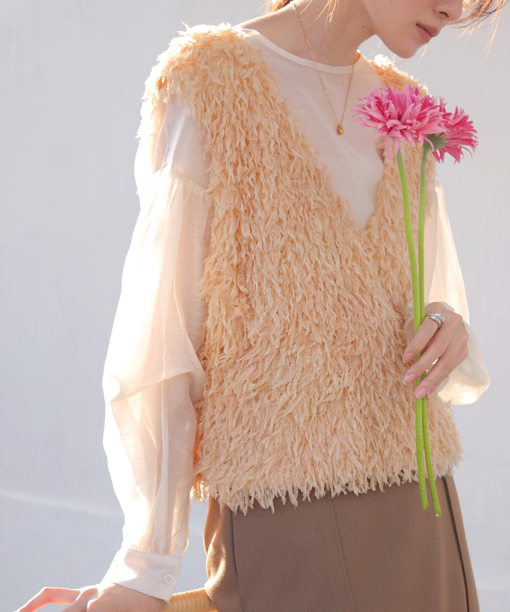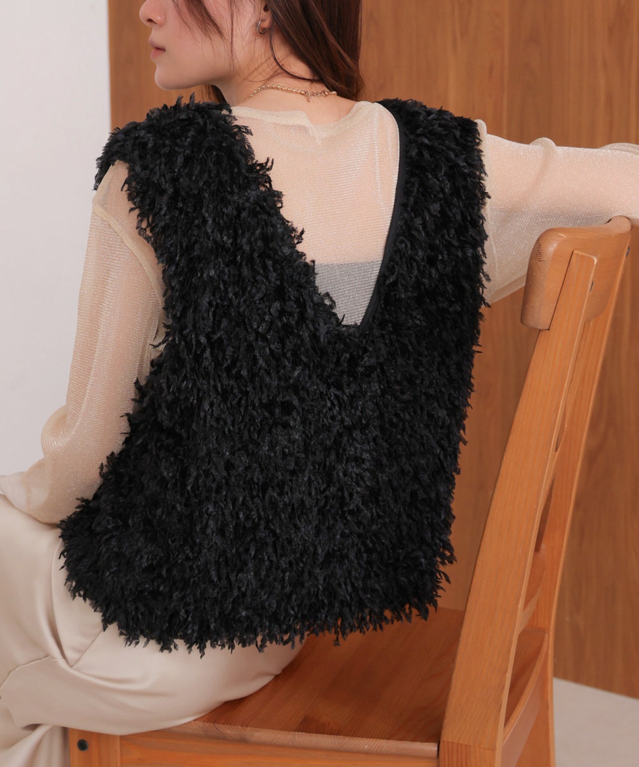 長めの毛足でコーディネートが映えるフリンジベストです。深めのVネックが全体をすっきりと見せてくれます。