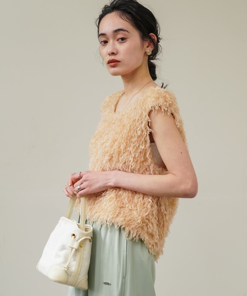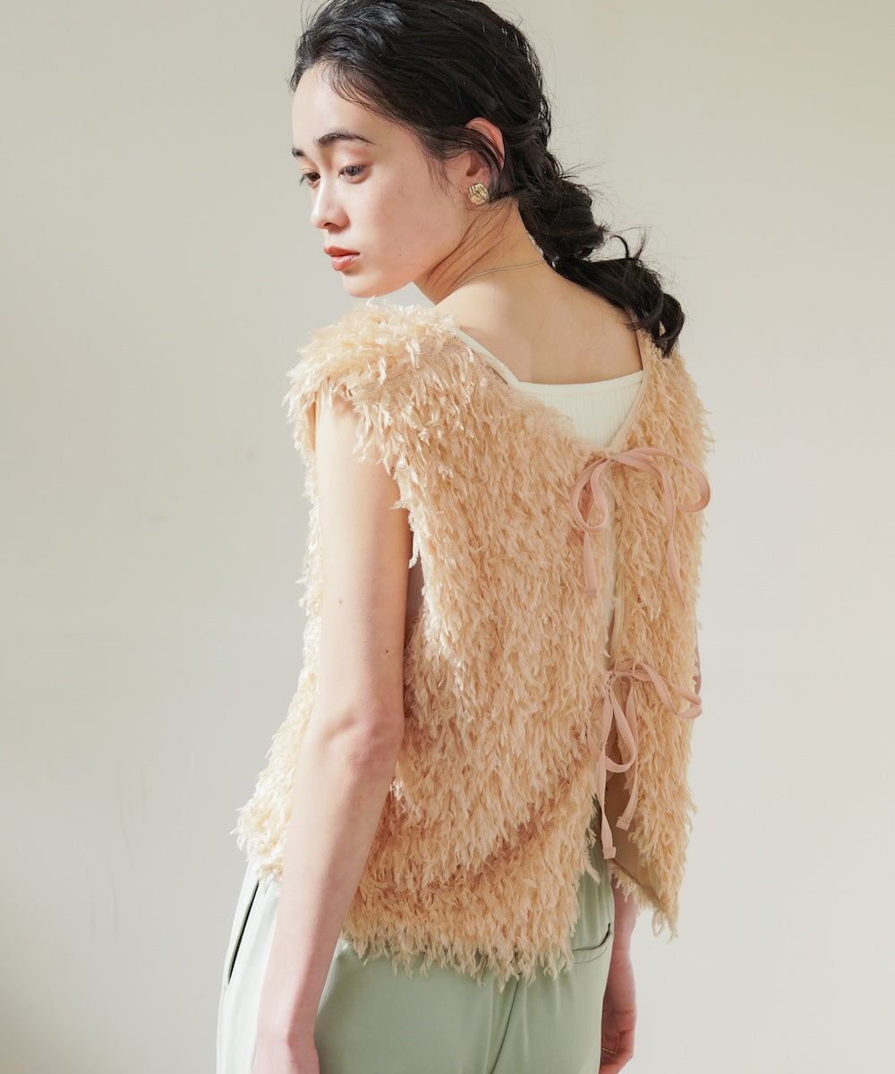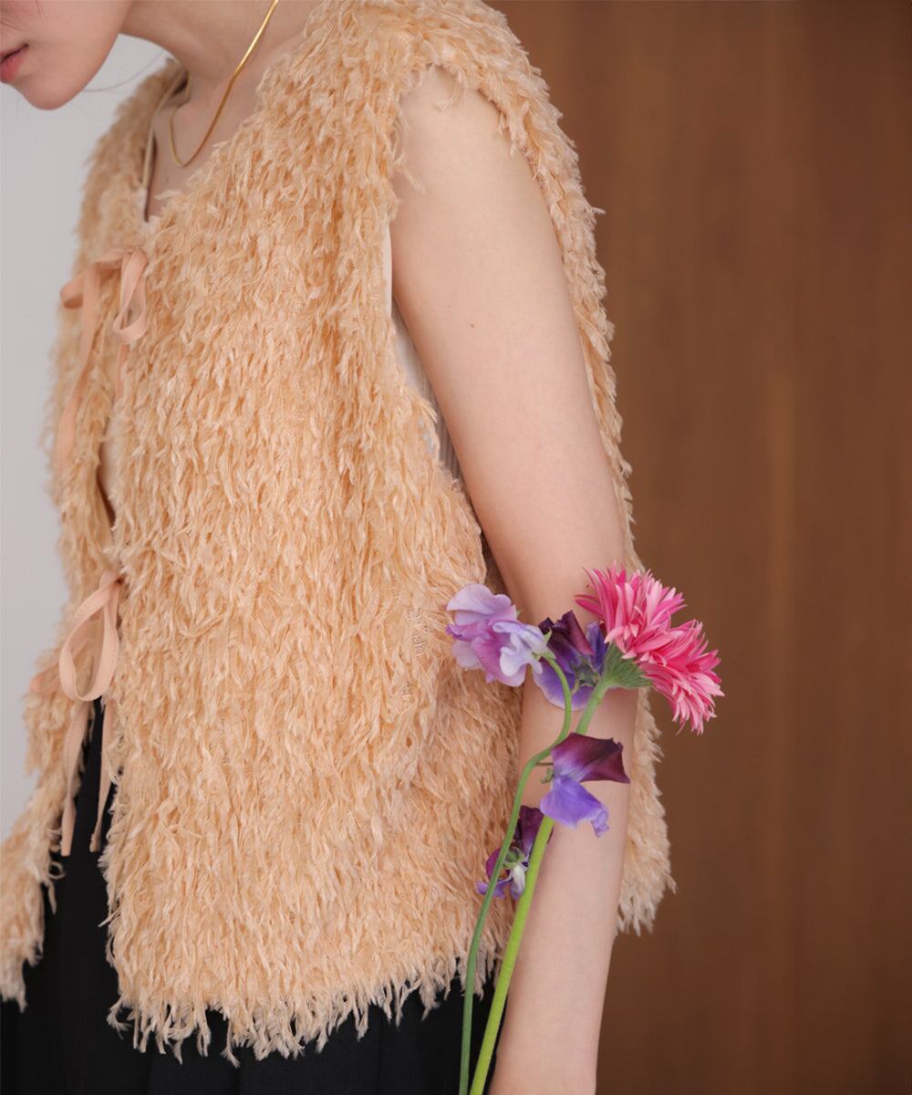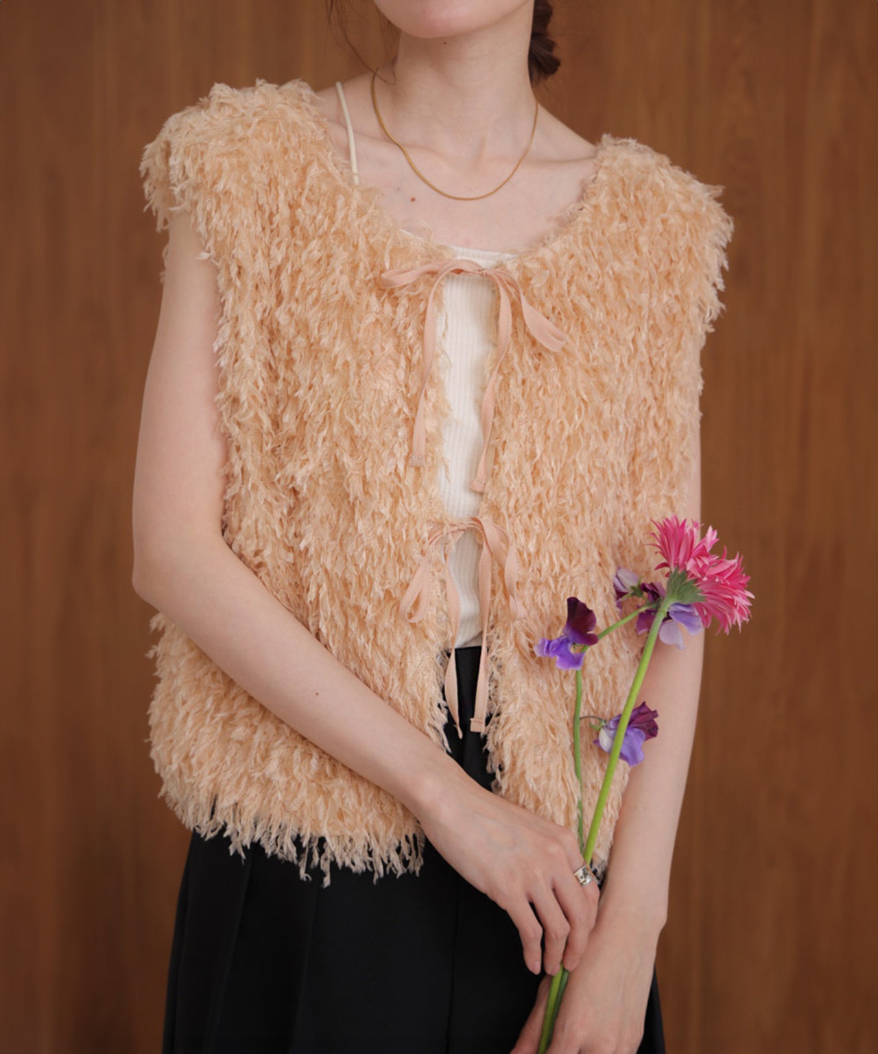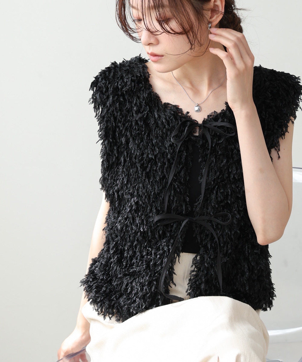長めの毛足でコーディネートが映えるフリンジベストです。深めのVネックが全体をすっきりと見せてくれます。