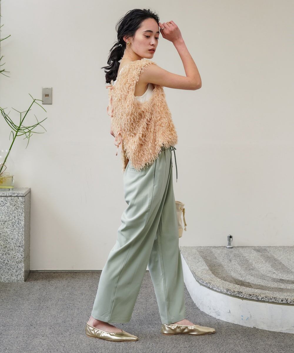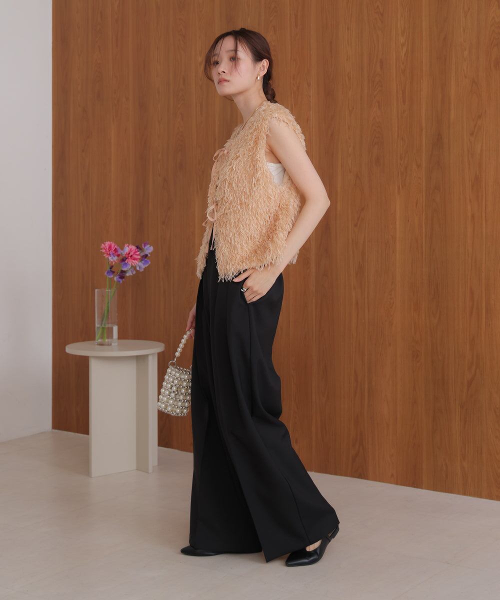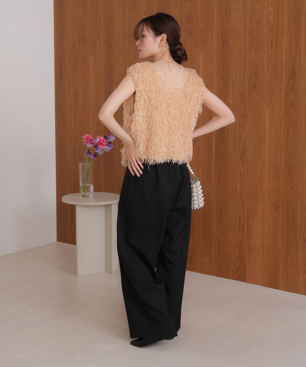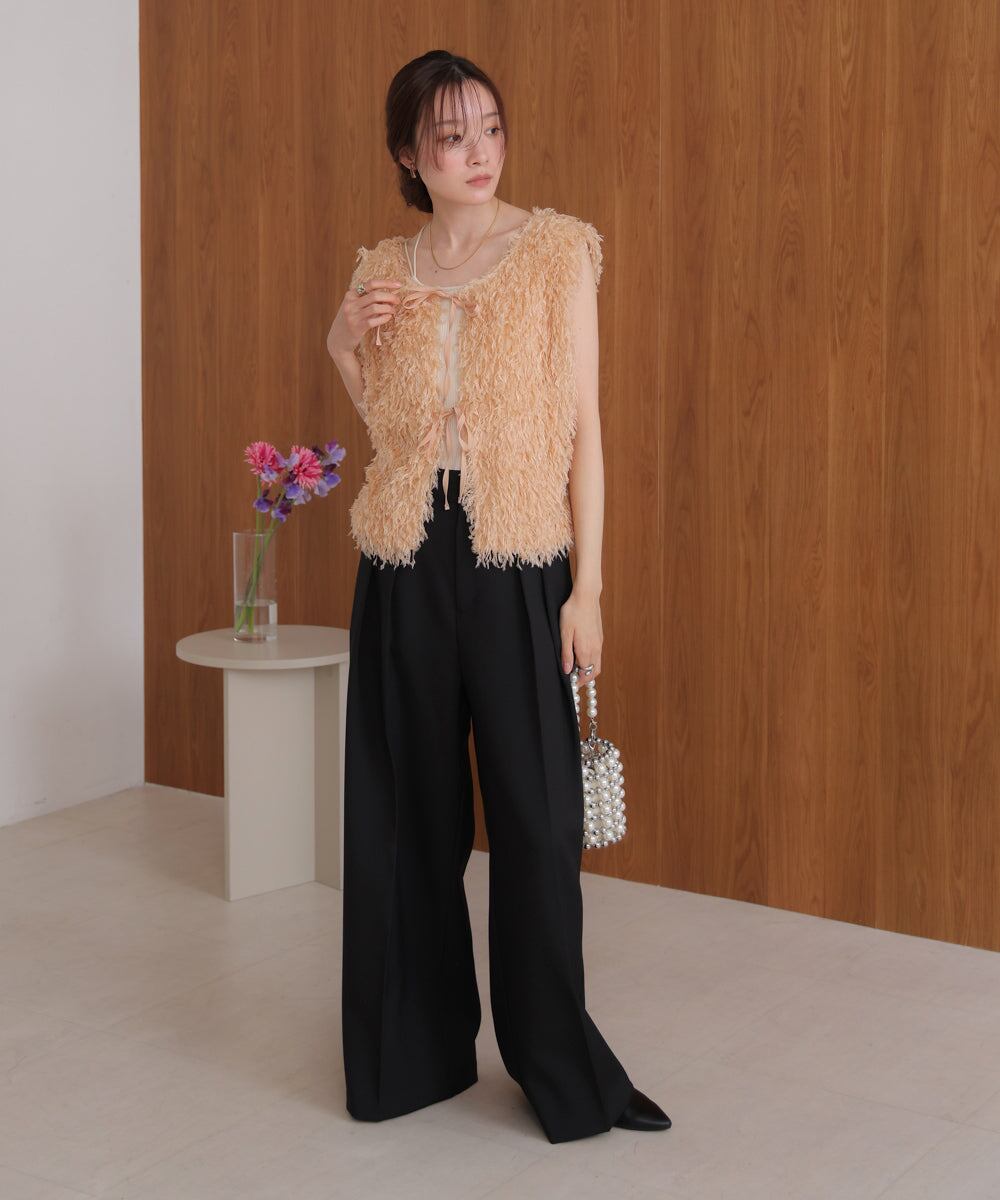 長めの毛足でコーディネートが映えるフリンジベストです。深めのVネックが全体をすっきりと見せてくれます。