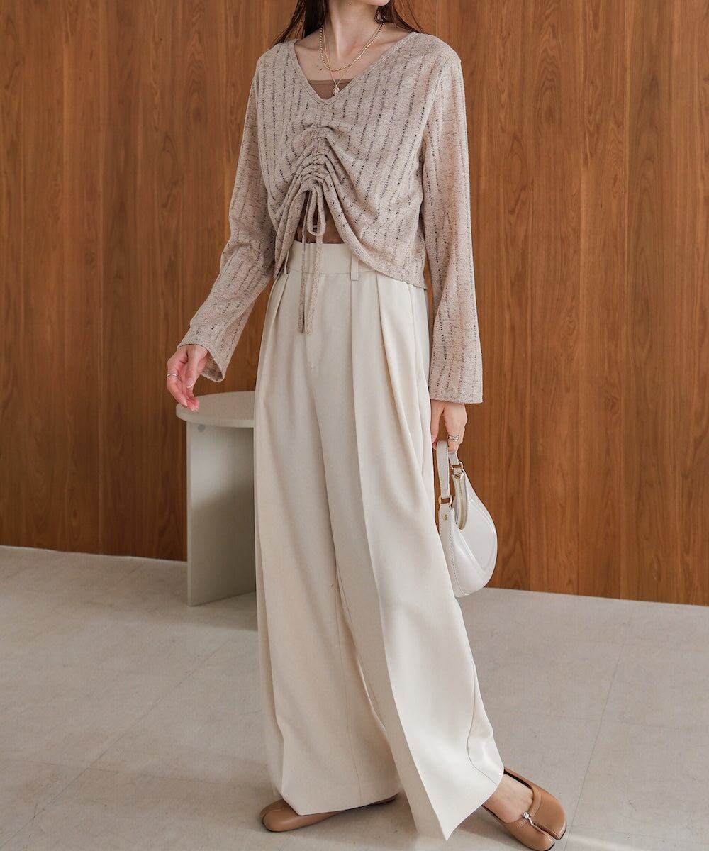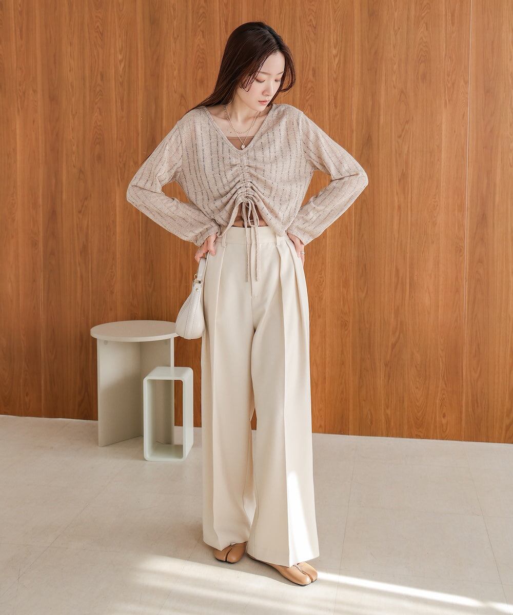 フロントのシャーリングを絞ることで、ショート丈のトップスとなるのでハイウエストのボトムとの相性が◎