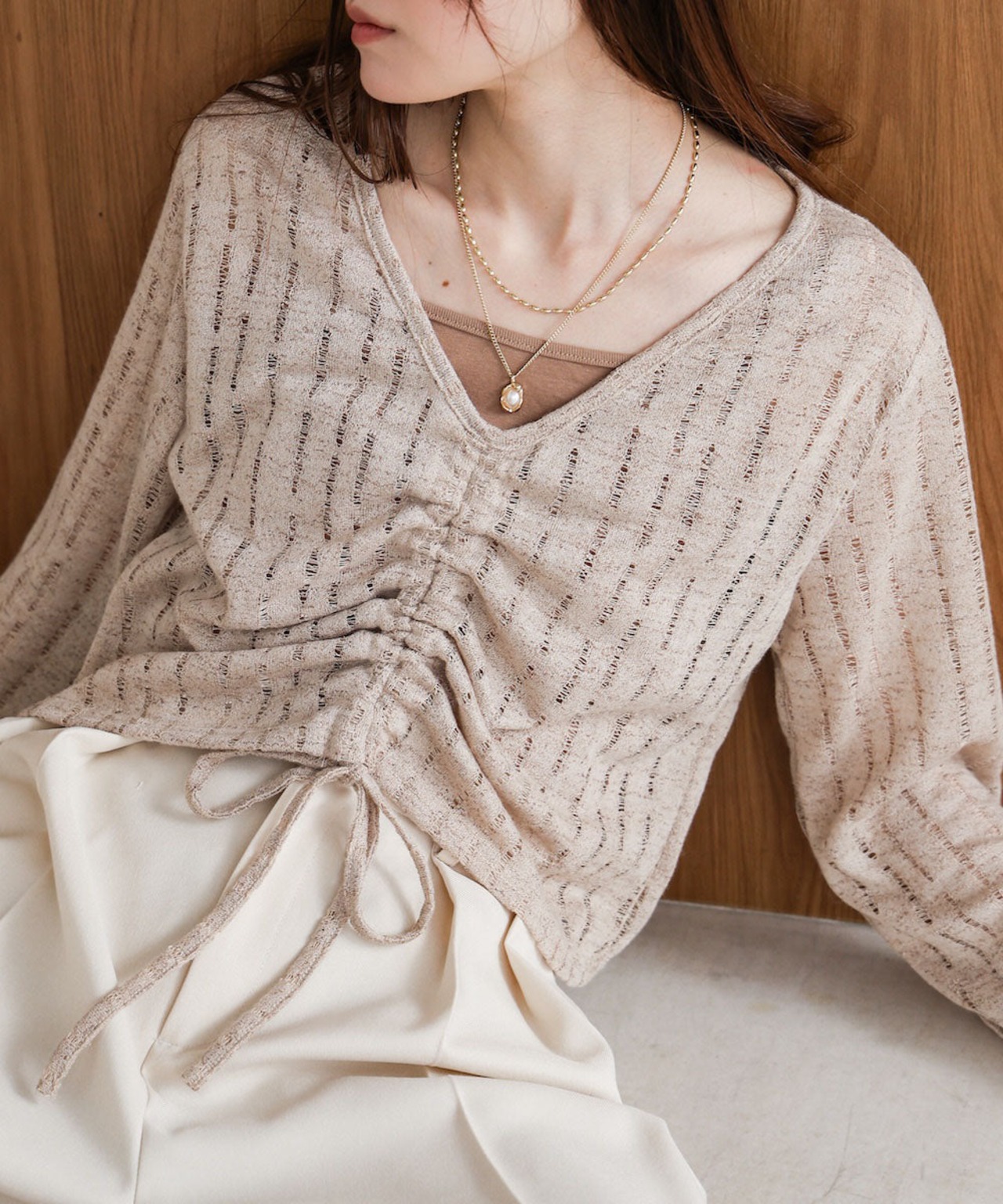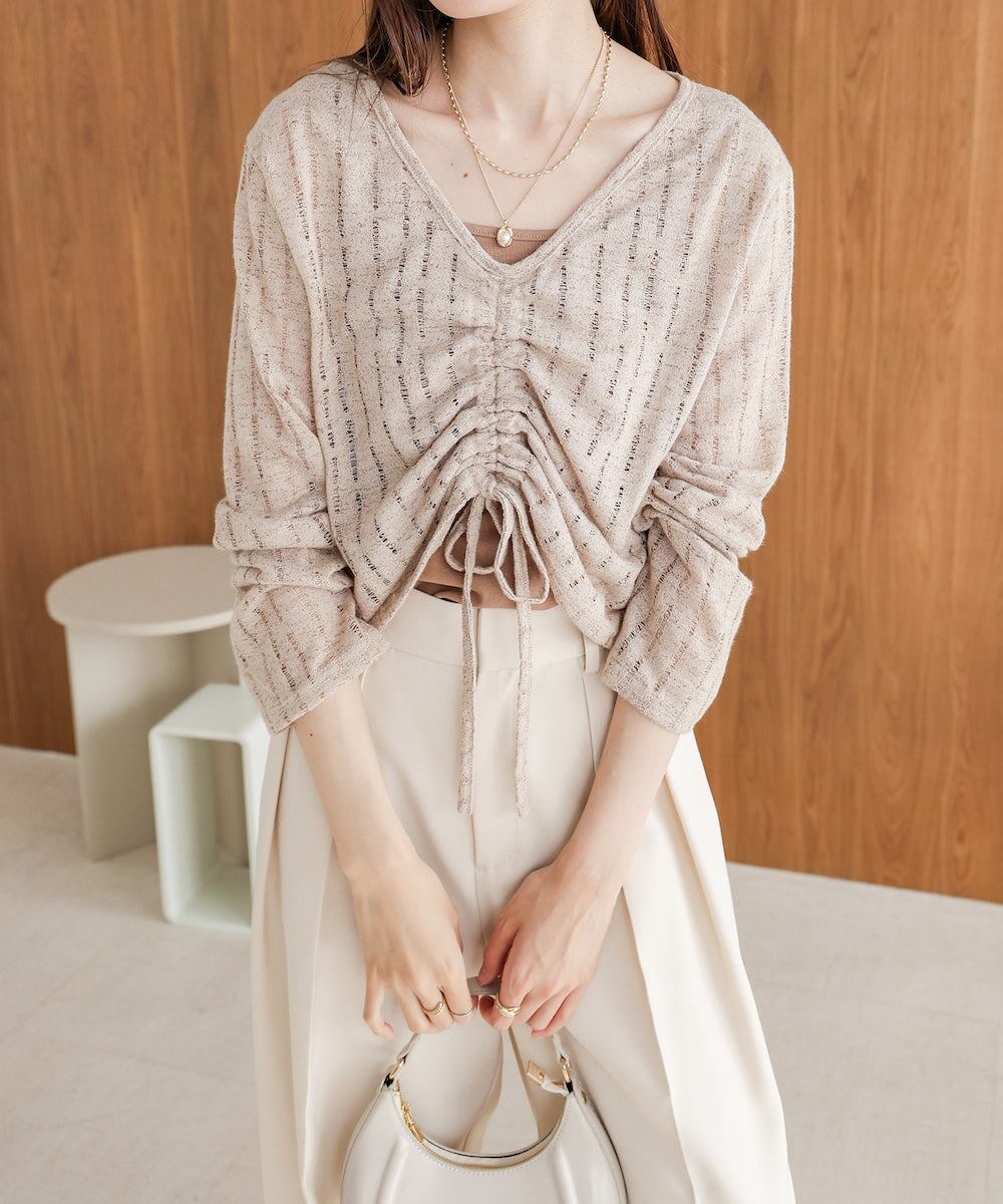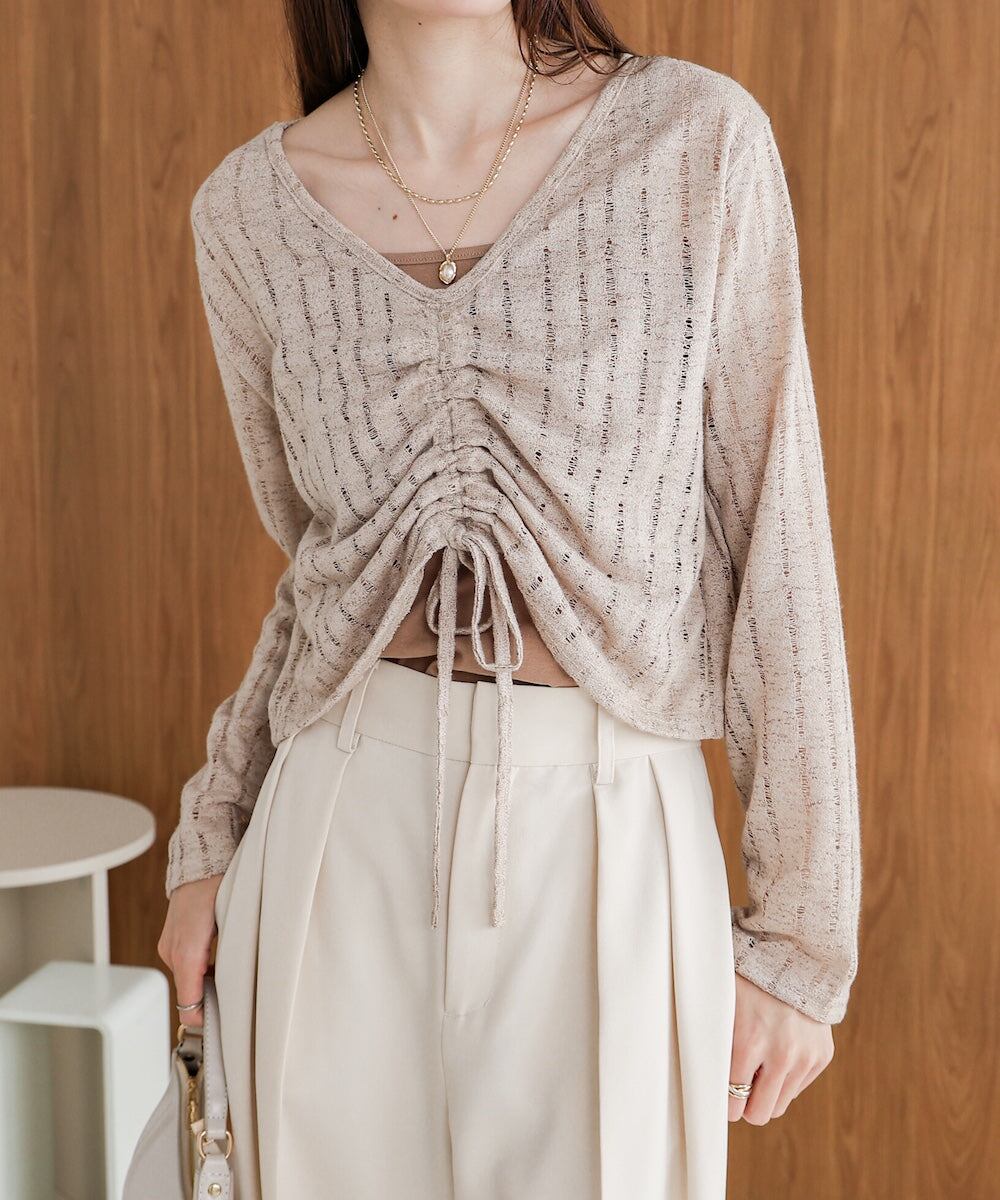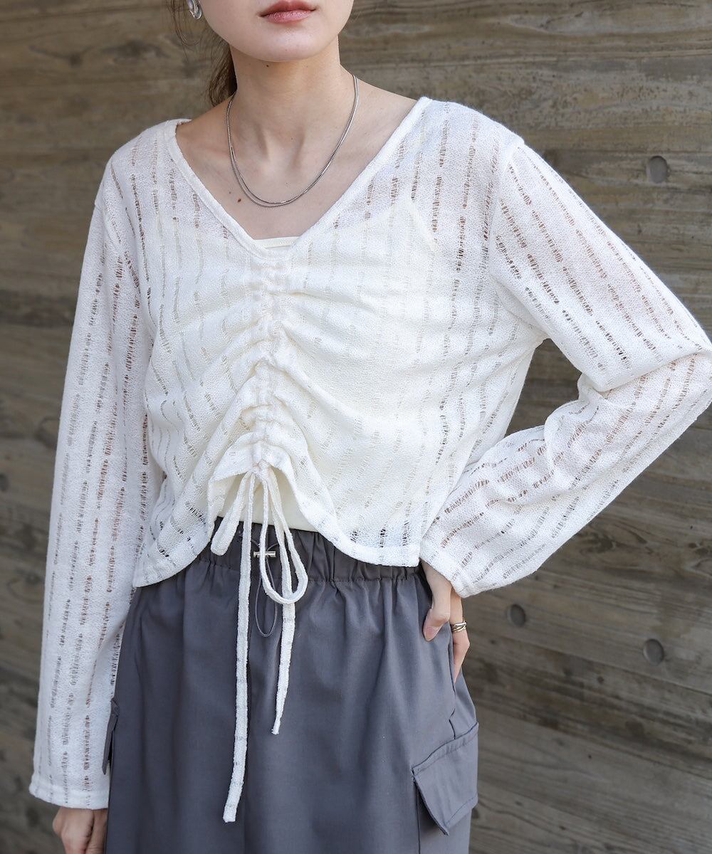 程よい透かし編みとフロントのシャーリングがアクセントになったトレンド感のあるトップスが仲間入り。