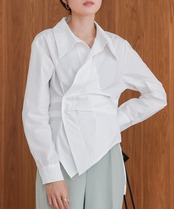 右サイドでボタンを留めて頂くカシュクールの仕様で、ウエストにあしらわれたタックが華奢見えを強調します。