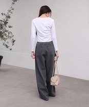落ち着いたトーンのパンツを合わせることで、大人っぽい雰囲気が演出できます。ロングスカートとのコーディネートは、上品さとシンプルながらも洗練された印象を与えます。