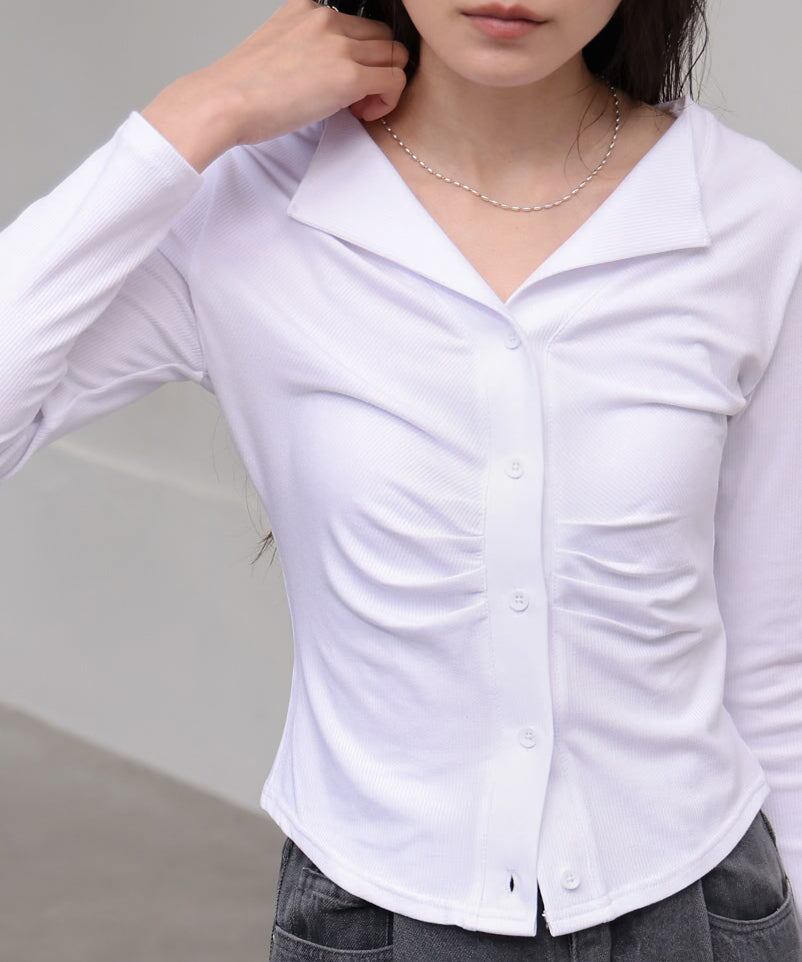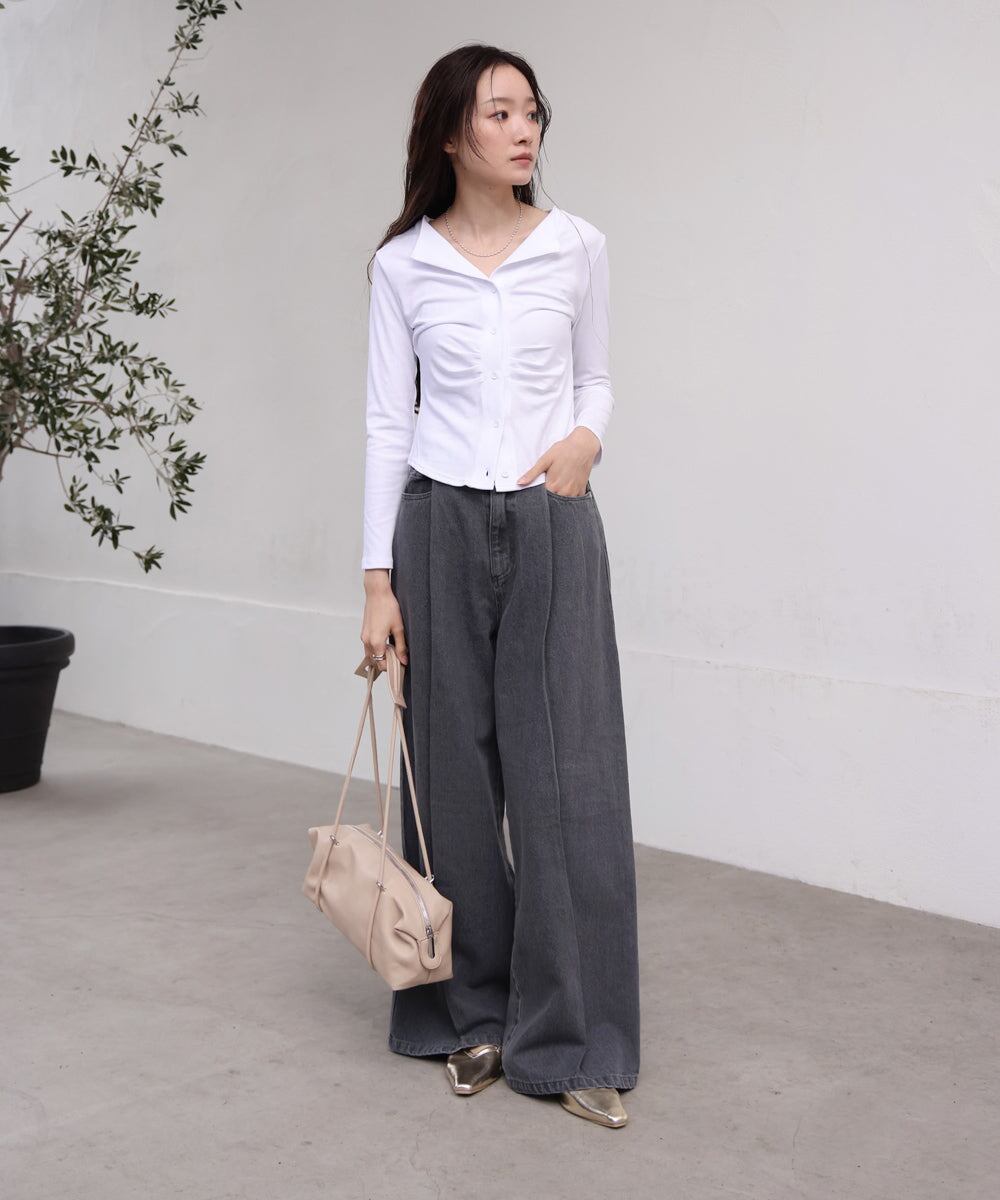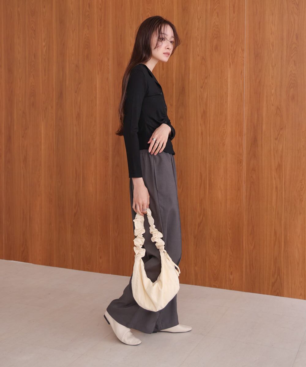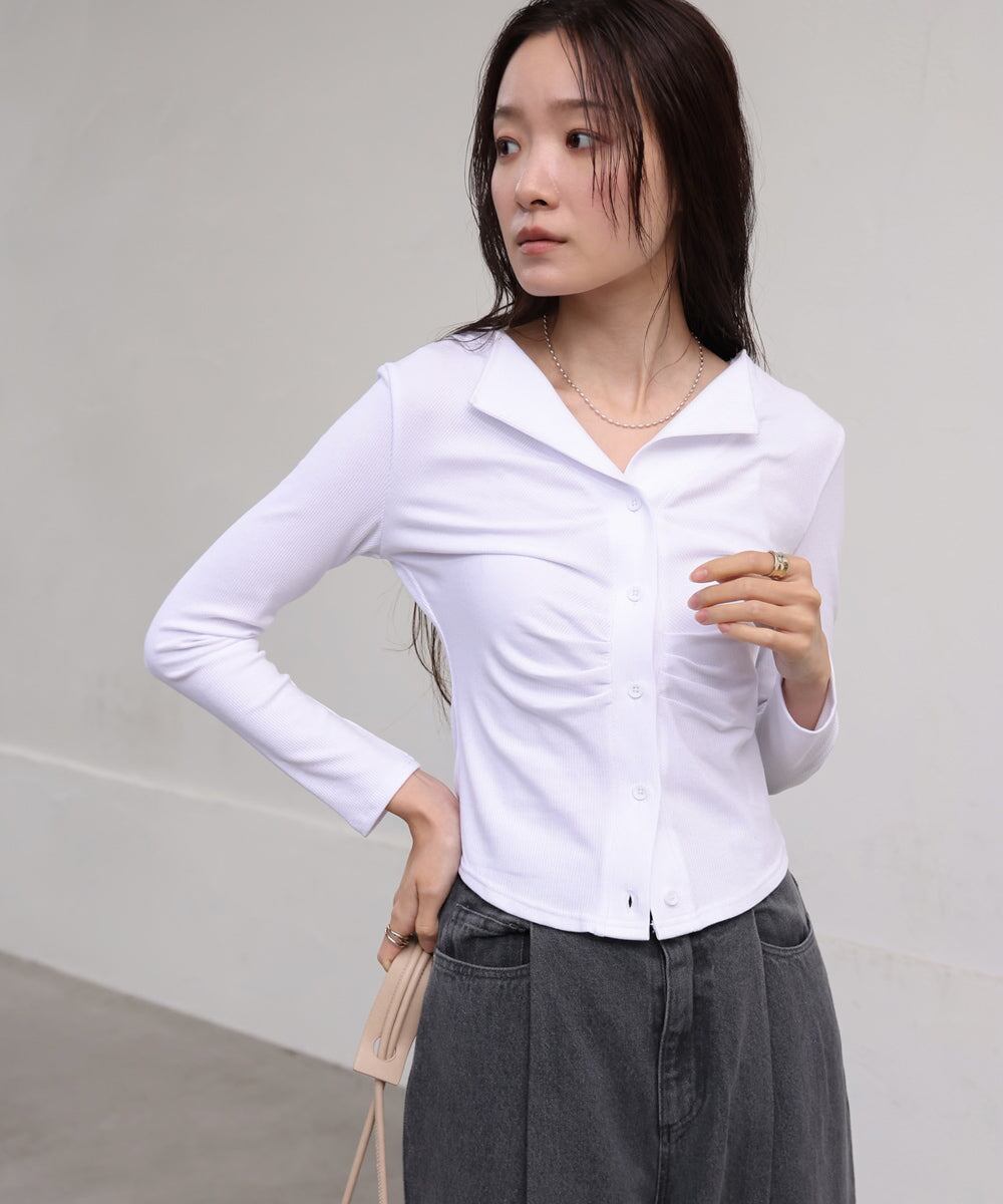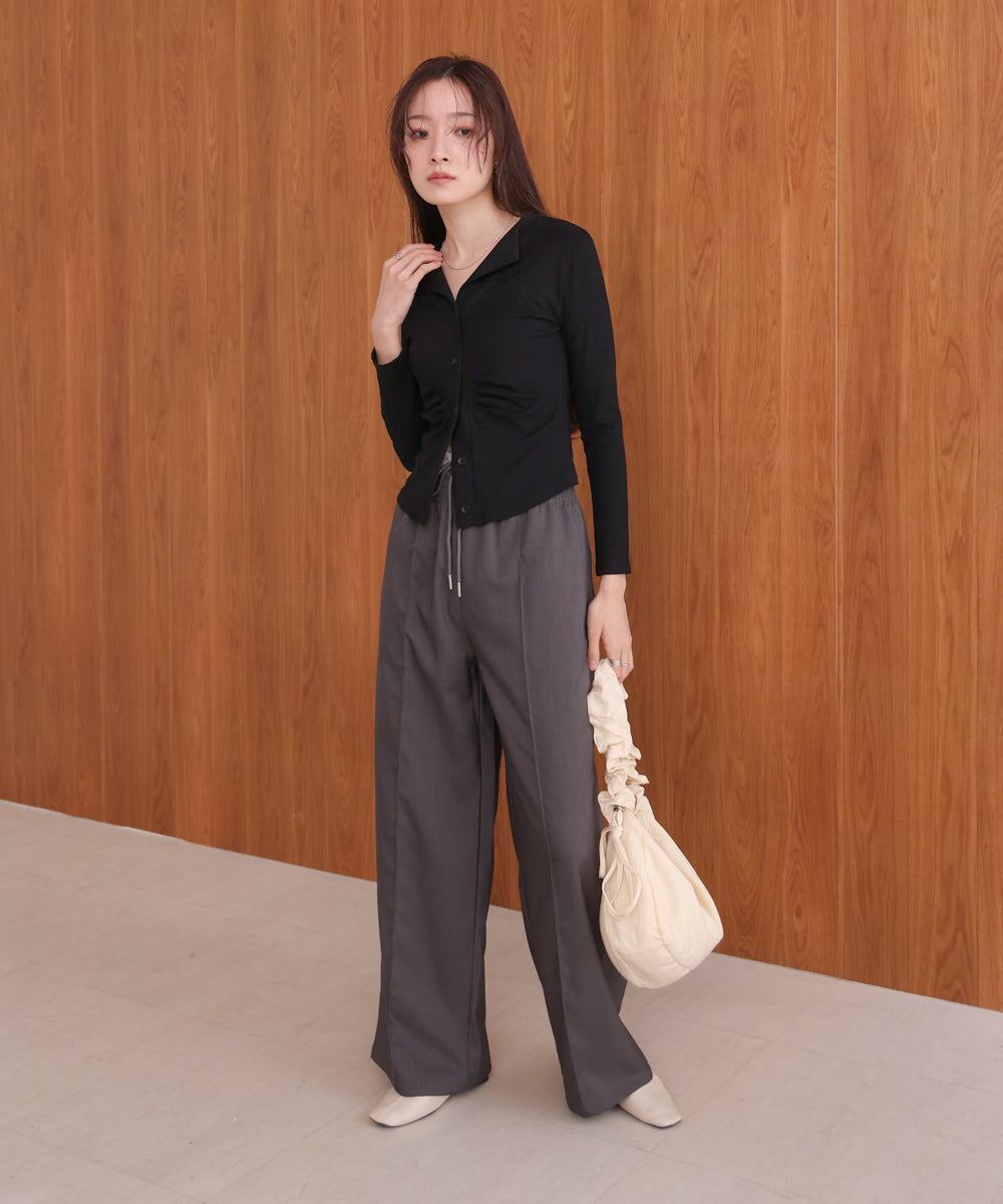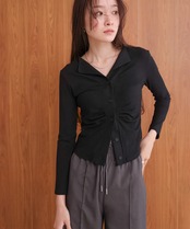 フロントギャザーがタイトシルエットを演出しボディラインを綺麗に見せてくれるアイテムです。