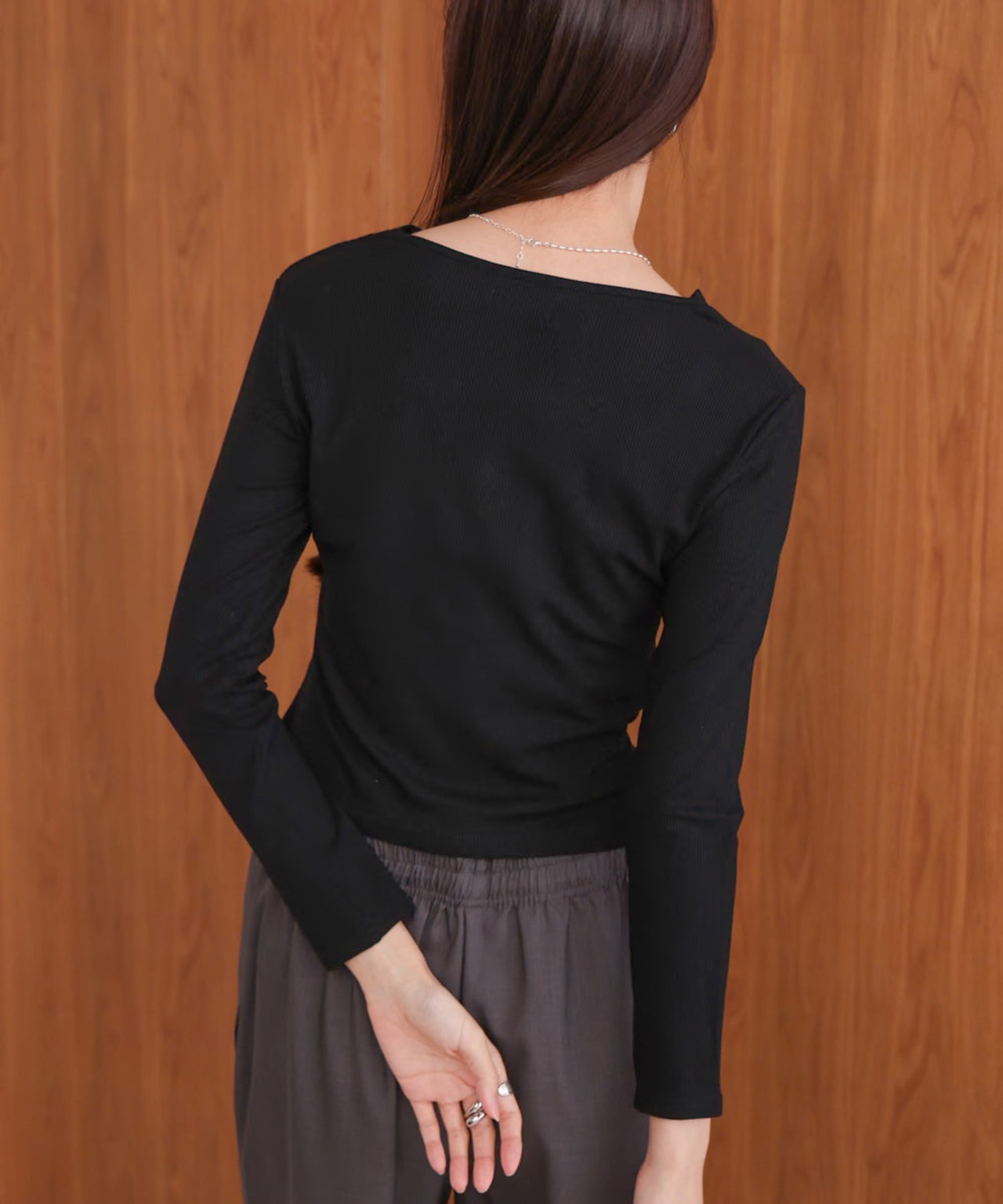 襟ぐりがVネックでデコルテが美しく見え女性らしさを引き立たてます。