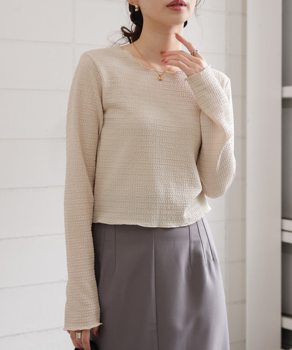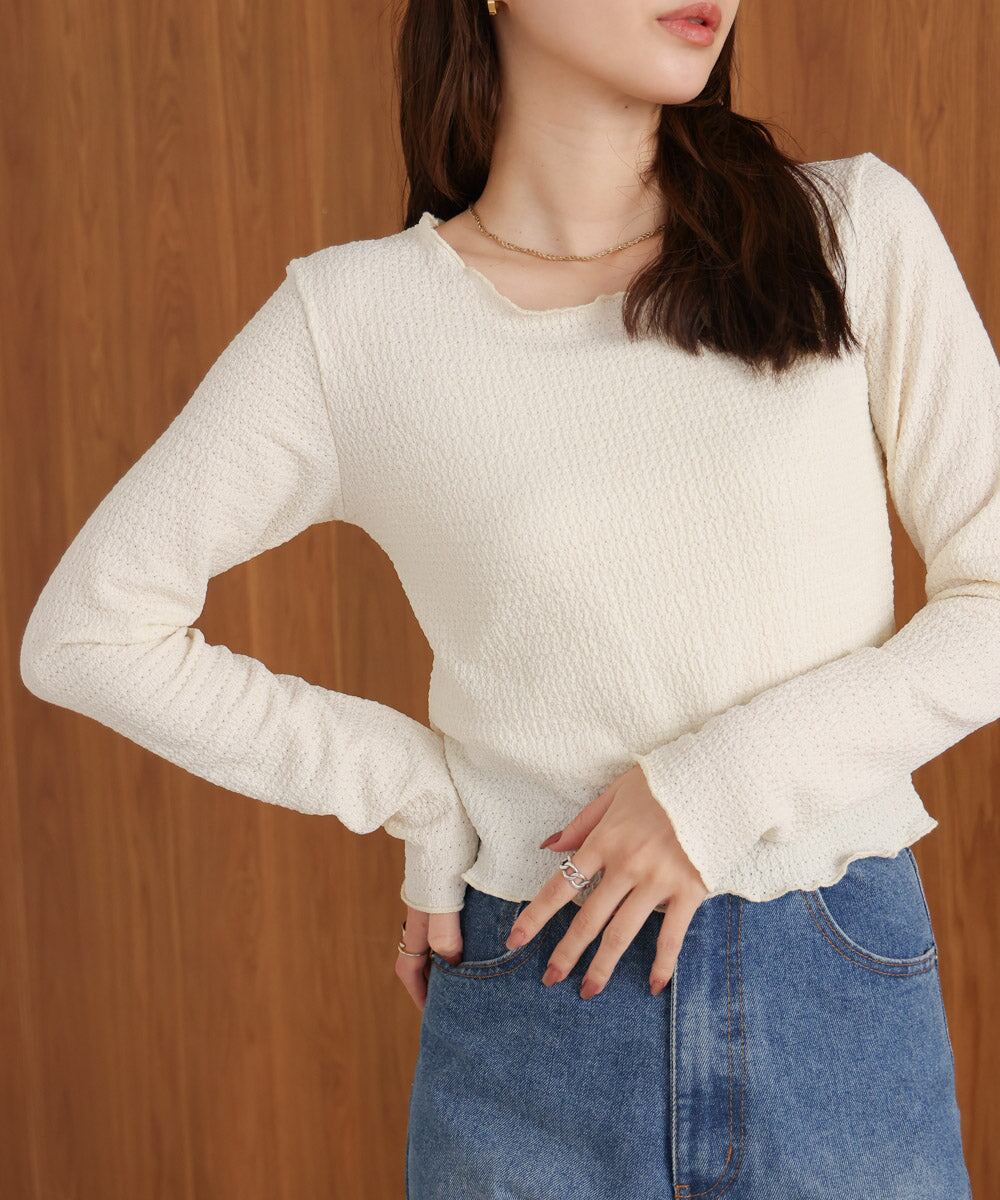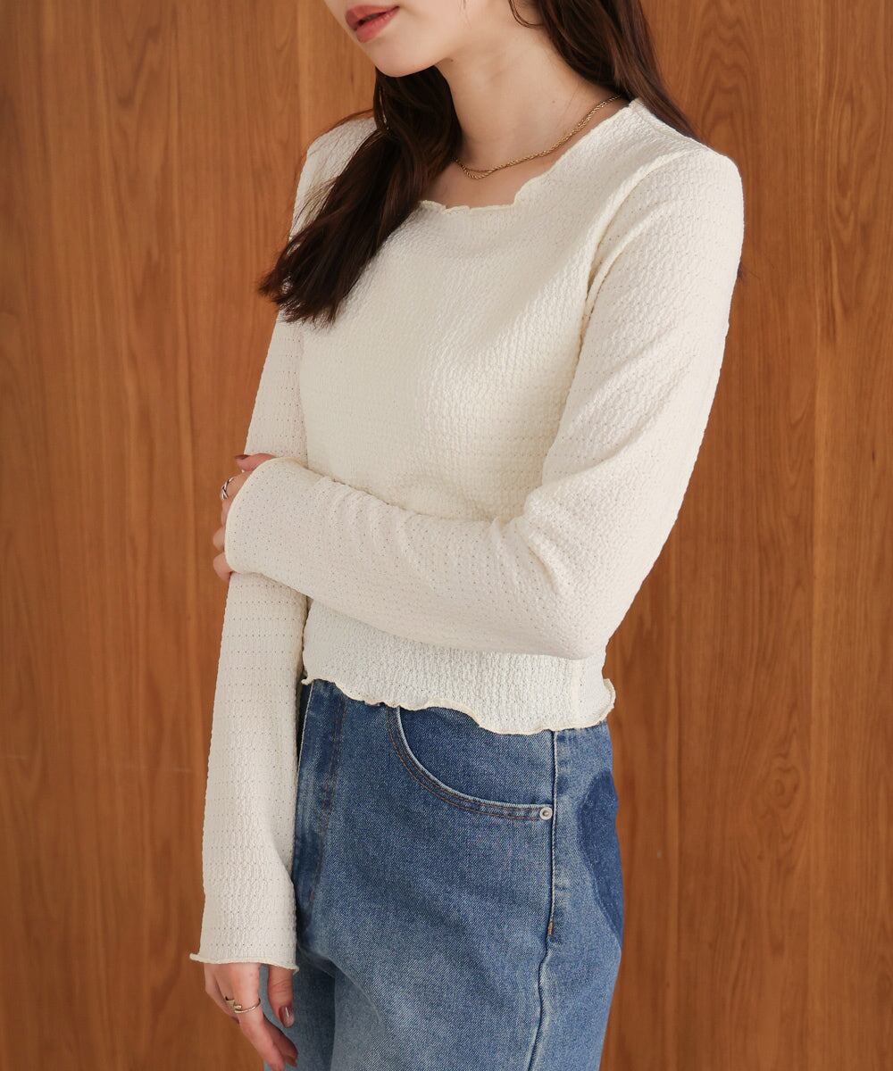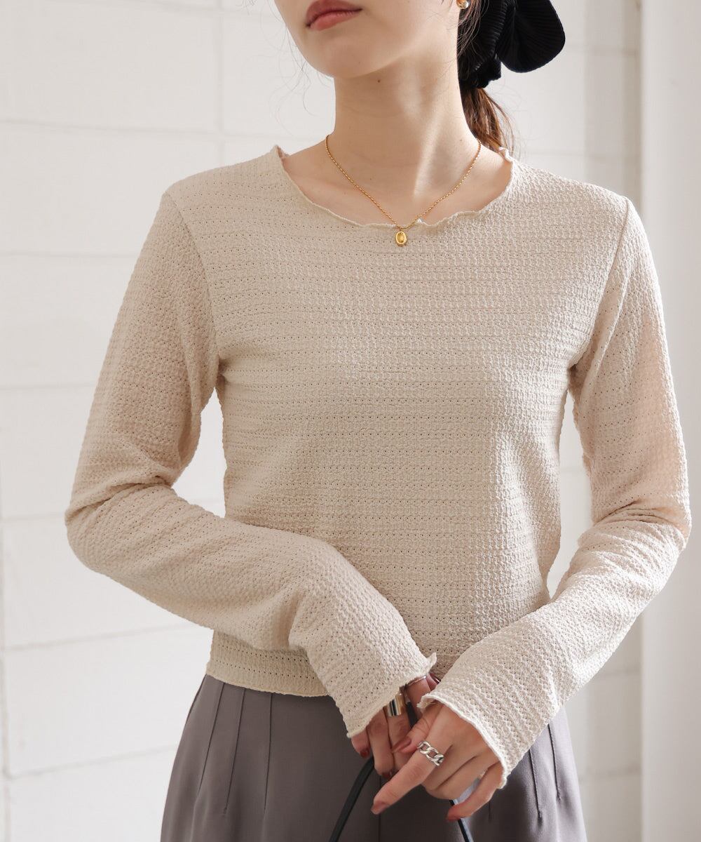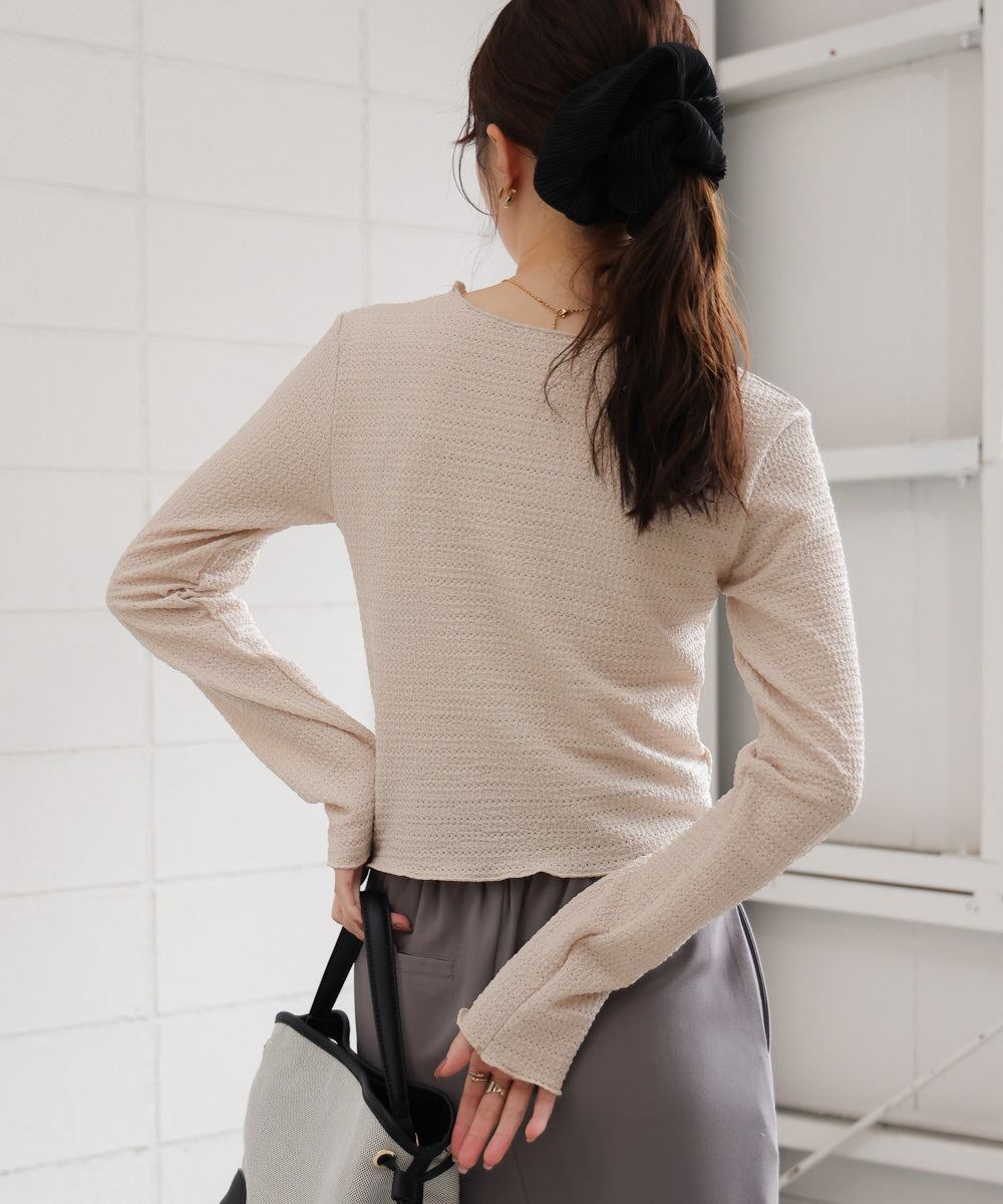 表面感のあるポコポコとした素材に、さりげなくメロウがほどこされたトップス。