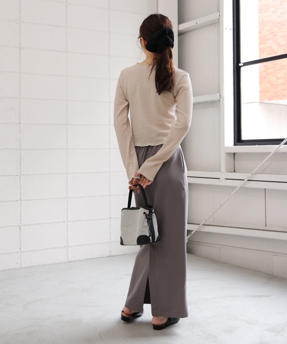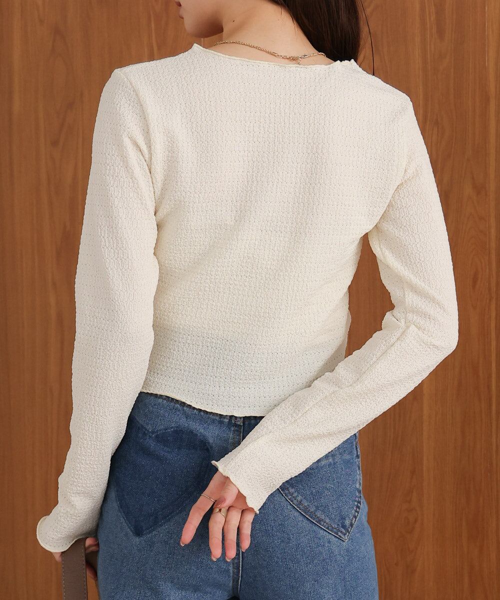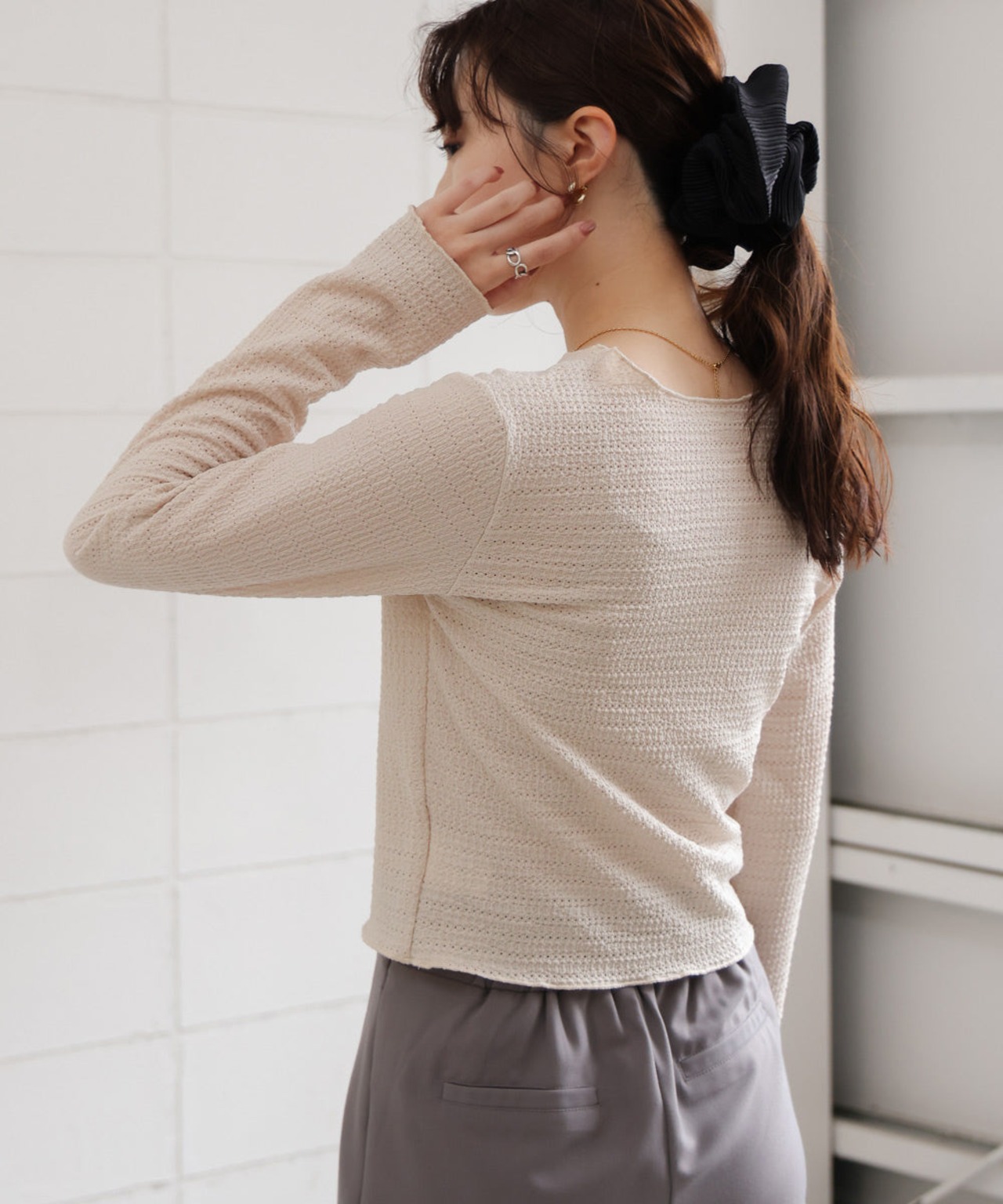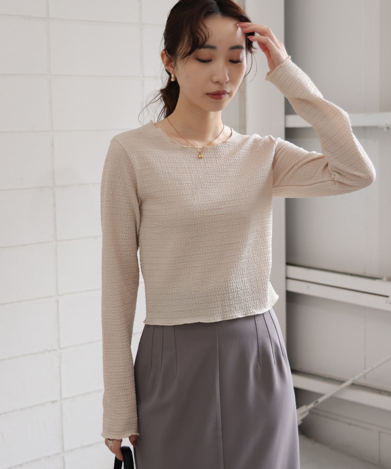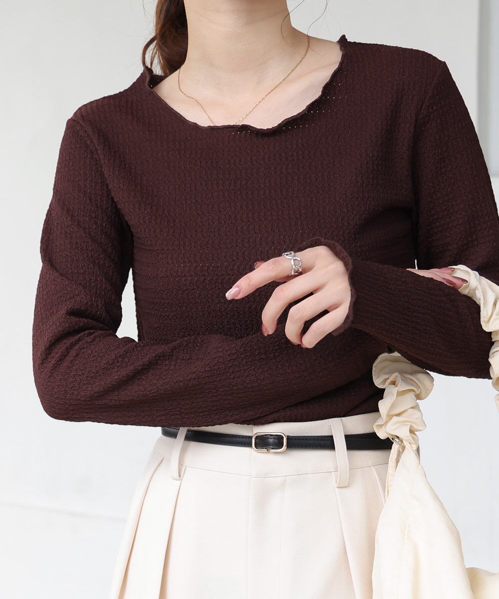 表面感のあるポコポコとした素材に、さりげなくメロウがほどこされたトップス。
