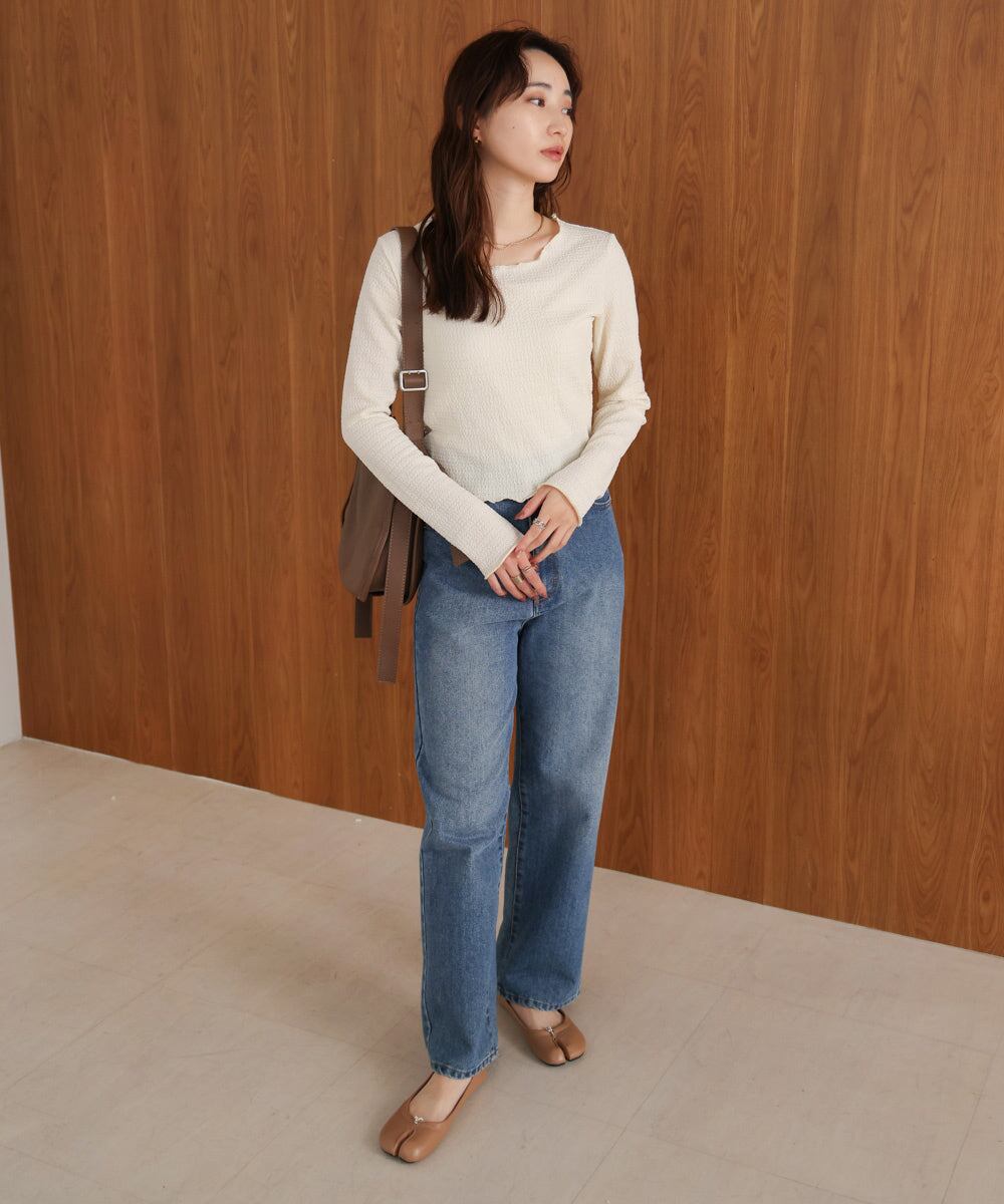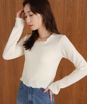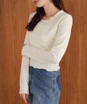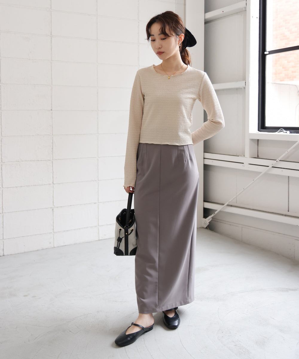 表面感はあるものの、体に優しくフィットするのでワンピースやカーディガンなどのインナーにも幅広く着まわせる万能トップスです。