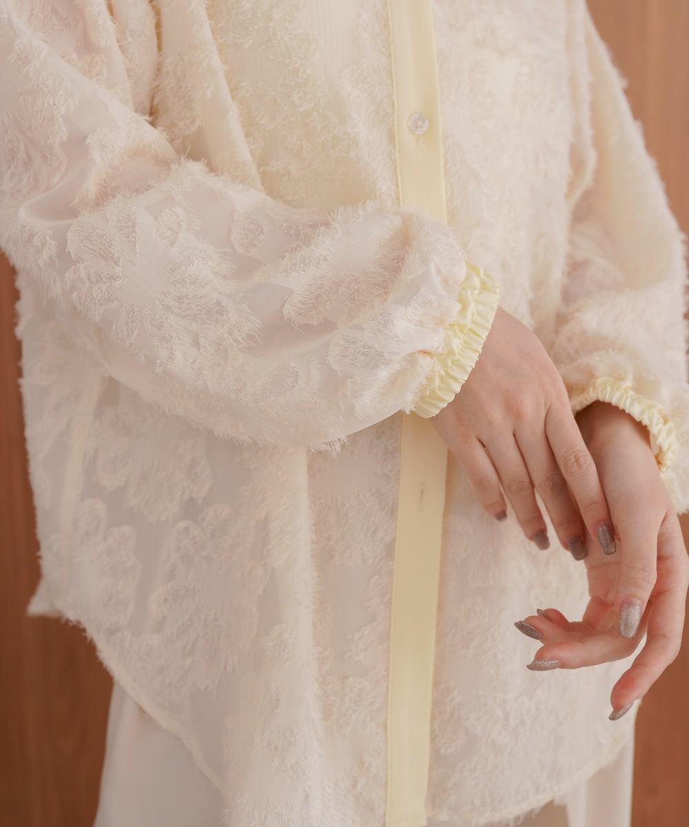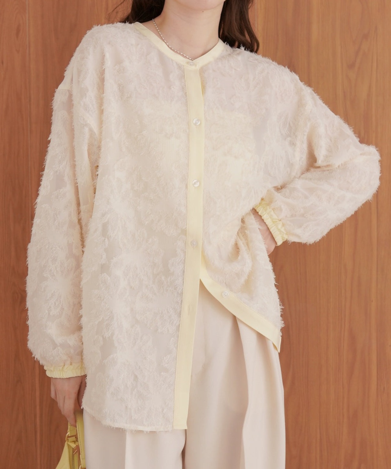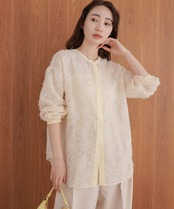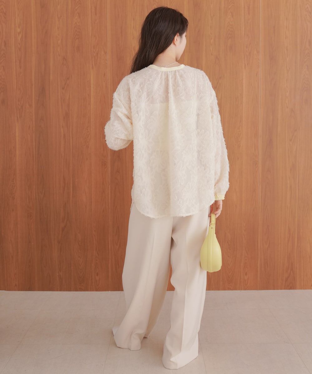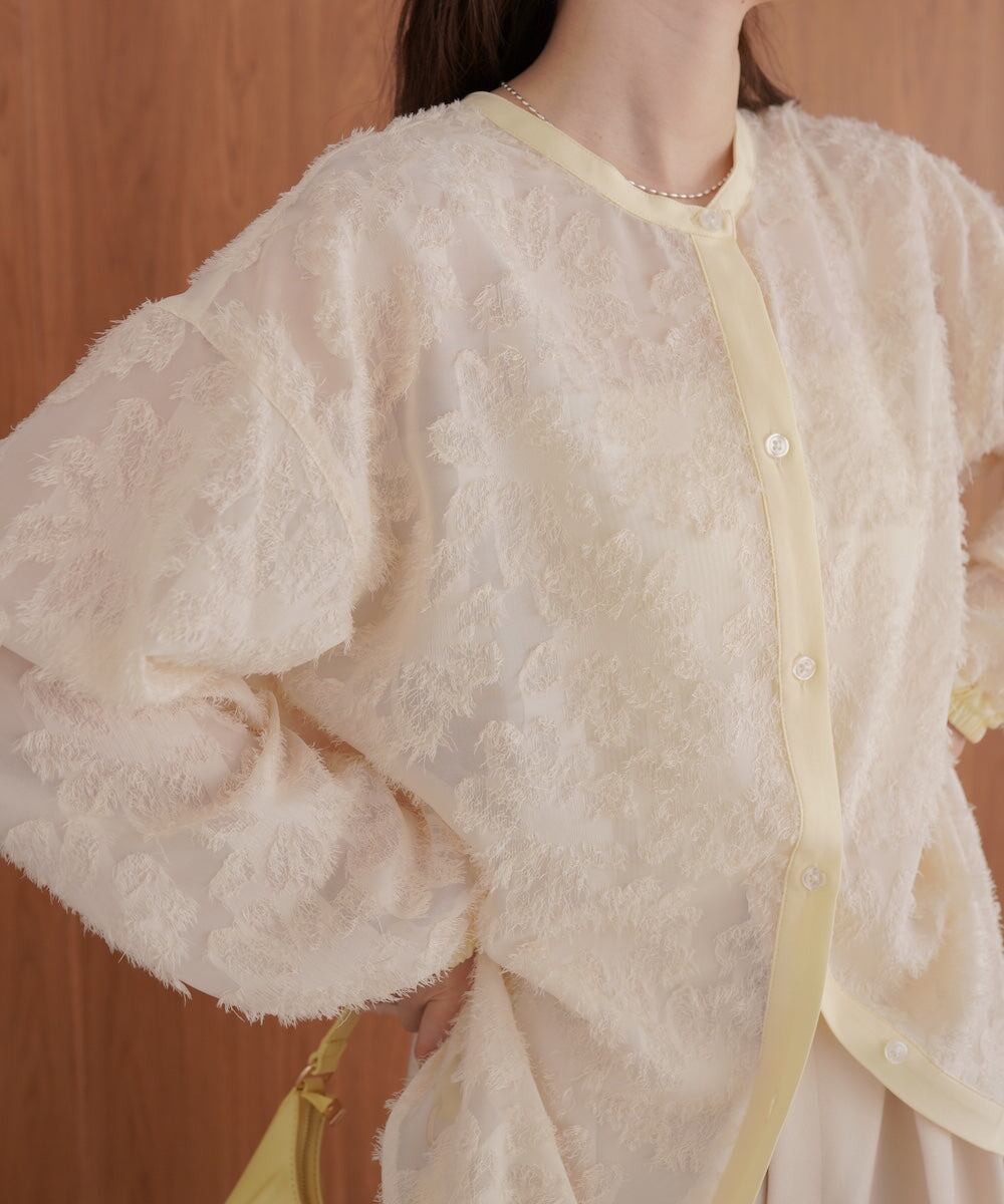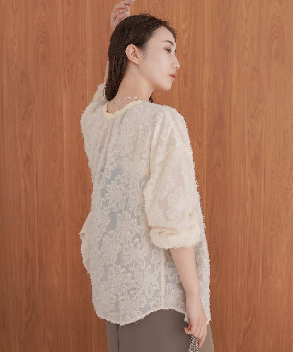 フェザー調で繊細なジャガード織りと柔らかい花柄がアクセントのブラウス。
