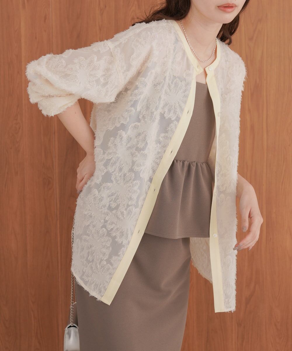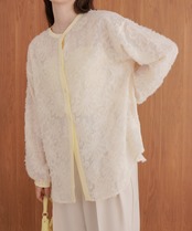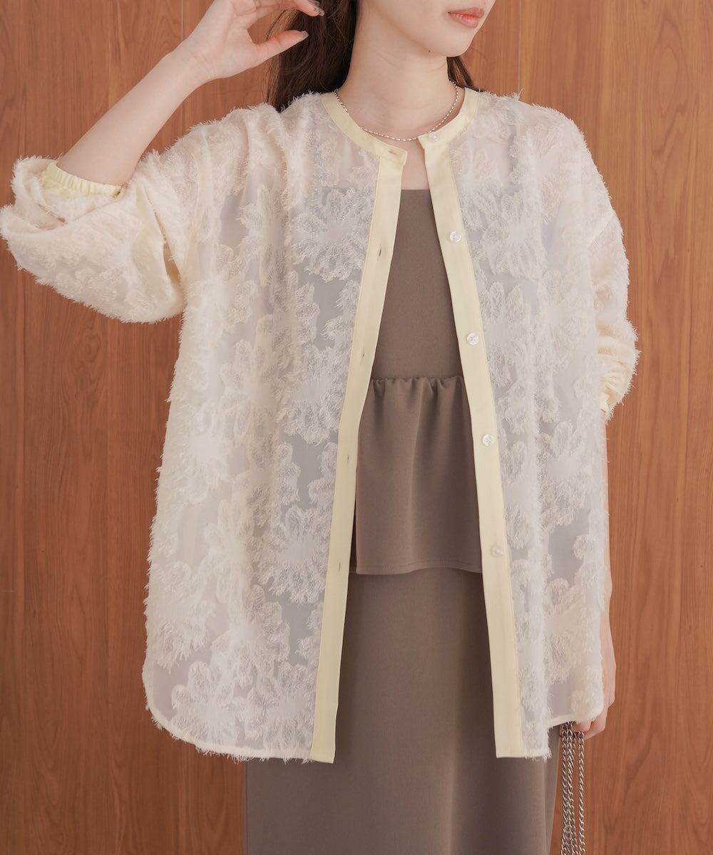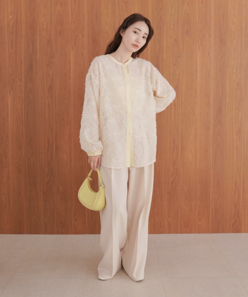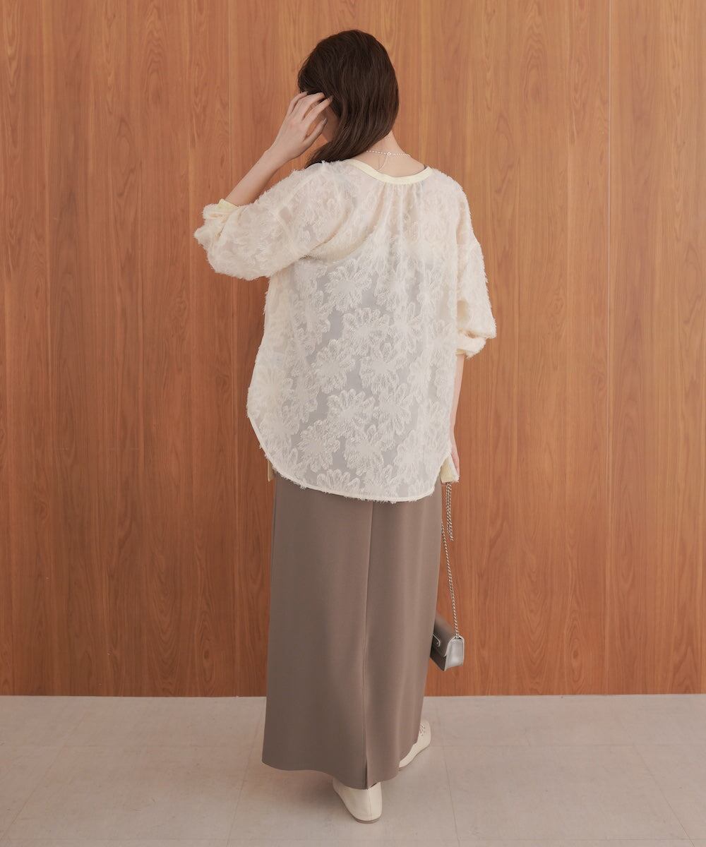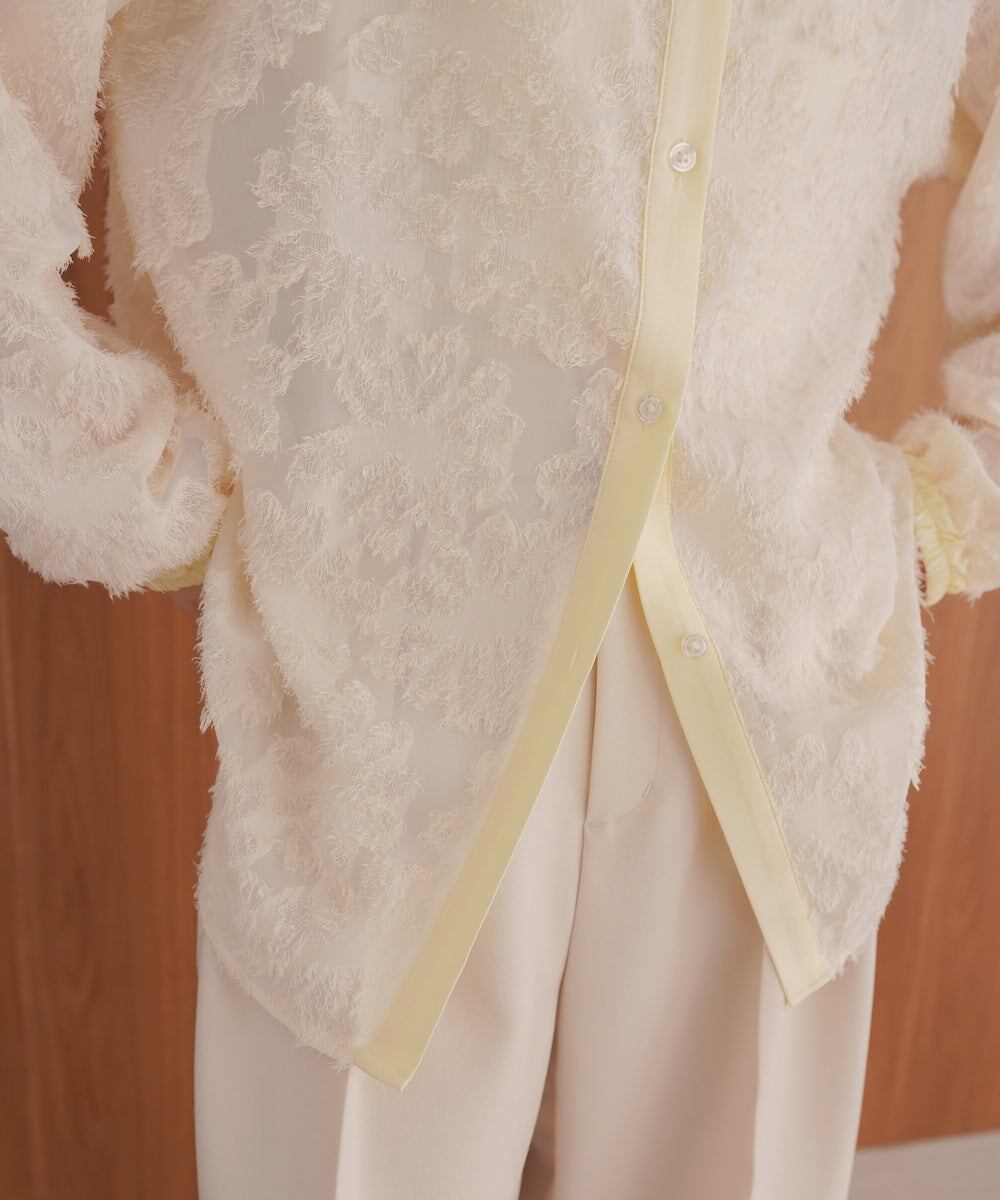 フェザー調で繊細なジャガード織りと柔らかい花柄がアクセントのブラウス。