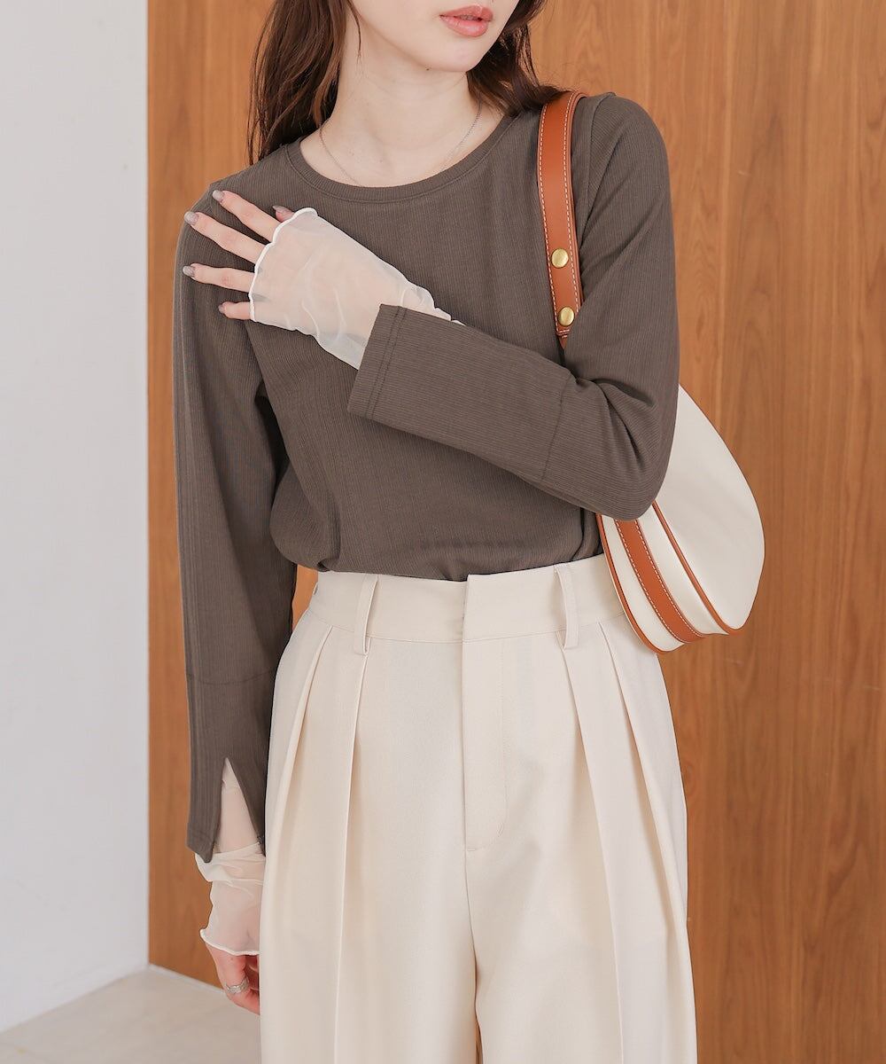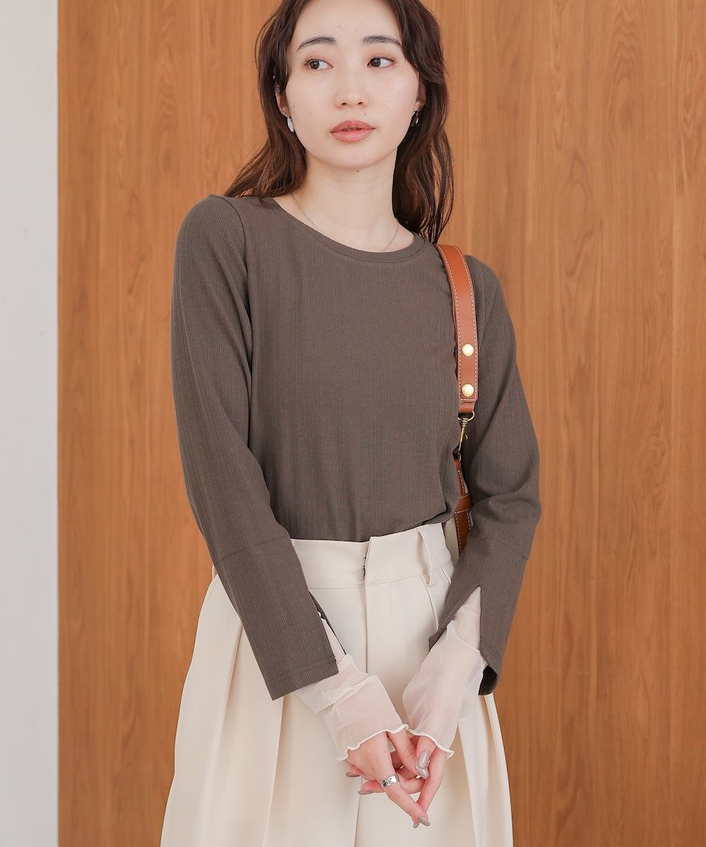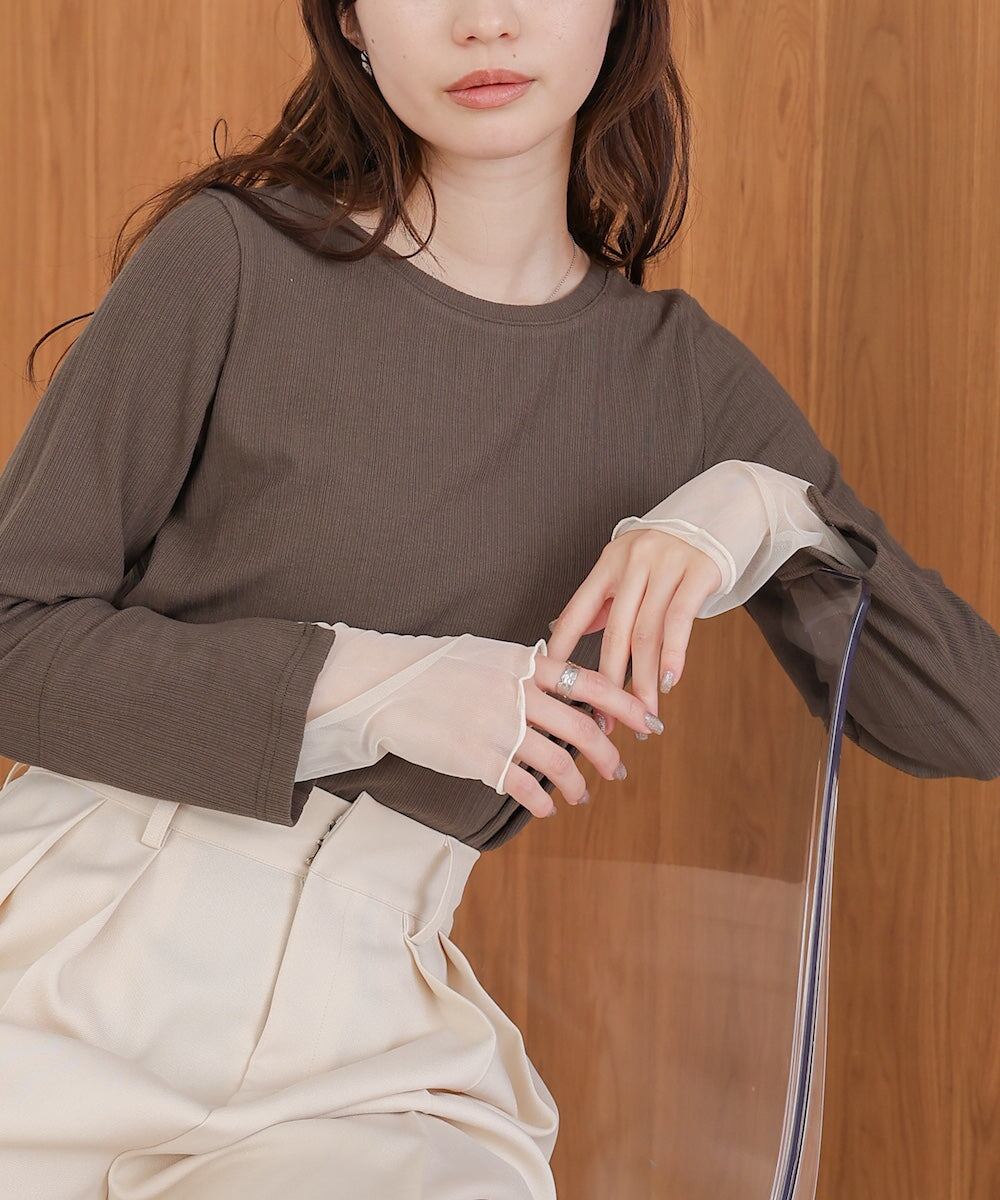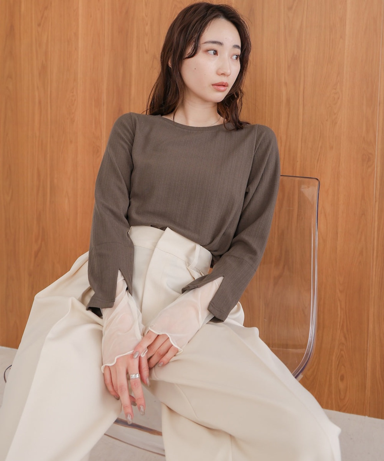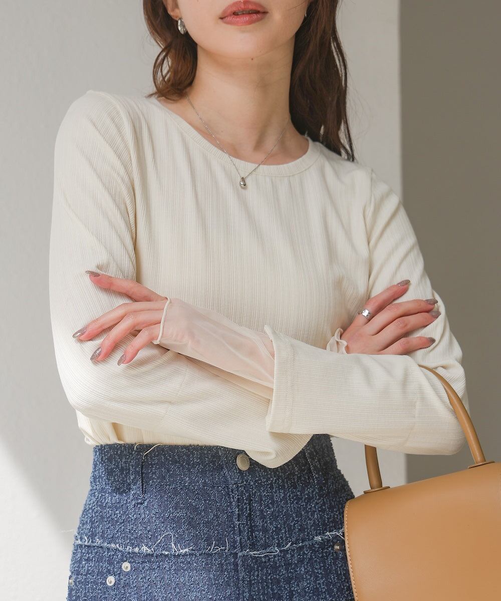 程よい厚みのリブトップスに、チュールのレイヤー見えディティールをドッキングしてBabらしい一癖デザインになりました!袖口の深めのスリットでさらに抜け感を出し、シンプルなクルーネックは襟の開き具合もコンパクトめなので 上品な雰囲気でお召し頂けます。ボディラインを強調しないサイズ感が大人女子にうれしい1枚です。