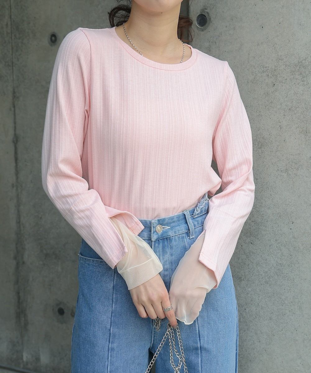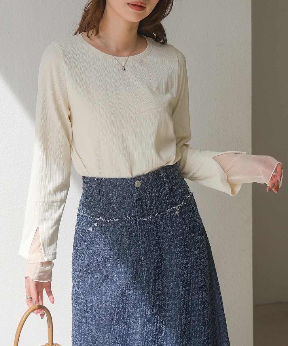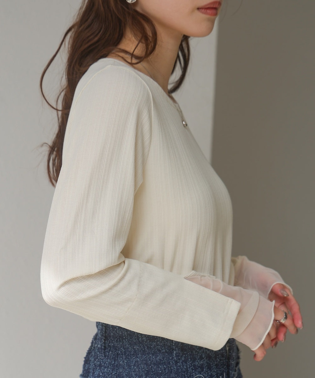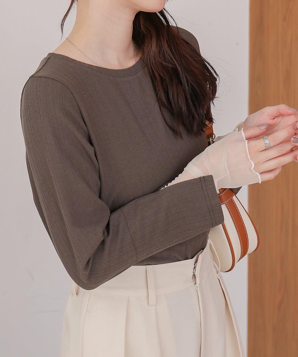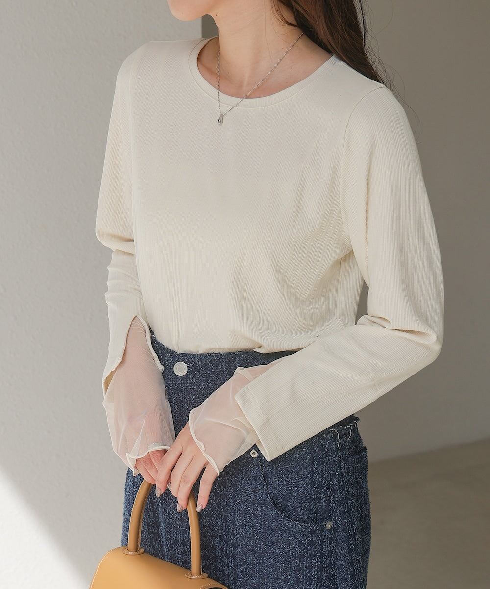 程よい厚みのリブトップスに、チュールのレイヤー見えディティールをドッキングしてBabらしい一癖デザインになりました!袖口の深めのスリットでさらに抜け感を出し、シンプルなクルーネックは襟の開き具合もコンパクトめなので 上品な雰囲気でお召し頂けます。ボディラインを強調しないサイズ感が大人女子にうれしい1枚です。