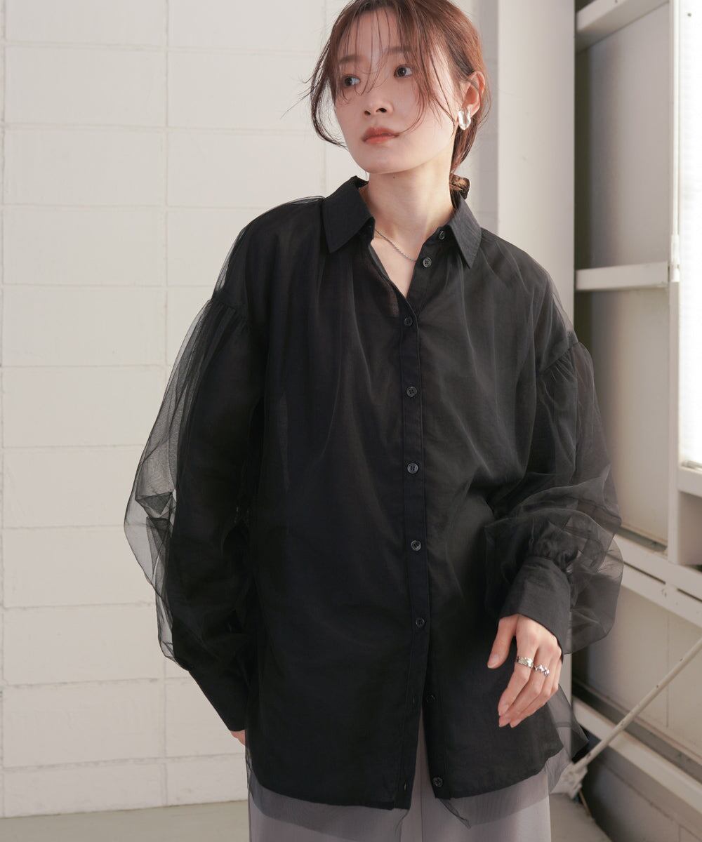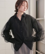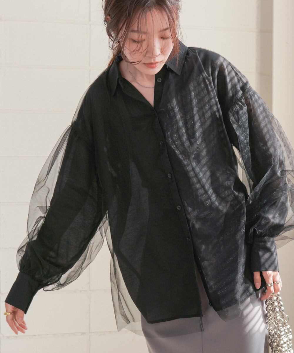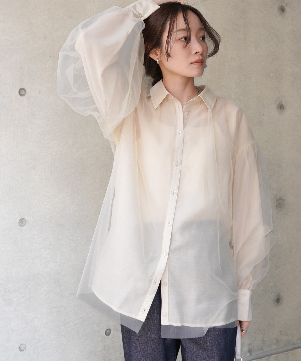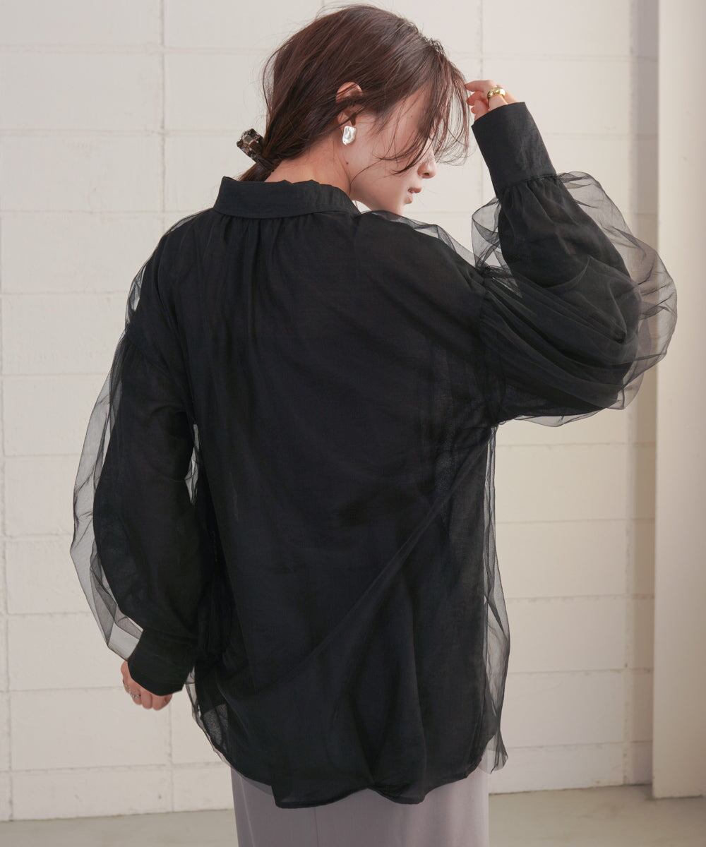 シアー生地にチュールを重ねたクラッシックな雰囲気のシアーシャツ。襟元・袖に入ったギャザーが女性らしく、 お出かけスタイルにぴったりなアイテム。肌やインナーが程よく透けるシアー生地が春夏のコーデにアクセントをつける、シーズンムード高まる1枚です。