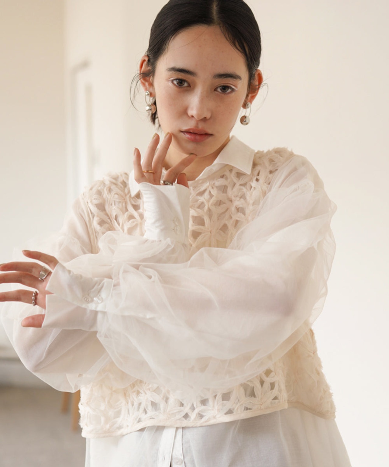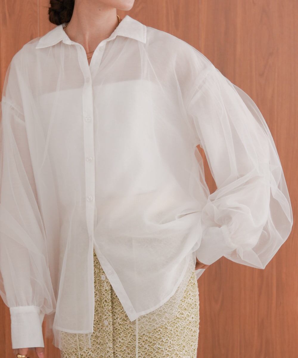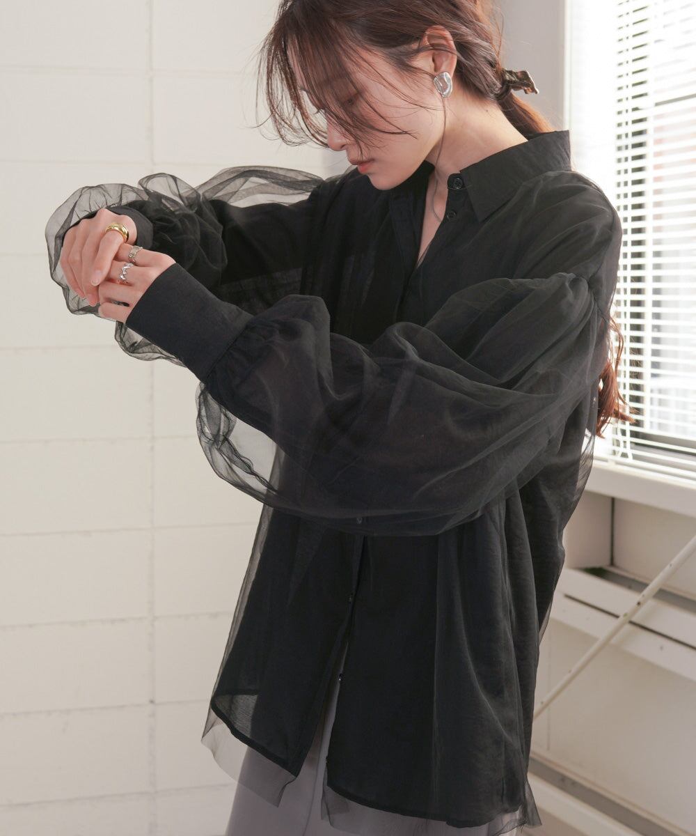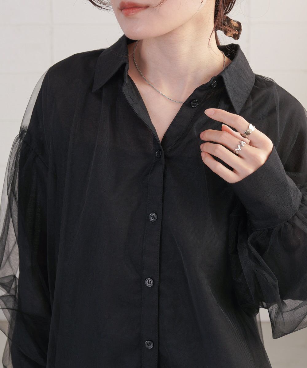 シアー生地にチュールを重ねたクラッシックな雰囲気のシアーシャツ。襟元・袖に入ったギャザーが女性らしく、 お出かけスタイルにぴったりなアイテム。肌やインナーが程よく透けるシアー生地が春夏のコーデにアクセントをつける、シーズンムード高まる1枚です。