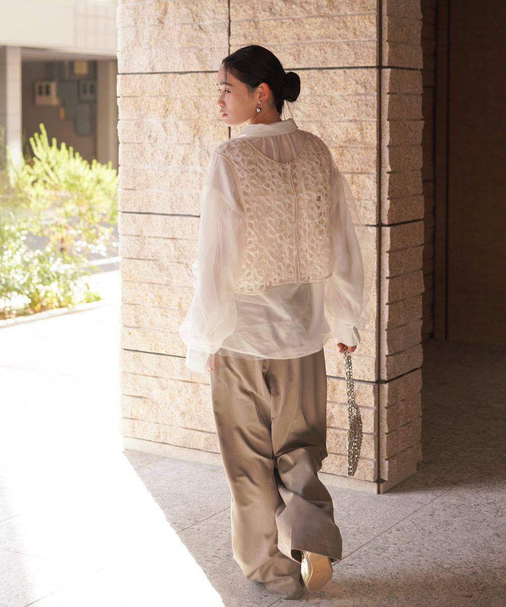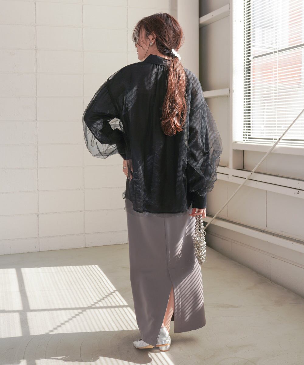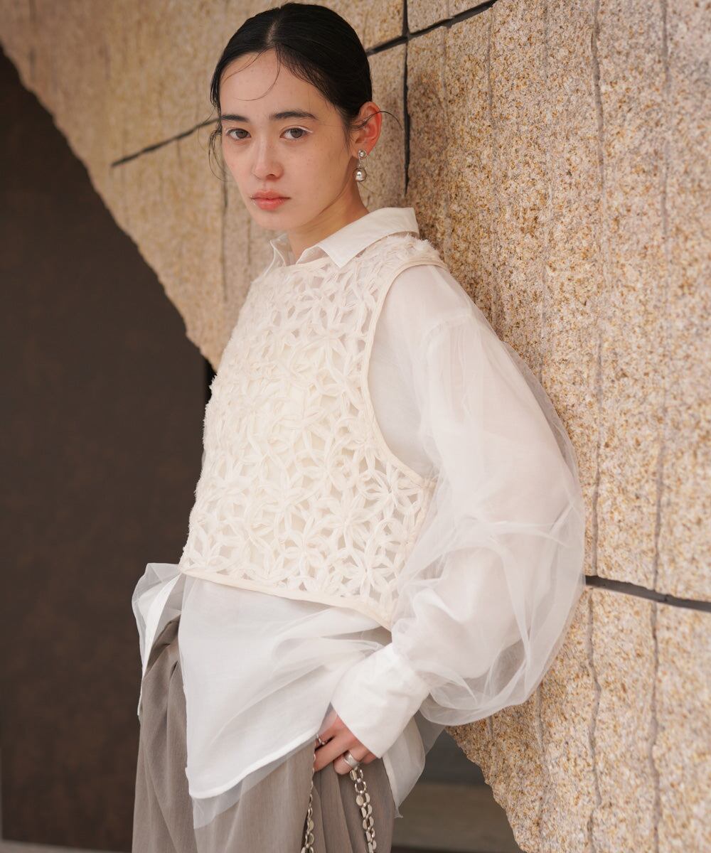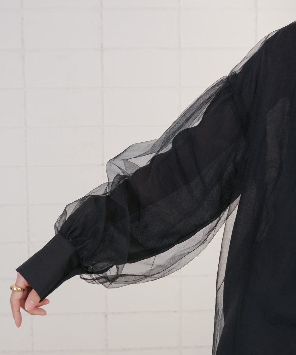 シアー生地にチュールを重ねたクラッシックな雰囲気のシアーシャツ。襟元・袖に入ったギャザーが女性らしく、 お出かけスタイルにぴったりなアイテム。肌やインナーが程よく透けるシアー生地が春夏のコーデにアクセントをつける、シーズンムード高まる1枚です。