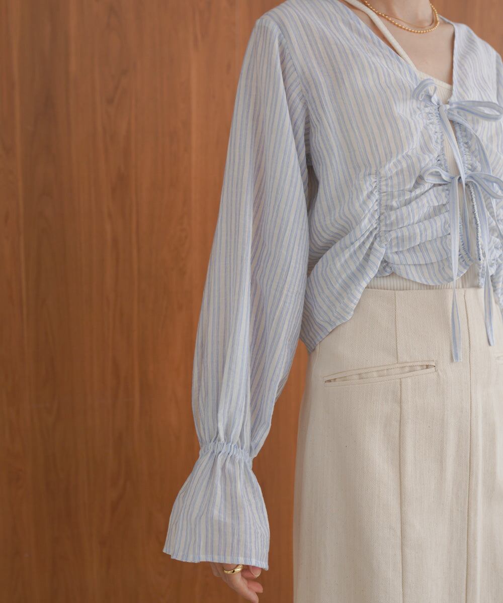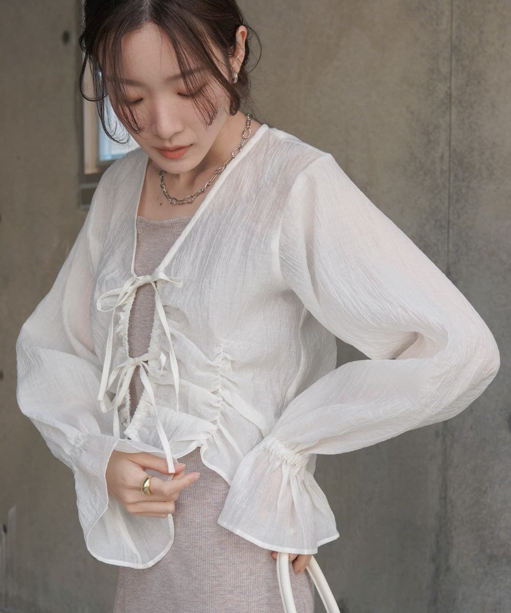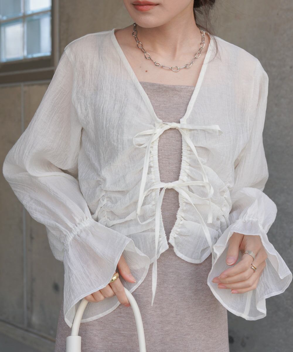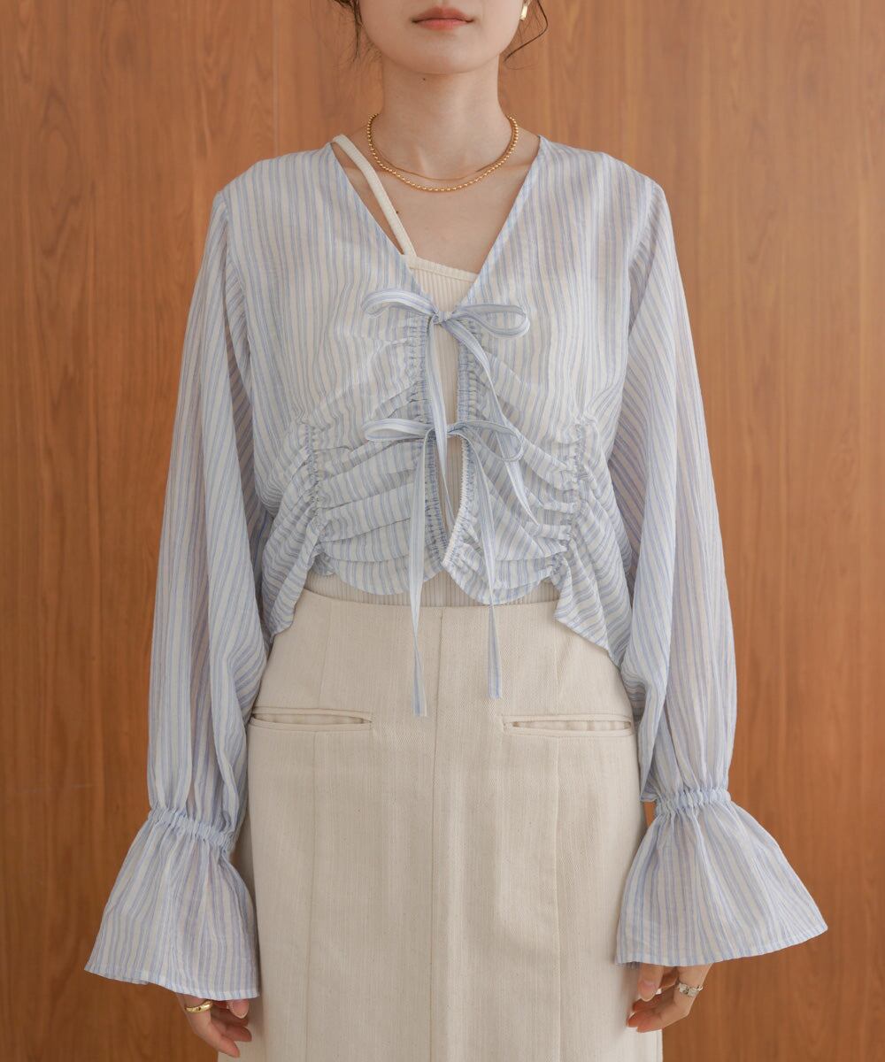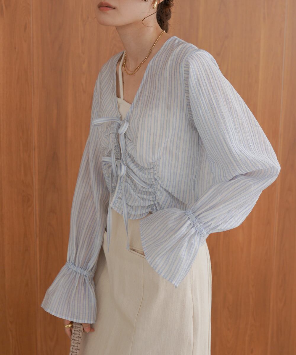 前のシャーリングとギャザーがトレンドライクなデザインブラウス。衿元はVネックになっているのでデコルテをすっきり見せてくれます。フロントのリボンは結んでも垂らしてもかわいく演出できます。コンパクトな丈感とお袖のギャザーのコントラストが相まってシンプルなインナーを重ねるだけでコーデが完成するアイテムです。