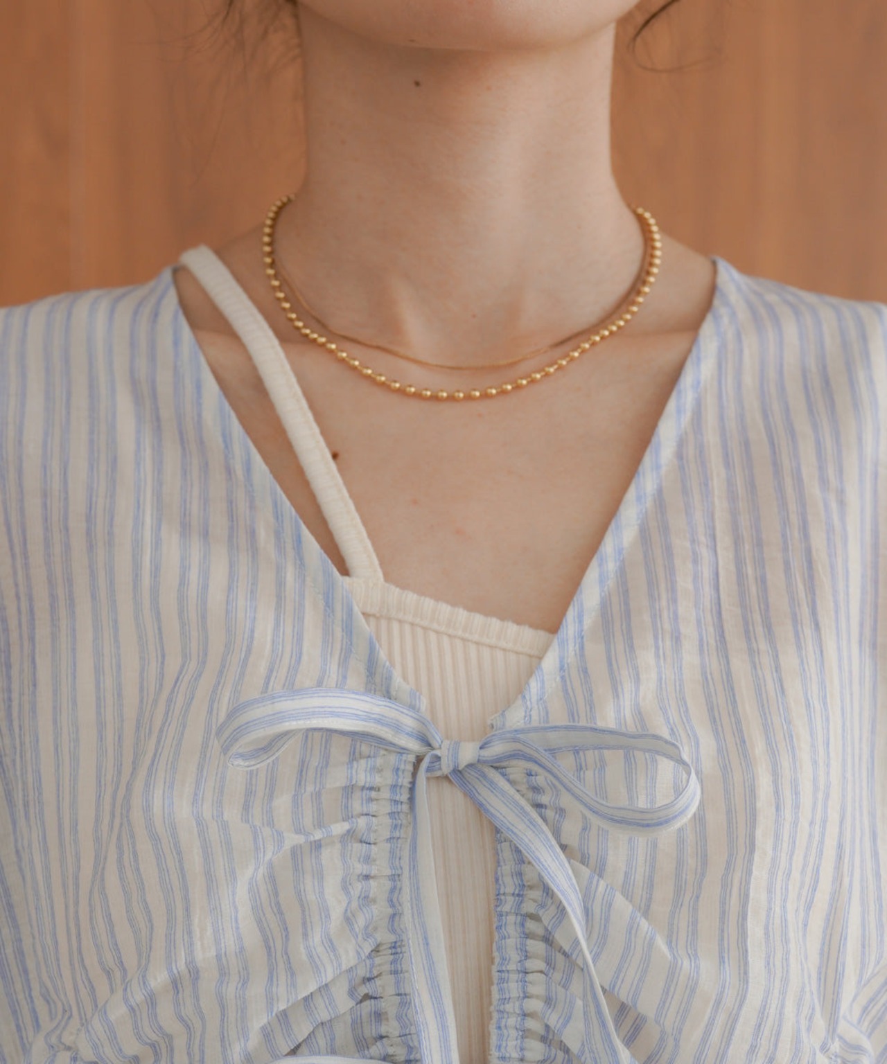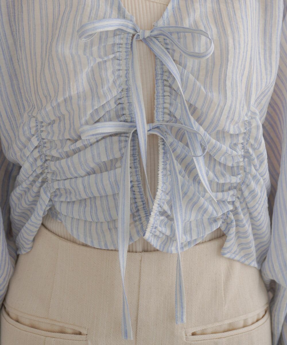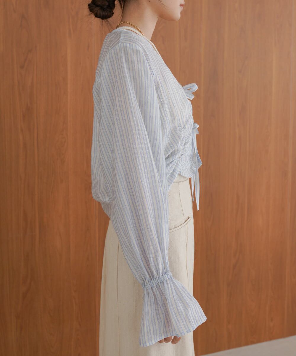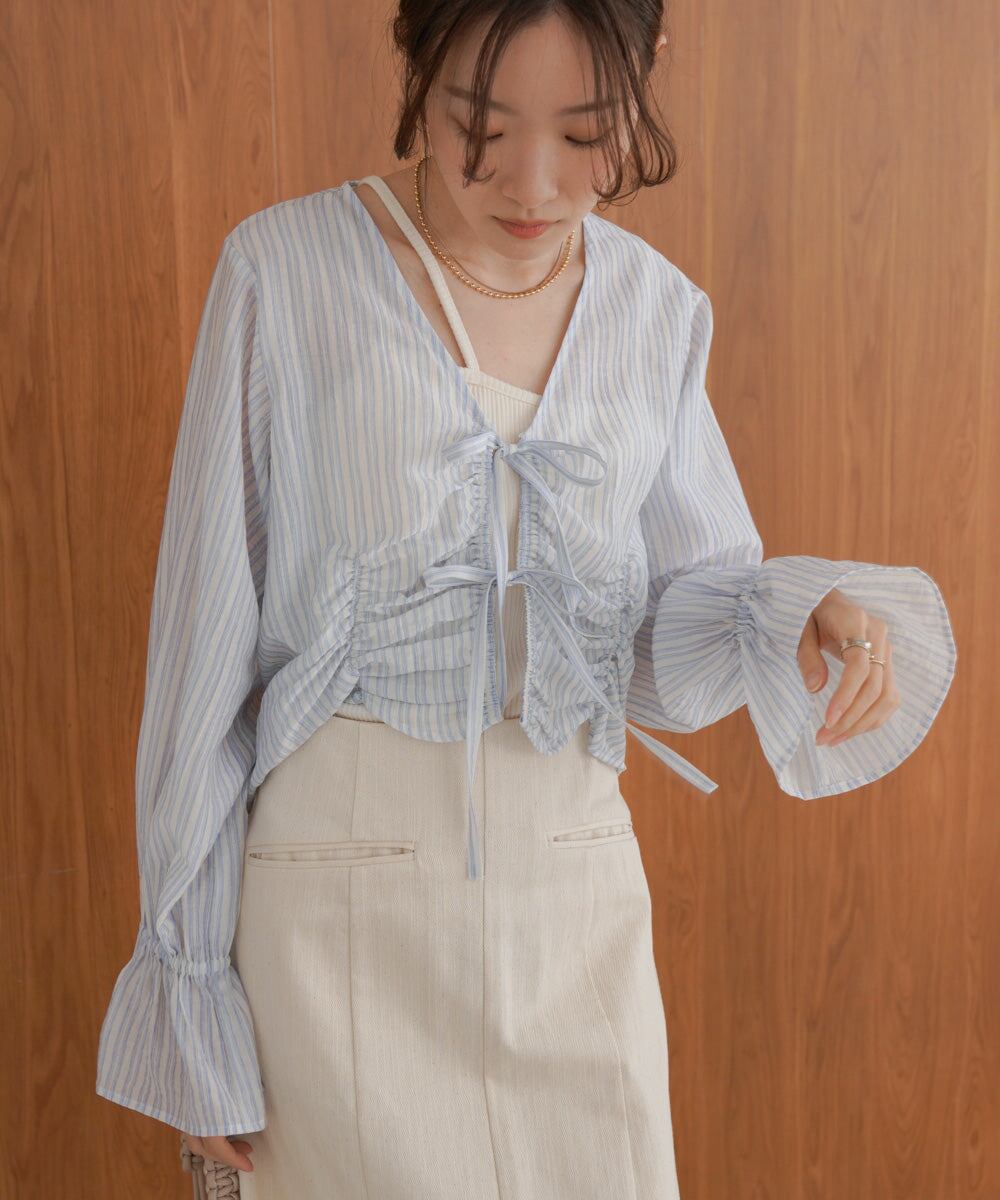 前のシャーリングとギャザーがトレンドライクなデザインブラウス。衿元はVネックになっているのでデコルテをすっきり見せてくれます。フロントのリボンは結んでも垂らしてもかわいく演出できます。コンパクトな丈感とお袖のギャザーのコントラストが相まってシンプルなインナーを重ねるだけでコーデが完成するアイテムです。