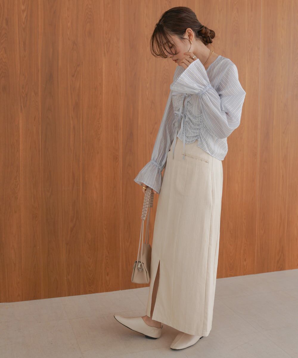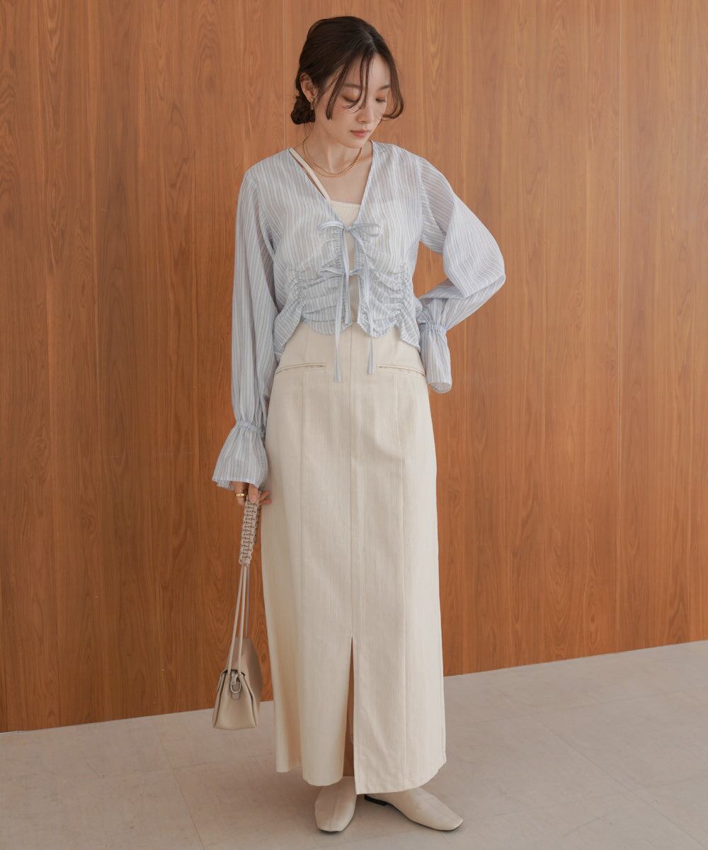 シャーリングやギャザーなどデザインが入っているのでボトムはシンプルにタイトスカートやスラックス合わせが◎またVネック開きなので羽織感覚でキャミワンピースなどと相和せてもご着用いただけます。