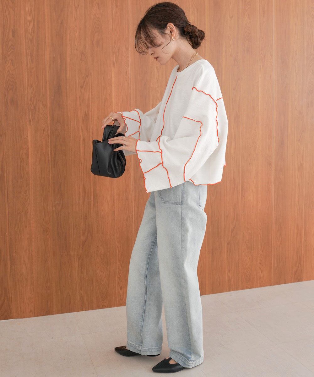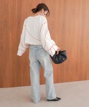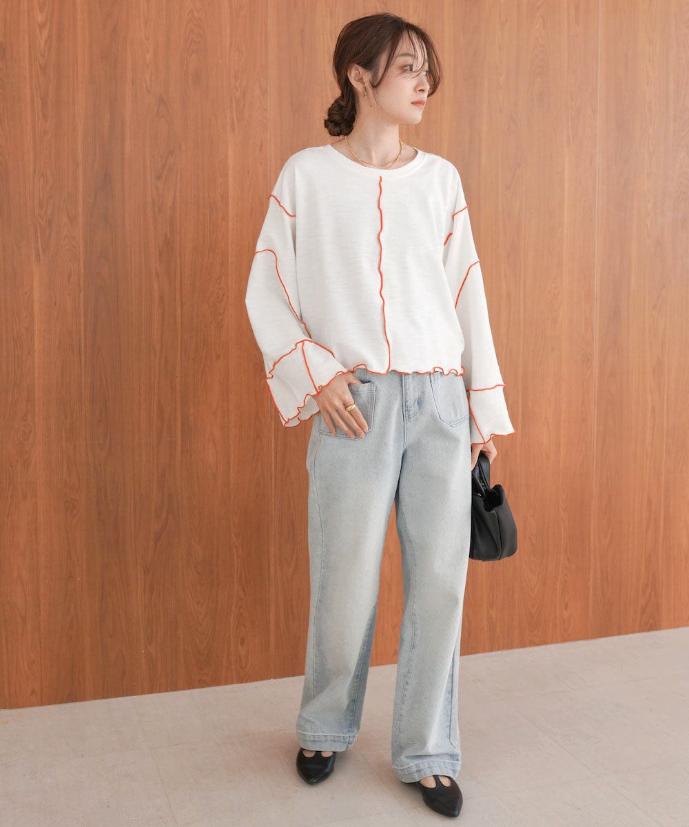 ショート丈なのでハイウエストデニムと合わせてスタイルアップさせるコーデがおすすめ。